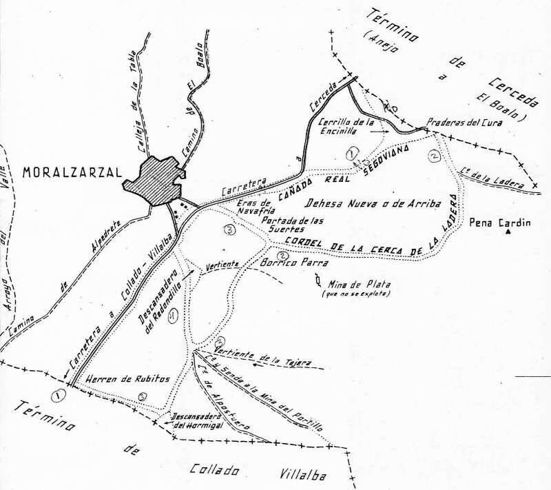 oficial efectuado en el año 1932. Entre las vías pecuarias, la cañada es el camino de los ganados de la trashumancia, usado para llevar los ganados de las dehesas de invierno a las de verano, y viceversa, y vamos a mostrar un croquis de las vías pecuarias del término de Moralzarzal para situarnos en el espacio sobre este estudio. ![]() En el Moral, la Cañada Real Segoviana, única cañada que pasa por nuestro pueblo, y según un documento del Ministerio de Agricultura relativo al término municipal de Moralzarzal en el que se describen las vías pecuarias de su territorio, como resultado del deslinde oficial efectuado en el año 1932, por Real Orden del 14 de marzo de 1931, se ve que entra en nuestro término, procedente de la zona de Cerceda, por el lugar que se llama "pradera del Cura", y a su derecha se encuentra el descansadero del llamado "Cerrillo de la Encinilla". En esa zona que está donde el terreno que fue usado como vertedero y está el campo de tiro junto a la cerca Rasa separado por una calle, es donde está ese descansadero, y en ese punto, a ese camino se junta el llamado "Cordel de la Cerca de la Ladera y de la Dehesa", vía pecuaria o camino que bordeando la Dehesa de Arriba, alcanza la Cañada. Ésta se dirige en dirección este a oeste, estando a su derecha según esa dirección, la finca llamada "Las Rozas", propiedad de D. Julián Fernández, y otros, hasta la carretera que desde Collado Villalba conduce a Manzanares el Real, y por la izquierda la "Dehesa Nueva de la Villa", continuando por las "Eras de Navafría", donde cruza el ferrocarril de las canteras del Berrocal, siguiendo por el sitio llamado "Bellas Vistas", y continuando por "Calle Larga o Calle Grande" por entre fincas particulares hasta el límite del término de Moralzarzal con Collado Villalba, donde se une con la vía pecuaria "Paso de Ganados de la Portada de las Suertes". Tiene este recorrido por el término del Moral una longitud de 4.400 metros, siendo variable su anchura, llegando a las noventa varas (75,22 metros) en la parte desde Cerceda hasta la zona de las Eras de Navafría, siendo desigual en la zona de Bellas Vistas, y en el resto, donde la Calle Grande, es menor de noventa varas. Esta vía pecuaria, se vio que era de las no eludibles en el llamado Proyecto de clasificación, y la zona que excediera la anchura legal, fuera enajenable, desde el término de Cerceda hasta las Eras de Navafría. El Ayuntamiento de Moralzarzal solicitó, posteriormente a la creación de ese Proyecto, junto con algunos ganaderos, que se desviara esa vía para evitar los perjuicios inherentes al tránsito de ganado desde Navafría hasta el término de Collado Villalba al estar construida la carretera M608 desde Manzanares hasta Villalba sobre la Cañada, y los ganados la usan, imponiéndoles sanciones a los ganaderos, y el Ministerio de Economía no aprobó dicha solicitud, dejándose para más adelante, que será cuando se ofrezcan suficientes terrenos contiguos para transitar el ganado, y así compensar por los que se declaren innecesarios en ese tramo de la Cañada. Y quedó amojonada la Cañada, señándose con mojones en 1913, viéndose seguidamente un mojón del descansadero de la Encinilla, justo donde desemboca el "Paso de Ganados de la Portada de las Suertes". ![]() Otra vía pecuaria de la que vamos a comentar en esta descripción, según el deslinde oficial efectuado en 1932, es el Cordel llamado "Cerca de la Ladera y de la Dehesa", que es una vía pastoril, según la legislación de la Mesta para los ganados trashumantes, que tiene una anchura de 45 varas, es decir, que es la la mitad de ancho de cañada. Esta vía comienza en la Cañada Real Segoviana en el límite de los términos de Cerceda y Moralzarzal, en el sitio frente a la zona llamada "Pradera del Cura", y se dirige de norte a sur subiendo por el camino que hay entre las fincas Dehesa Nueva que está a la derecha, propiedad del municipio del Moral, y la finca Cerca de la Ladera, de D. Eugenio Esteban Fernández, conocida como Monte del Marqués, que se encuentra al otro lado, y en la parte de más arriba había por lo alto atravesando un cable del teleférico, que antiguamente llevaba vagonetas con piedra desde la cantera de pórfido o gabarro de esa finca, en Peña Cardín, hasta el embarcadero que había al lado del helipuerto actual y del restaurante el Cenador de Salvador, en Navafría. Sigue esa vía en dirección oeste, y a la derecha se encuentra la Dehesa Nueva y a la izquierda las Suertes de Borrico Parra, hasta la fuente de Borrico Parra, llegando a donde hoy día se halla el depósito de agua de Herrenes y el camping. Así se llega hasta el sitio llamado Portada de Borrico Parra, donde se une otra vía pecuaria llamada Paso de Ganados de la Portada de las Suertes. Esta vía pecuaria titulada Cordel de la Cerca de la Ladera y de la Dehesa, se consideró necesaria en el Proyecto de Clasificación, teniendo una longitud de 2.800 metros. En la foto siguiente se distingue el pueblo desde la zona de la fuente de Borrico Parra en el Cordel de la Cerca de la Ladera y de la Dehesa, y se ve a la derecha la tapia de esta dicha Dehesa. ![]() La siguiente vía pecuaria de la que vamos tratar según ese Proyecto antedicho de 1932, es el Paso de Ganados de la Portada de las Suertes, que arranca de la Cañada en el sitio conocido como Eras de Navafría, donde hoy día está el supermercado HIBER, dirigiéndose de norte a sur, y teniendo a su derecha la Herrén de las Chaparras y el Ensancho del Redondillo, y a su izquierda la finca de los herederos de Doroteo González y la de Víctor Morato, llamadas Herrén del Reventón hasta la Portada de Borrico Parra, donde se une por la izquierda el llamado Cordel de la Cerca de la Ladera y de la Dehesa, cerca de la entrada al camping que hay hoy día. Aquí toma esta vía el Paso de Ganados de la Portada de las Suertes en dirección sur-oeste, teniendo a su derecha el Ensancho del Redondillo y a su