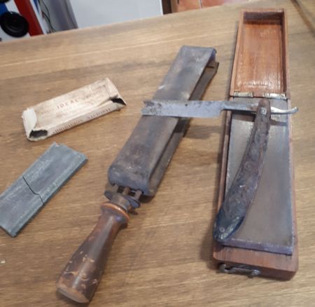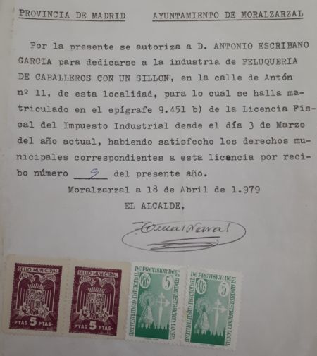 luego se trasladó a la misma calle pero al número 3. Antonio empezó a trabajar con 12 años en el colegio Joaquín García Morato de Barajas y dos años más tarde, ya teniendo 14, entró en la Academia de peluquería en la plaza de Santa Ana a donde iba desde su domicilio en la residencia de General Ricardos y de allí pasó al ejército del Aire. En nuestro pueblo abrió la peluquería en 1979 en lo que primitivamente era calle Antón número 11, luego travesía de Antón nº 6, y finalmente acabó en el nº 3 como se ha dicho en líneas anteriores. La autorización para apertura del local y el ejercicio de la profesión le fue concedida por el Ayuntamiento del Moral el día 18 de abril de 1979 y está firmada por el alcalde del pueblo que entonces era Tomás Navas Sanz. También dejó de usar la navaja y en su lugar usa un utensilio con la misma forma pero que le pone una cuchilla desechable de manera que la usa por cada servicio y una vez acabado, la cambia por otra nueva para el siguiente servicio. Conserva un aparato esterilizador donde metía las navajas para esterilizarlas y ahora suele meter las tijeras con el mismo fin de destruir los gérmenes patógenos. A continuación se puede ver la licencia concedida por el Ayuntamiento del pueblo a Antonio para ejercer su oficio en la peluquería de caballeros y donde también afeita al parroquiano que se lo pide. ![]() En 1980 se puso a trabajar de peluquero en el Cuartel General del Ejército del Aire, donde trabajaba por las mañanas compaginándolo con su trabajo en la peluquería del pueblo donde ejercía el oficio de peluquero por las tardes. Recibió una condecoración militar, la medalla del mérito aeronáutico con distintivo blanco concedida por la Sra. Ministra de Defensa Dª Carmen Chacón Piqueras el día 23 de junio de 2010 y recibida de manos del general jefe del Estado Mayor del Aire D. José Jiménez Ruiz. Seguidamente se muestra parte de los utensilios que conserva Antonio, entre ellos y muy curioso, un afilador de cuchillas, y el bote con algodón para limpiar por si se produce algún corte y también para empaparlo de agua y aplicarlo a la zona a repasar con la navaja; un asentador de cuero y sobre él se puede apreciar la cera para darle al cuero, y una barrita con una pasta a base de alumbre de potasio para en caso de corte aplicar para parar el flujo de sangre por si fuera inevitable y que también tiene efectos como bactericida. |
