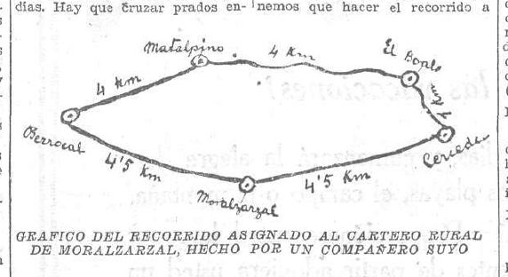 diversidad de servicios que hay en la actualidad, pero demos un repaso a la historia del pueblo para ver la evolución de la cartería en Moralzarzal. Antiguamente el oficio de cartero se subastaba, como podemos comprobar en documentos del Archivo municipal de Moralzarzal en los que se nos da información de lo dicho, y los hay desde los primeros años del siglo XIX. Otro dato encontrado es el de que así como en más de la primera mitad del siglo XX la correspondencia se llevaba a la estación del ferrocarril de Villalba, llamada Estación de Villalba del Guadarrama, antiguamente consta, en la documentación consultada, que se llevaba al pueblo de Guadarrama como punto de distribución y también se recogía allí, tanto la correspondencia oficial como la particular, pero veamos la información contenida en algunos de esos documentos que han llegado a nuestros días y que nos acercan al conocimiento de la historia del Moral, exponiéndolos cronológicamente. Del año 1809 existe un documento que se encabeza con Cartero y dice Remate por Servidumbre del cartero para el correo segun costumbre en Thoribio Belayos en Doscientos ochenta y seis r.s v.n no lo firmo por no saver a su ruego lo hizo un tgo = y se ve la firma de Ambrosio Albariño. Toribio Belaios era natural de un pueblo de Segovia llamado Encinilla, y según consta en los documentos del Archivo parroquial, perteneciente al obispado de Ávila, y se casó en Moral, siendo viudo de Ángela García, con la "cebollera" Jacinta Alonso López en mayo de 1806, siendo ésta vecina de Moral desde pequeña, pero nacida en Alpedrete, y el testigo Ambrosio Albariño Cubillo era de Becerril de la Sierra pero vecino de nuestro pueblo. Cinco años más tarde se celebró la subasta para el oficio de cartero y según se ve en otro documento del Archivo municipal que dice "Remate de cartero" y pone : En la Villa del Moral-Zarzal á veinte y seis de Diciembre de mil ochocientos catorce los S.es del Ayuntamiento, en la sala de el mandaron publicar el transporte de cartas desde este Pueblo al de Guadarrama todos los Domingos del año proximo de mil ochocientos quince; vajo el premio de un quarto en carta por llebarla, y otro por repartirla; y oyda la propuesta de doscientos y cincuenta r.s por Saturnino Solis de esta vecindad, fue admitida y no haviendo mejoras se dio el remate en el dho. Solis por la expresada cantidad de su propuesta: acepto el Remate y lo firma con el S.r Alc.de Presidente. Aparecen las firmas de Santos Molero, que era el Alcalde, Francisco González, el rematante Saturnino Solís y el secretario Josef González, mostrándose seguidamente parte de dicho documento con la parte final y las firmas. ![]() Siguieron los años y se efectuaron subastas para la adjudicación del trabajo de la realización de tareas de cartería, y en el año 1816 el mejor postor fue también Saturnino Solís por el precio de ciento ochenta y siete reales, siguiendo a finales de ese año la subasta del treinta y uno de diciembre que dice que los Señores del Ayuntamiento mandaron publicar la conducion de Cartas á Guad.ma mejorado en el Quarto por Roman Estebez de esta vecindad, y hecho entender a los concurrentes , se dio por el S.or Alcalde Presidente la primera palmada, y dadas suficientemente las dos siguientes, recayó en el Estebez por la cantidad de ciento cincuente y siete y medio r.s; lo consiente firmandolo, y aparece la firma de Román Estévez Benito, que es como se llamaba el rematante. A finales de 1817 fue Laureano Prados el que postó por la cartería, mejorando el remate efectuado en el mes de septiembre último y lo baja a ciento noventa y cinco reales, pero es a primeros del año siguiente cuando se celebró el remate definitivo y se lee : En la Villa del Moral á dos de En.o de mil ochocientos diez y ocho los S.res Alonso Mazarias, y Manuel Martin Molero Alcaldes ordinarios de ella subastan la conducion de Cartas á la Caja de Guadarrama y publicada sobre la mejora del Quarto, remato en el Proponente Laureano Prados por su mejora de ciento noventa y cinco r.s lo firma, apareciendo las firmas de uno de los alcalde, Alonso Mazarías, y el secretario Josef González. En el año 1818 se adjudicó el remate, para llevar la correspondencia en 1819, en Alejandro Balandín, vecino del pueblo en la cantidad de ciento ochenta y nueve reales, y en la celebrada el cuatro de enero de 1819 se adjudicó el remate en Laureano Prados por ciento cuarenta y un reales, con la condición de llevarlas a Guadarrama todos los domingos del año, también en el año 1820 se la llevó Laureano por ciento sesenta reales. A partir de 1820 hubo una serie de años en los que hubo remates para el puesto de cartero, que se adjudicaron por cortos periodos de tiempo, y así tenemos el del 31 de octubre de 1825, en que se le adjudicó a Rafael González por 180 reales de vellón, Andrés García se llevó el remate el 6 de enero de 1825 por 135 reales, y el 7 de abril de 1827 se adjudicó a Juan Balandín. El día 6 de enero de 1828 y el mismo día y mes de 1831 se adjudicó a Castor Balandín por 99 y 88 reales respectivamente, siendo el remate del 4 de enero de 1929 para Gregorio Domínguez. Hubo tres años seguidos en que se le adjudicó a Antonio Muñoz, el del 6 de enero de 1832, el 14 de enero de 1833 y el del 14 de enero de 1834 por 188 reales, 220 y 185 cada año de los dichos, y Juan Prados se llevó el remate del 6 de enero de 1841 y el del 9 de enero de 1842, por 99 reales y 198 cada año. El día diez de enero de 1847 hubo reunión de los señores que componen el Ayuntamiento Constitucional de esta villa y varios vecinos para el Remate de la conducion de la Correspondencia, siendo el vecino Manuel Sepúlveda el que se obligó a cumplir con ese trabajo de llevar la correspondencia a Guadarrama por cuatrocientos reales, pero debiendo ir tres día a la semana, miércoles, viernes y domingo y si hubiera necesidad, otro día fuera de los marcados, que lo admitió. 