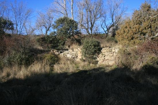 dos fotos que siguen. Continuando, se llega a una zona con abundante vegetación, sobre todo de hierba bastante alta y tupida, que oculta los agujeros que hay en el terreno, y los que se acerquen por allí, quedan advertidos de que tengan cuidado para no caer en uno de esos hoyos o mejor dicho, no meter el pie en algún agujero, ya que no se ven, y a mí me pasó y casi se me partió una pierna, pero afortunadamente no me pasó mas que el susto y un dolor pasajero. Siguiendo la tubería, que ya no aparece mas que en algún tramo del muro que la soporta, y después de pasar la zona antedicha de hierba tan espesa y alta, se ve por donde iba, al ver el muro de piedra que la soportaba, como se muestra en la foto de la derecha de las dos que son mostradas a continuación. |