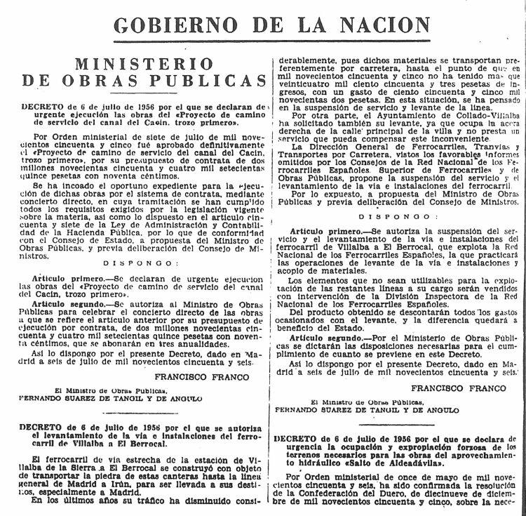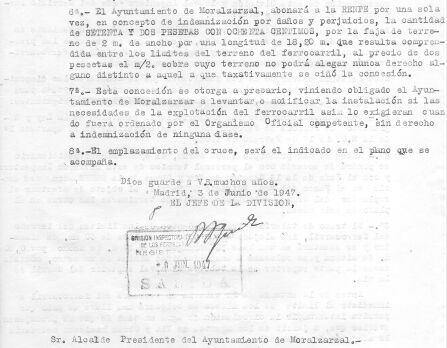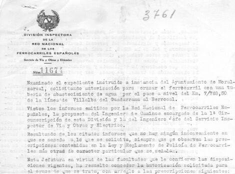 ![]() Como otro recuerdo fotográfico, se muestra seguidamente esta foto de 1953 donde aparece el Sr. Zárate (mi padre), a la izquierda de la foto con su amigo Esteban Hernández sobre la línea férrea a su paso por donde están hoy las casas de promoción municipal y la urbanización La Ermita, lo que es hoy día la calle Vía del Berrocal. ![]() En la foto que sigue se ve a la izquierda a Eladio Hernando posando en el Berrocal junto a la máquina del tren con sus hijos Carlos y Enrique y otras dos personas, el maquinista Sr. Manolo y el fogonero Sr. Peña. ![]() Un documento curioso, también relacionado con el ferrocarril del Berrocal, es el que corresponde a la solicitud hecha por el Ayto. de Moralzarzal a la empresa del ferrocarril, que ya había pasado de Ferrocarriles del Norte a depender de la Red Nacional de Ferrocarriles Españoles (RENFE), para pasar una tubería de abastecimiento de agua, y en el escrito de contestación se dice que se accede a la petición siempre que se cumplan unos requisitos, como que el Ayuntamiento se pondrá de acuerdo con el personal técnico de la División Inspectora y con el Jefe de 1ª Sección de Via y Obras de la RENFE y que el tramo de la tubería a instalar dentro de los límites del terreno del ferrocarril, irá alojado en un tubo de uralita de 60 m/m de diámetro y se asentará en una base de hormigón de 0,30 metros de ancho por 0,30 metros de altura y se colocará a una profundidad mínima de un metro, y antes de la entrada de la tubería en el terreno del ferrocarril se pondrá una llave de paso. Asímismo la apertura de zanjas, colocación de tuberías, relleno y apisonado del terreno se ejecutará con personal, materiales y herramientas que facilitará el Ayuntamiento de Moralzarzal bajo la vigilancia e inspección del personal facultativo de la División Inspectora y del de la RENFE, que designará un Inspector que estará al frente de estos trabajos. Los gastos serán de cuenta de la Corporación peticionaria, que anticipará la cantidad de trescientas pesetas y terminados los trabajos se efectuará la liquidación, devolviendo el sobrante o reclamando el exceso sobre la cantidad depositada. El Ayuntamiento abonará por una sola vez como indemnización por daños y perjuicios la cantidad setenta y dos pesetas con ochenta céntimos por la faja de terreno a razón de dos pesetas por metro cuadrado. Concluye el documento diciendo que el emplazamiento del cruce será el indicado en el plano que se acompaña, fechado el 3 de junio de 1947, mostrándose seguidamente parte de ese documento, época en la que el alcalde de Moralzarzal era Manuel López Antuñano. |