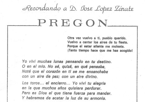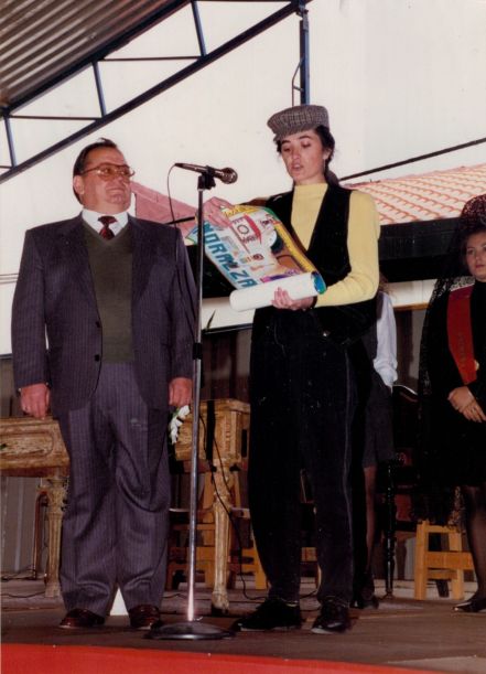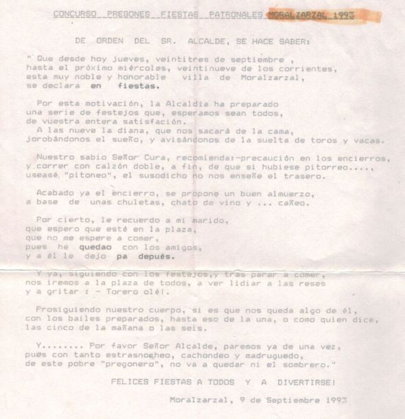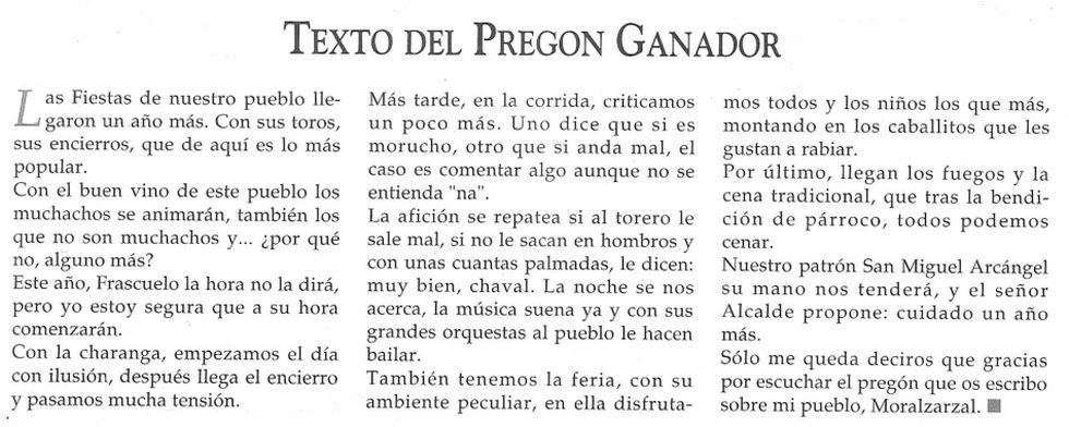 | Años más cercanos a nuestra época, se hizo realidad una novedad en las fiestas patronales, que fue la implantación del pregón seleccionado de entre los que se presentaban a concurso, organizado por la concejalía de Cultura, el cual daba tres premios, al pregón ganador y a los dos siguientes. El premio consistía en una suma importante de dinero y además la persona que ganaba el primer premio tenía el honor de leerlo durante los actos del primer día de la fiesta. Es curioso recordar que hubo una persona en este pueblo que ganó en tres ocasiones el concurso, que fue en los años 1988, 1989 y 1993, siendo la persona que redactó los pregones María Fernanda Gutiérrez de Diego (conocida el el pueblo como Mari Fe), y se muestra seguidamente aquí abajo, a la izquierda, el pregón que escribió Mari Fe, y a la derecha se la ve leyéndolo estando a su lado el alcalde en aquellas fechas, Narciso López González, y detrás una de las "misses". |