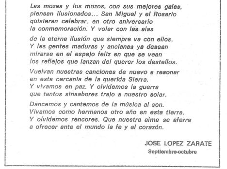Hay un detalle curioso relativo a los gastos de los oficios religiosos de las fiestas, y es que corrían a cargo del Ayuntamiento, tanto en las fiestas patronales como en otras celebraciones tales como eran los de la misa de la fiesta de San Sebastián o fiesta de la "luminaria", y la misa celebrada con motivo de la fiesta de San Roque, costumbre que ya desapareció de las celebraciones de este pueblo, y como ejemplos, en 1901 consta en acta de la sesión celebrada en el Ayuntamiento el día 18 de enero, que se encarga al Sr. Cura la función religiosa para la fiesta de la luminaria. Y como otros ejemplos, en la sesión celebrada el día 12 de agosto de 1905 se dice que se encarga al cura la función religiosa de costumbre, del día de San Roque, que como votiva de Villa satisface anualmente el Ayuntamiento, y en acta del 27 de julio de 1919 se acordó la celebración de la fiesta de San Roque, que al ser votiva de la Villa, haya función religiosa. Y como ejemplo de los festejos celebrados en tiempos más modernos con ocasión de las fiestas patronales, se puede ver en el enlace siguiente una muestra de los actos del año 2009. Hace bastantes años no se daba el pregón de las fiestas, simplemente el alcalde hacía un "saluda", pero recuerdo que en el año 1979, el párroco de entonces, D. Francisco Lomillos Lobo, conocido en el pueblo como Don Paco, el viernes 28 de septiembre leyó una poesía que escribió mi padre, y lo hizo a título de pregón y como recordatorio al poeta autor de esa poesía, fallecido en el mes de julio de ese año, pregón que se muestra bajo estas líneas, sacado del folleto editado para las fiestas de ese 1979. |