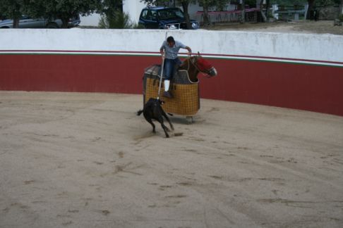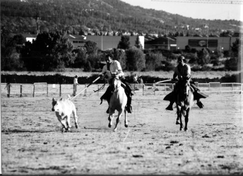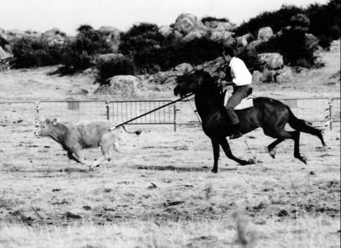 normalmente a caballo y como se ha dicho, ayudado con la garrocha. La garrocha es una vara normalmente empleada para picar toros, de cuatro metros de largo, de grueso unos cinco centímetros y terminada en una punta de acero de tres filos, llamada puya, sujeta en el extremo por donde se presenta al animal, que se emplea especialmente en el acoso y derribo de reses bravas y en faenas camperas de apartado y conducción de ganado vacuno, y no debe llegar a dos centímetros para que apenas coja piel. El acoso y derribo es una de las faenas que forman parte de la tauromaquia y se hace en el campo como paso previo a otras faenas, y tradicionalmente se produce en campo abierto, aunque a veces se hace como deporte o entretenimiento. La historia nos dice que es muy antigua y a lo largo de los tiempos prácticamente no ha cambiado. Se realiza a caballo con animales que estén bien domados, que han de ser ligeros y ágiles y con su velocidad darán la necesaria violencia para el empujón, y han de tener fuerza ya que el derribar a la res, es el caballo el que empuja, pues el jinete fundamentalmente sujeta la garrocha con la que aplicándola en la parte más alta y trasera de la grupa de la res la desequilibra para que hacerla caer. Normalmente son dos jinetes los que participan en el acoso, lo que se conoce como collera, y el que acosa pero no derriba, conocido como amparador tiene como misión hacer que la res haga un sesgo, tuerza a un lado, para que el derribador intervenga y haga su trabajo de hacer que la res caiga a tierra. Seguidamente se muestra un par de fotos en las que se ve a un jinete acosando a una becerra y en en la otra se ve como va la pareja de caballistas o como se ha dicho la collera, tratándose de José Miguel González Navarro practicando el acoso en la zona de los Praderones. |