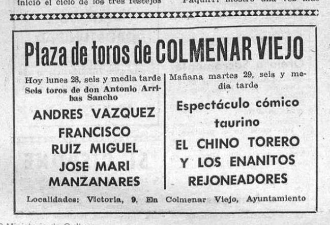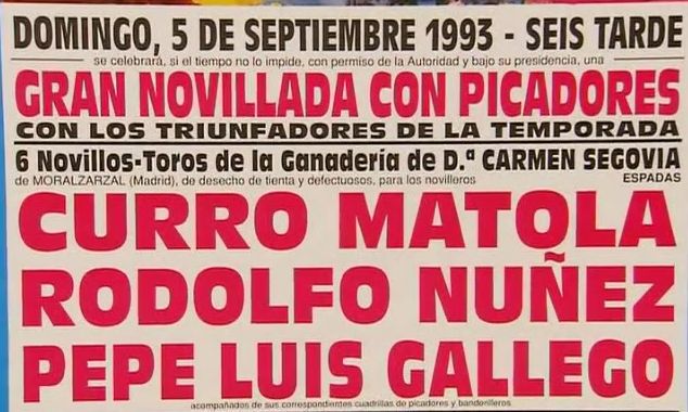 los 88 animales de casta Torrestrella que le compraron. Su ganado pasta en las fincas que tiene este matrimonio en los pueblo de Moralzarzal, El Boalo, Guadalix y Manzanares el Real, llamándose esas finca Los Linarejos, Navalapuerta, el Quejigal y el Pradazo. En la hermosa finca Navalapuerta de 100 hectáreas, esta ganadería tenía 60 vacas y un semental, y entre el personal que había a su servicio estaban el mayoral Antonio Leiro Muñiz y como vaqueros Isidro Nieto Reguera y José Antonio Pérez Lobillo, y el primer semental que tuvieron de Torrestrella tenía el nombre de "Caracolillo", que era de 1993 y estaba marcado con el número 103 y el 93 correspondiente al año, y según Felipe García, consorte de la ganadera Carmen Segovia, fue fundamental para la consolidación de la ganadería. La ganadería de esta "cebollera" se dio a conocer en una novillada celebrada en la plaza de toros de Las Ventas de Madrid el domingo día 5 de septiembre de 1993, empezando a contar su antigüedad con su hierro, y en esa novillada actuaron de matadores Curro Matola, Rodolfo Nuñez y Pepe Luis Gallego. Su hierro es una estrella de cinco puntas que según cuenta Felipe, corresponde a los cinco miembros de la familia, dos del matrimonio y los otros tres por sus hijas Almudena, Carmen y su hijo Nacho, y dentro está la S del apellido primero de la ganadera, Segovia, y una cruz. Una corrida que llenó de satisfación a Carmen y Felipe así como a todos los aficionados y vecinos de Moralzarzal fue la celebrada con ocasión de la inauguración de la plaza cubierta del pueblo, el Moral como decimos aquí. En esa corrida celebrada a las seis de la tarde del sábado día 24 de septiembre de 2005 participaron los espadas César Rincón, Enrique Ponce y Sebastián Castella. Pasada la feria de Madrid presentó una buena novillada en las nocturnas, que ofreció una oportunidad para que Oliva Soto cortara una oreja, y el martes día 13 de mayo de 2008 el ganado de Carmen debutó en la feria de San Isidro de Madrid y Diego Urdiales cortó una oreja en la corrida de este día que resultó muy buena. Diego Urdiales y Luis Bolívar triunfaron con ganado de Carmen en el festejo taurino que se celebró el día de la Comunidad de Madrid, el 2 de mayo de 2009, y en 2010 presentó buen ganado en la corrida goyesca celebrada en las Ventas el día de la Comunidad. Carmen Segovia vendió la ganadería a Antonio San Román, según ha confirmado Felipe García Gamella, marido de la ganadera y representante de la divisa. "Ha sido una decisión difícil pero obligada", dijo D. Felipe, quien subrayó: "No se ha debido a una causa concreta, es un cúmulo de factores. La situación del mercado y también los problemas de salud que llevo arrastrando, al final te empujan a tomar esa decisión". Según Aplausos, en manos de la familia continuará la finca Los Linarejos y los derechos del hierro. "Hemos vendido todo lo que nos quedaba que eran 70 vacas con su rastra. Entre erales, becerros y los animales que teníamos sin herrar, sumaban unas 60 cabezas más", describió minuciosamente Felipe García, que añadió: "Durante la última temporada nos hemos defendido bien y creo que la trayectoria que ha llevado la ganadería en este tiempo ha sido muy honesta. No estoy convencido de que haya sido una decisión acertada o equivocada. El tiempo lo dirá. Los derechos del hierro los mantenemos por si cambiasen las cosas pero lo veo muy difícil", puso de relieve el ganadero. Carmen Segovia formó su ganadería en 1989 con reses y sementales de Álvaro Domecq, con el hierro de Torrestrella. Seguidamente se muestra el cartel en la que se anunciaba la novillada de presentación celebrada el día 5 de septiembre de 1993 en las Ventas. ![]() Las fincas donde pasta su ganado son "Los Linarejos" en Moralzarzal, la "Dehesa del Quejigal" en Guadalix de la Sierra, en Manzanares el Real "El Pradazo", y en las fiestas de Pentecostés de la feria de Nimes del año 1994 llevó ganado el día 22 de mayo para la corrida ecuestre en la que participaron Joao Moura, Ginés Cartagena, Marie Sala y Aantonio Telles, y en Cáceres el año 1998 sus toros fueron lidiados por Curro Romero, José Tomás y Antonio Ferreras el día 30 de mayo con la celebración de la feria de San Fernando. Otro ganadero que ha tenido su ganado en terrenos de Moralzarzal ha sido Justo Leiro de Lema, vecino de la cercana localidad de Cerceda, que ha criado sus reses en la finca llamada Las Pilas de Abajo, y que las gentes del Moral conocemos como los Cercados del Indiano en recuerdo de Julián de Fuentes que fue su propietario, finca que está en la zona del Gamonal, y ahora la tiene su hijo Guillermo que a veces es ayudado por su hermano Ramón. También crian el ganado en la finca lindando con Moralzarzal, de la que le separa la calle de la Capellanía, finca llamada La Lozana, pegada a la Dehesa de Cerceda. Más arriba se ha hecho mención a una corrida que satisfizo mucho al matrimonio Carmen y Felipe, y fue en la inauguración de la plaza de toros cubierta de Moralzarzal que fue inaugurada el 23 de septiembre de 2005 por el Sr. alcalde de entonces D. José María Moreno Martín y la primera lidia tuvo lugar el día siguiente, 24 de septiembre, formando el cartel los diestros César Rincón, Enrique Ponce y Sebastián Castella, con toros de su ganadería, saliendo Ponce y Castella por la puerta grande y el primer toro en pisar el ruedo se llamó "Poco Nervio". Su fachada es de piedra granítica que está decorada con atractivos arcos en su parte alta, y destaca su puerta grande. Tiene una cubierta que está construida en malla espacial, disponiendo de apertura llamada de tipo párpado la cual abre la totalidad del ruedo y la parte superior de la cosntrucción que es la parte movible tiene la facultad de ser translúcida. La puerta grande es de granito y toda la plaza está rodeada alrededor de la fachada por una pérgola hecha a base de acero y vidrio. La superficie ronda los doce