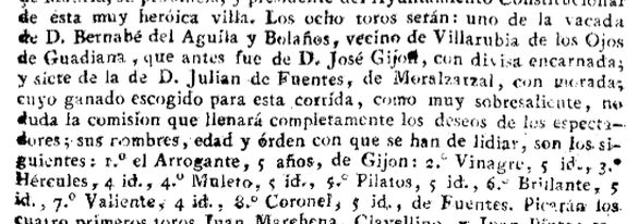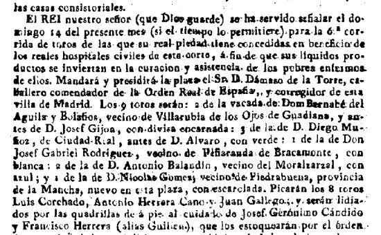 Pero además del ganado que pastaba en sus campos dedicado a la producción de carne y otro dedicado a los trabajos agrícolas y demás labores del campo así como al acarreo o carretería, en nuestro pueblo hay que destacar el ganado bravo, que es en las primeras décadas del siglo XIX cuando se consolidan los resultados de iniciativas del siglo anterior, por lo que en el Moral hay que hacer referencia a ganaderos de reses bravas que hicieron de la fiesta nacional el destino de la crianza de su ganado, con la dedicación, entrega y trabajo que eso lleva consigo, y también hay que aludir a todo lo relacionado con el ganado bravo dentro del arte de la lidia de toros, pero de los ganaderos de esa clase de ganado, una de las personas a la que tenemos que recordar de los primeros tiempos y desde que somos conscientes, es a Antonio Balandín, que fue uno de los ganaderos "cebolleros" del siglo XVIII, y expondremos algunos datos de este personaje. En el Diario de Madrid del día 29 de junio de 1811 se da la noticia de la corrida a celebrar en Madrid el día treinta de dicho mes, con nueve toros, de los que dos serán de la ganadería de D. Antonio Balandín, vecino de Moralzarzal, y se dice que los picarán con la mayor destreza y arrogancia los bien conocidos y acreditados Julián Diaz y Juan Vallesteros (alias Mameluco), los quales unidos con la lucida quadrilla de banderilleros .... En la prensa de la época se ve que hubo otras referencias a este vecino de nuestro pueblo, y así se puede leer en el Diario de Madrid del sábado día 13 de julio de 1811 que en el apartado de Noticias de Madrid se da el aviso de que el Rey, D. Fernando VII, se ha servido señalar el domingo día 14 (si el tiempo lo permitiere) para la 6ª corrida de toros de las que su real piedad tiene concedidas en beneficio de los reales hospitales civiles de esta corte, a fin de que sus liquidos productos se inviertan en la curacion y asistencia de los pobres enfermos de ellos, y de los nueve toros que se lidiarán, 2 serán de D. Antonio Balandín, vecino de Moralzarzal, con divisa azul, y además se lee que picarán los ocho toros Luis Corbacho, Antonio Herrera Cano y Juan Gallego, y serán lidiados por las quadrillas de a pie .... Se llama divisa al lazo de cintas de colores con que se distinguen los toros de cada ganadero, las cuales van sujetas a un arpón que se clava al toro en el cerviguillo, momentos antes de soltarle de los chiqueros para ser lidiado, siendo el cerviguillo la parte exterior de la cerviz, gruesa y abultada en la parte dorsal del cuello. En otros periódicos de esa época también se hace referencia a este vecino de nuestro pueblo, y así, en el Diario de Madrid del domingo día 28 de septiembre de ese mismo año, en el apartado de Noticias particulares de Madrid se da el aviso de que el Rey ha señalado el domingo día 29 para la primera corrida de novillos embolados concedida en beneficio de los reales hospitales civiles, o lo que es equivalente hoy día a la corrida de Beneficencia, que dará principio con 4 famosos toros embolados de la distinguida vacada de D. Antonio Balandín, vecino de Moralzarzal. Y seguidamente se muestra parte del Diario de Madrid del día 13 de julio de 1811, donde se ve lo que se ha expuesto líneas arriba. ![]() Considerando las fechas en las que se celebraron esos festejos taurinos, año 1811, el ganadero tuvo que ser Antonio Balandín Rubio, el cual nació en febrero de 1776, que era hijo de Pedro Balandín Guillén, nacido en 1733, y de Rufina Rubio, y nieto de Antonio Balandín y Antonia Guillén. En otra página de este sitio web se habla de Antonio Balandín Rubio que compró el terreno de las eras de la Ascensión, en pública subasta celebrada el día 31 de marzo de 1811 en la que se subastaron dichas eras. Estuvo casado con Sebera Sepúlveda de Viñas, matrimonio celebrado en Moral en 1806, enviudó y se casó con María Muñoz, jóven de Collado Villalba, volvió a quedarse viudo y en 1817 se casó con la "cebollera" Josefa Mazarías Morales. Del primer matrimonio no constan hijos, del segundo nacieron María (1810), Manuel (1812), Paulino (1814) y Francisca (1815) Balandín Muñoz. De su tercer matrimonio nacieron Valentín (1818), Víctor (1819), Luciano y Severo (1826) mellizos, y Evarista (1826) Balandín Mazarías. Además, en los libros de la parroquia, en las actas de bautizo de sus nietos María, Eusebia y Francisco Balandín Prados, consta que son hijos de Manuel Balandín Muñoz y de Eugenia Prados Melgar, y se dice que el padre era "baquero", siendo el padre, Manuel Balandín, el hijo de Antonio y María como se ha dicho sobre estas líneas, nieto de Antonio Balandín Rubio, y se transmitió el oficio de dedicarse al ganado. Antonio Balandín, falleció en julio de 1856 con 82 años, viudo de Josefa Mazarías y recibió penitencia, viático y extremaunción. Había hecho testamento ante D. Ángel González Solís y mandó que el sobrante de la renta de la casa que habita su hijo Paulino correspondiente al presente año, se invierta en beneficio de su alma. Los funerales de costumbre se hicieran a costa de su amo, Sr. de Fuentes, que es lo que se puede leer en el acta de defunción. Otra de las figuras dedicadas al mundo del toro de lidia en nuestro pueblo fue Don Julián de Fuentes López, personaje nacido en el pueblo riojano de Valgañón, muy cercano a Ezcaray, el día 17 de febrero de 1760, y sus padres fueron Anastasio de Fuentes y Porres y Martina López Huerta, siendo el mayor de los hijos del matrimonio, y vino a Madrid siendo jovencito con sus tres hermanos, viviendo en un piso alquilado en la calle de la Montera, pero no pasaron cuatro años cuando se compró una casa cerca de la puerta del Sol. D. Julián Fuentes tenía una serie de reses de media casta con las que realizaba trabajos agrícolas en los terrenos que tenía en Moralzarzal, y se le cruzó la idea de fundar en nuestro pueblo una ganadería brava, adquiriendo para ello, dur