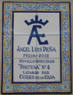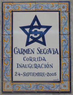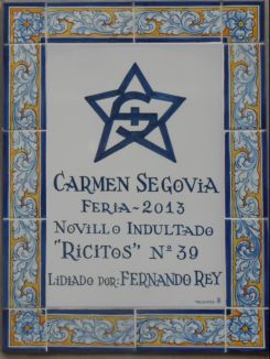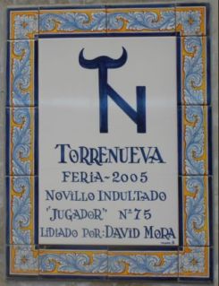 En el callejón de la plaza hay recuerdos de hechos notables acaecidos en el coso "cebollero" relativos a la lidia, realizados en cerámica, concretamente en azulejos, y entre otros, uno recuerda al novillo indultado de Torrenueva de nombre "Jugador" que fue toreado por David Mora en las fiestas de 2005, y otro está como recuerdo del 6º toro de Victorino presentado en Moral el 2 de septiembre de 2006 que fue muy aplaudido y al que se le dio la vuelta al ruedo. Otro recordatorio corresponde al novillo del ganadero Ángel Luis Peña indultado en la feria de las fiestas de 2012 que fue lidiado por Curro de la Casa el día 24 de septiembre y le acompañaron Mario Alcalde y Sebastián Ritter. Un novillo indultado en la feria de las fiestas de 2013 de la ganadería de Carmen, fue lidiado el día 29 de septiembre en la novillada con picadores en la que intervinieron Mario Diéguez, Antonio Puerta y Fernando Rey, siendo este último el que toreó a "Ricitos", que también tiene dedicado un azulejo en el callejón. En el recuerdo de la inauguración aparece la estrella del hierro de la ganadería de Carmen que se he mencionado líneas arriba, con los cinco puntos de los vértices que representan los cinco miembros de la familia que eran cuando se eligió el hierro, y el novillo indultado de Torrenueva en la feria de 2005, "Jugador", se lidió el día 3 de octubre en la novillada de novillos-toros en la que torearon Paco Ureña, Alejandro Morillas y David Mora. La divisa de la ganadería de Carmen Segovia tiene los colores que resultaron de la elección que hicieron sus hijos, de manera que Almudena, la mayor, eligió el blanco, Carmen dijo que el verde y Nacho escogió el color rojo. A continuación se muestran cuatro fotos con los azulejos que nos recuerdan la fecha de inauguración de la plaza y el indulto concedido al novillo "Jugador" de ganadería de Torrenueva, al de Ángel Luis Peña llamado "Fortuna" y a "Ricitos" de Carmen. |