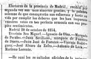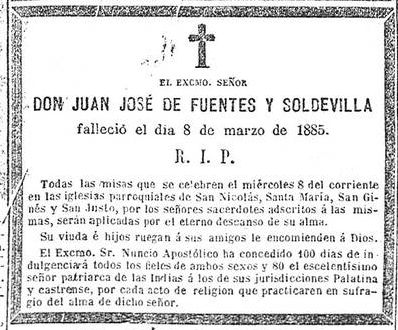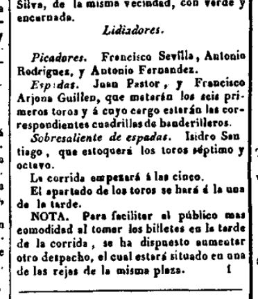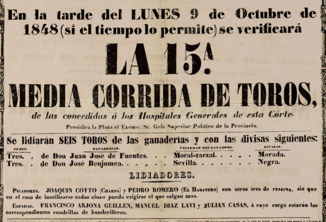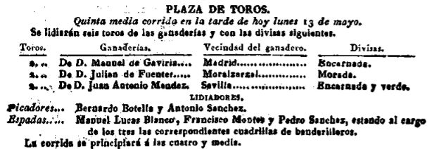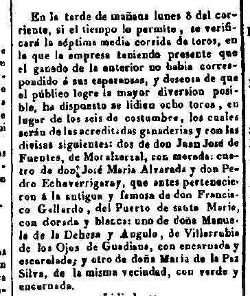 En 1842 su ganado participó en una corrida en la que se lidiaron toros de 8 ganaderías distintas, y otro ejemplo lo tenemos en el anuncio del Diario de Avisos de Madrid del 6 de octubre de 1844 en el que se dice que en la tarde de este domingo día 6, se verificará la decimo octava media corrida y última de este año, y como en la corrida anterior hubo mucha parte del público que no pudo entrar, se lidiarán en la presente 10 toros, 6 en plaza entera y cuatro en la división, habiendo en la plaza entera tres toros de D. Juan José de Fuentes, vecino de Moralzarzal con divisa morada. También en El Heraldo de Madrid de fecha 13 de octubre de 1844 se anuncia la media corrida para el día 15 de ocho toros, con dos de ellos de Juan José de Fuentes de Moralzarzal. Las corridas se hacían en plaza entera, es decir que no se partía el ruedo, o en división, que consistía en dividir el ruedo en dos partes. Esta modalidad estuvo de moda a finales del siglo XVIII y principios del XIX, por lo que se dividía el ruedo en dos partes iguales por medio de una valla hecha con maderas y en consonancia con la barrera del ruedo, y se lidiaba en las dos mitades a la vez, pero las cuadrillas más modernas toreaban en la mitad donde daba el sol y las más antiguas en donde daba la sombra. En El Espectador de fecha 18 de junio de 1845 se lee la crónica de la corrida y en ella se comenta la actuación de los tres toros de Juan José de Fuentes de los seis lidiados, el primero de ellos, de nombre Cachirulo, acometía bien y saltaba mejor, dando hachazos muy por alto, el cual tomó ocho varas y le pusieron tres pares de banderillas al recorte y una a media vuelta. Lo mató Cúchares de una baja a volapié. Su segundo, Garboso, salió y solamente tenía habilidad para huir, saltó tres veces la barrera, tomó diez varas, mató dos caballos y le pusieron tres pares de rehiletes a media vuelta y lo mató el Chiclanero de un mete y saca a volapié después de varios pinchazos. Su tercer toro, Rabilargo, tenía ganas de camorra y Cúchares lo capeó a la Navarra y lo persiguió hasta darle con el zapato en el hocico. Los picadores trabajaron muy bien a este bicho y le pusieron veinte varas y perdieron dos caballos. Le pusieron cuatro pares de banderillas y Cúchares lo quiso matar agarrándolo de un cuerno con la mano izquierda y con la derecha darle la estocada, pero el toro se escabullía, de manera que dio dos estocadas sin soltar y lo despachó de un volapié. El domingo día 10 de mayo de 1846 se anunció en El Heraldo de Madrid que para mañana lunes se celebrará la quinta corrida en la que se lidiarán seis toros, dos de ellos de Juan José de Fuentes de Moralzarzal con divisa morada, y en El Heraldo sacado el 4 de abril de 1847 se dice que ya está anunciada oficialmente la primera corrida de la temporada, que deberá verificarse a las cuatro y media de la tarde del próximo lunes, en que han de lidiarse seis bichos, tres de la ganadería de Fuentes de Moralzarzal con divida morada. Habrá dos picadores en plaza, Gallardo y Manuel Martín y matarán Cúchares, el Chiclanero y el Salamanquino. También se anuncia en La Carta del 29 de octubre de 1847 que en la 24ª y última corrida de la temporada se lidiarán diez toros, cuatro en plaza entera y seis en división, y de la primera serán dos de Juan José de Fuentes (de Moralzarzal), como así mismo se anuncia en El Español del 30 de octubre de ese mismo año. El lunes día 18 de septiembre de 1848 se anunció la 13ª media corrida de toros en la plaza de Madrid con la lidia de seis toros, de los cuales 2 fueron de D. Juan José de Fuentes, siendo los picadores José Trigo y José Muñoz y actuaron de espadas Francisco Arjona Guillén y Julián Casas, y en el mes de octubre de ese mismo año, se anunció para la tarde del día 9, la 15ª media corrida concedida para los hospitales generales de la Corte con la lidia de seis toros, tres de D. Juan José de Fuentes de Moralzarzal con divisa morada y otros tres de D. José Benjumea, de Sevilla, y parte del cartel que lo anunciaba se muestra seguidamente. ![]() A pesar de todo, parece ser que el ganadero fue perdiendo afición, debilitándose sus ganas y los que fueron espectaculares toros de Moralzarzal, aunque siguieron lidiándose principalmente en Madrid, fueron poco a poco decayendo. La última corrida en que se lidiaron 6 toros de Fuentes fue el 21 de junio de 1852, en la décima corrida del abono de ese año en la Villa y Corte. En esa corrida, los toros dejaron para el arrastre 11 caballos y destacó el toro de Fuentes, "Murciano", colorado, que llegó a tomar nada menos que 16 varas, siendo esa corrida la que fue como su despedida de ganadero. En El Diario Español del 4 de julio de 1852 se ve que la corrida extraordinaria de la tarde de ese día 4, durará cuatro horas, con lo que no se fijó el número de toros a lidiar, y los diez primeros han sido regalados por diferentes personalidades así como las divisas, regaladas por damas distinguidas, diciéndose que el 4º, castaño, será Cabrillo, toro de D. Juan José de Fuentes, vecino de Moralzarzal que ha sido regalado por el Excmo. Sr. D. José Salamanca, y el 6º, Cenicero, castaño muy oscuro ha sido regalado por su dueño, D. Juan José de Fuentes. Además de esos 10 toros habrá encerrados 8 del duque de Veragua que se irán soltando sucesivamente según se necesite hasta terminar la corrida. Debido al desánimo y a la pérdida de afición, el 13 de septiembre de 1852 se hizo un documento privado de compra, de manera que las cuatrocientas cabezas que integraban su vacada pasaron a ser propiedad del cántabro don Vicente Martínez. D. Juan José de Fuentes, fue hombre importante también fuera del mundo de los toros como lo fue su padre D. Julián, el cual fue Regidor perpetuo de Madrid, y se ve en la publicación de Fray Gerundio del día 5 de enero de 1844 que dice de él que fue comandante de la Milicia Nacional. En el periódico El Esp