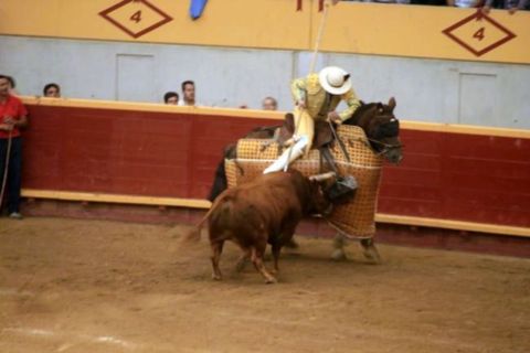 De Julio hay que decir que en la prensa especializada en el mundo del toreo que he visto, se le consideraba uno de los mejores novilleros de su época. Y hay que decir que venía con su familia a veranear al Moral y sobre el año 2004 se quedó a vivir en el pueblo. Estas líneas son expresión del homenaje que se debe rendir a estos toreros que tanto quisieron a nuestro pueblo, el Moral, y con el reconocimiento y admiración que han tenido de muchos de los vecinos de esta villa. Otro "cebollero" que entró con ilusión en el mundo de la tauromaquia ha sido Guillermo López Leiro, que con gran afición se dedicó a torear en tientas de este contorno, en algún festival taurino y en demostraciones de la Escuela de Tauromaquia de Moralzarzal, sobre todo en época de fiestas, pero finalmente no cuajó y ahora dedica su tiempo libre a actuar de banderillero en todas las novilladas en las que es invitado. Otros vecinos del Moral dedicados al mundo del toro, son dos jóvenes que han seguido otros derroteros, eligiendo la vía de los varilargueros o picadores de vara larga, y son Natalio Cartón Reguera y Juan José Sabariegos Leiro, aunque Natalio ha estado prácticamente dedicado a garrochero en la finca de Los Linarejos hasta después de la venta a San Román por parte del matrimono Carmen y Felipe, y Juan José sigue ejerciendo de picador cada vez que es requerido por matadores destacados del elenco taurino. Sabariegos debutó picando en la plaza de toros de Valencia en una novillada en la que lidió el novillero José María Roncero y siguió con otros novilleros como Ana Infante, Pedro Cerezo, López Díaz, Javier Bernal, debutando en la plaza de Madrid con este último, y así con otros cuantos. Con el matador José María Lázaro hizo su debut en una corrida de toros, y entre los toreros a los que sirvió en sus actuaciones taurinas se encuentran los extranjeros Luis Miguel Procuna colombiano y los mejicanos Isaac Fonseca y Héctor Gutiérrez. En Sevilla actuó junto al matador Ángel Sánchez y la primera vez que se presentó en Pamplona fue con el matador Francisco de Manuel, y otro torero con el que ha actuado es con Carlos Escolar "Frascuelo", siguiendo en activo picando cada vez que le llaman para ejercer de varilarguero, y además acude a todas las tientas a las que es invitado, para ejercer la suerte de varas con la vista puesta en la comprobación de la bravura de las reses. Seguidamente se muestra una foto de Juan José Sabariegos picando a un novillo en la plaza de toros de su pueblo, Moralzarzal, en la feria de las fiestas del año 2016, concretamente el día 3 de octubre, en el que se celebró una novillada con picadores, con novillos de la ganadería de El Retamar de Becerril de la Sierra y en la que actuaron Juan Miguel, Ángel Sánchez y Pablo Mora, con el que iba Juanjo. El 27 de septiembre de 2009, picó novillos de la ganadería del Jaral de la Mira del pueblo toledano de Calera y Chozas, lidiando los toreros Javier Cortés, Juan Carlos Rey y Manuel Fernández en la novillada con picadores de ese día en las fiestas del pueblo, que se ve en la foto de la derecha. |