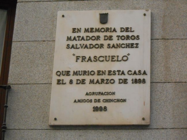 Santiago Estévez Morales, antes de tener en la calle Don Pedro la agencia de transportes, la tuvo en otros sitios como en la calle del Almendro 2 y en la calle Hileras 8 y los avisos se daban en la calle Latoneros nº 10, donde la taberna Casa Antonio, de Antonio Blasco, que fue socio de Victorino Martín y se venían por el pueblo a llevarse vacas para carne antes de dedicarse a las reses bravas. Pero sigamos dentro del mundo taurino haciendo mención de aquellas personas que hay que resaltar por sus buenas condiciones de la tauromaquia en el arte del toreo y relacionadas con nuestro pueblo. Frascuelo era el nombre taurino con el que era conocido Salvador Sánchez Povedano, y veamos algo de la historia de este hombre. Este afamado torero era natural del pueblo granadino de Churriana de la Vega, donde nació el 21 de diciembre de 1842, que tuvo un hermano que era novillero, llamado Francisco, y que era conocido por el apodo que luego tomó Salvador, "FRASCUELO". Sus principios en el mundo del toro fueron como para tantos de los que han soñado con alcanzar la gloria, muchas veces no conseguida, empezando con capeas, novilladas, y en aquellos tiempos participando en espectáculos llamados mojigangas en pueblos de los alrededores de Madrid, una vez que vino a la capital. Al principio era conocido con el apodo de "El Papelista", pues estuvo trabajando empapelando casas, ya que ese era su oficio por aquella época y luego tomó el de su hermano Francisco dicho anteriormente. Comenzó su carrera en el mundo del toro el día 13 de noviembre de 1864 debutando en Madrid donde mató un novillo en un espectáculo, y después estuvo en varias cuadrillas hasta que el 27 de octubre de 1867, tomó la alternativa en Madrid, siendo Curro Cúchares su padrino, y como testigo al hijo de éste, Currito. Sufrió varias y muy graves cornadas en su larga carrera, y con la sufrida en 1887 en Madrid durante la corrida del Gran Pensamiento, la que supuso para este torero un gran desgaste físico y una gran merma del ánimo, fue el motivo por lo que se retiró definitivamente del toreo en 1890, cortándose la coleta en una corrida celebrada en Madrid el 12 de mayo de ese año. Se retiró y se estableció en el pueblo madrileño de Torrelodones regentando una tienda de ultramarinos y un hotel que construyó junto a la estación de ferrocarril, donde se albergaban amigos y clientes y a causa de una pulmonía se fue a Madrid a casa de una hija que vivía en la calle del Arenal nº 22, falleciendo el día 8 de marzo de 1898, siendo enterrado en el cementerio madrileño de la Sacramental de San Isidro y entre los que fueron a darle el último adios, estuvo su gran rival en los ruedos, Rafael Molina, Lagartijo. La relación que tuvo con el ganadero Vicente Martínez, importante ganadero del pueblo que compró la ganadería de Julián de Fuentes en 1852, la cual la tenía su hijo Juan José de Fuentes que vivió en la Casa Grande, hoy día biblioteca municipal, hizo que estuviera en el pueblo durante largas temporadas y la relación con el Moral fué tal, que Frascuelo, el 4 de octubre de 1886 regaló a nuestro pueblo el reloj de la plaza, el que es conocido como el famoso "frascuelo", que desde entonces se ha podido ver en la torre del edificio del ayuntamiento, además de oir las horas antiguamente desde cualquier lugar del pueblo. Como agradecimiento, un año más tarde, el pueblo regaló al torero un estoque con la empuñadura de plata, cuando era alcalde D. Aniceto González González, hijo de D. Angel González Solís, alcalde recordado en la placa que hay en la fuente de los cuatro Caños por las obras con las que se trajeron al pueblo las aguas de los manantiales del Robledo, y para más información visita el apartado de este sitio web dedicado al reloj de Frascuelo que puedes encontrar en el índice general de la web pinchando en el libro índice de la página principal. En las fiestas del pueblo madrileño de Chinchón, en el verano del año 1863, el 25 de julio Salvador sufrió una cogida recibiendo una cornada bastante importante en un muslo y es la razón por la que en la calle del Arenal nº 22 de Madrid existe una placa en la fachada de la casa donde falleció Salvador Sánchez, casa de una de sus hijas como se ha dicho líneas arriba, y dicha placa está dedicada por una asociación de amantes del mundo del toreo de dicho pueblo, y se muestra a continuación. ![]() En el capítulo XLIII del Gran Diccionario Taurómaco, donde se trata de vicios y costumbres, se encuentra escrito sobre Frascuelo lo siguiente : "El incomparable matador, Salvador Sánchez (Frascuelo), feo de cara y de cabeza hermosa, al formar la puntería para dar la estocada ponía un gesto tan duro, arrugando el entrecejo, que bien se conocía su decisión de matar o morir con honra". Así decía la crónica de un comentarista de la época para referirse a Salvador Sánchez Povedano, pero fue una pulmonía y no un toro la causa de su muerte, como se ha dicho líneas arriba, que le sobrevino el 8 de marzo de 1898 y con motivo de ese lamentable y triste recuerdo al cumplirse el centenario de su fallecimiento se descubrió una placa, como se ha dicho y se ha mostrado en lo escrito previamente, el pasado 9 de mayo de 1998. De esta forma, y con la inclusión de la figura del eterno rival de Lagartijo como motivo de fondo en los carteles de las ferias de la Comunidad de Madrid y San Isidro, se inicia en este año el periodo dedicado al diestro de Churriana de la Vega, y entre los actos patrocinados por el Centro de Asuntos Taurinos de la Comunidad de Madrid y los ayuntamientos de las localidades a las que estuvo asociada la vida del torero destaca la exposición dedicada al matador en el Aula Cultural Taurina de la plaza de Las Ventas y la corrida que el 25 de julio se llevará a cabo en Chinchón. En este pueblo madrileño, Frascuelo sufrió su primera cogida grave cuando aún era banderillero el 25 de julio de 1863. En el capítulo XLVI se 