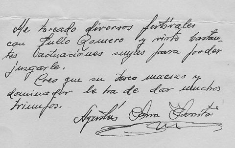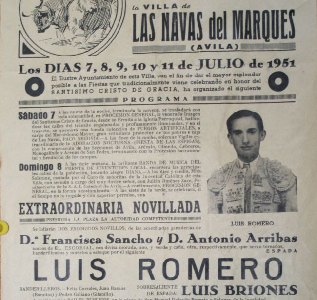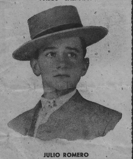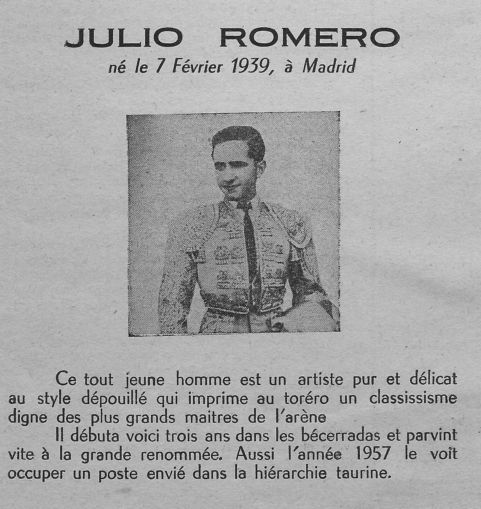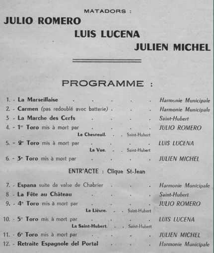 del festejo y por último el arrastre. Es muy curioso el ver todo eso y más aún el comienzo del festejo con el himno de La Marsellesa seguida de Carmen, la marcha de los ciervos, luego la lidia de los tres primeros novillos para seguir con más música y a continuación los tres toros siguientes. En la novillada estuvo acompañado por Luis Lucena nacido en Écija y por Julien Michel torero francés nacido en Arles, ciudad del sur de Francia, de la Provenza, que fue apoyado por el torero ya retirado que fue matador Pierre Pouly, el cual actuó también a principios del siglo XX en plazas de España. Seguidamente se muestra lo que pone el programa de mano sobre Julio Romero y la relación de actos de dicha fiesta del mes de septiembre de 1957. |