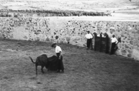 y se ha ido mejorando la técnica al compás de las exigencias de ganaderos y de los aficionados a la fiesta. Las dos clases de tientas se reducen a hacerlas en campo abierto o en plazas de toros con departamentos comunicados entre sí por puertas para facilitar el apartado de las reses. La tienta se realiza fuera de la temporada taurina, entre los meses de otoño y de primavera, y el escenario es la plaza de tientas de la ganadería, en la que se emplea caballo de picar y puya de tientas, y supone una prueba fundamental para seleccionar a futuros reproductores, tanto machos como hembras. Se empieza juntando a las reses a tentar en el rodeo, es decir se agrupan en un lugar de la dehesa, y se las conduce a un corral para ir pasando de uno a otro hasta que la res elegida se aparta del resto al pasarla a un chiquero que tiene acceso directo al ruedo de tientas. Con la res en el ruedo se prueban distintas suertes como son el toreo con capote, el de varas viendo como acude al caballo y el toreo con la muleta. Estas pruebas se hacen con las hembras e incluso con machos que serán destinados a sementales, pues no es conveniente que se haga con los que se van a destinar a la lidia, ya que recuerdan las faenas que se hacen con ellos, y es muy malo y peligroso torear un toro resabiado. El tentadero es una de las operaciones más importantes de una ganadería brava, pues en él, el ganadero decidirá qué animales aprueba para destinarlos como reproductores, y con ello, selecciona el futuro de la ganadería. Aparte de las tientas destinadas a la selección del ganado para ver sus cualidades con la vista puesta en la lidia, a veces se hacen para entretenimiento de aficionados que son invitados por los ganaderos a presenciar esas curiosas y animadas demostraciones de suertes taurinas, y como recuerdo de vivencias que el que escribe estas crónicas y os las relata, voy a poner una foto de los años 40 y otra de la primera década del 2000, la primera está sacada en la plaza de tientas de la finca Navalcaide del famoso torero Domingo Ortega en el año 1949 y la segunda en la finca Los Linarejos en el día 24 de junio de 2009 cuando Carmen Segovia invitaba a la asociación "Hogar de Mayores de Moralzarzal", cosa que venía haciendo desde unos cuantos años atrás, y que al finalizar la tienta siempre ofrecía a los invitados una merienda regada con buen vino y refrescos. |