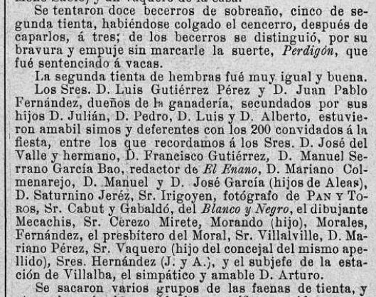 y se marcaron 99 reses. En el periódico El Toreo del 18 de noviembre de 1895 se da el aviso de que mañana tendrá lugar en la dehesa de Los Linarejos la tienta de becerros de los hijos de Vicente Martínez, estando invitados aficionados de Madrid, Colmenar Viejo y Moralzarzal, y en ese mismo periódico pero con fecha 25 de noviembre, aparece la noticia de que se efectuó en la misma dehesa los días 18 y 19 de ese mes la tienta de vacas y becerros bravos de los herederos de Vicente Martínez tentándose 46 becerros y resultaron muertos 5 caballos, desechándose solamente 5 reses, y dirigió la faena Frascuelo, oficiendo de tentador "El Chano" auxiliado por Taravilla y Martínez, y como siempre en ese festejo, los asistentes fueron obsequiados explendidamente por los anfitriones. Se ha hecho mención en la prensa a lo largo de los años de tientas y demás labores taurinas en la finca Los Linarejos, y tenemos en La Correspondencia de España del día 5 de noviembre de 1890 de que ayer, día 4, se celebró en esa finca la tienta de 49 becerros de la acreditada ganadería de Vicente Martínez con la participación de los diestros Lagartijillo y Maguel y del picador Calesero bajo la dirección de Frascuelo que lo hizo con el gran rigor del que sabe lo que lleva entre manos. También se dice en el número del 23 de noviembre de 1896 de la revista Pan y Toros, que el día 14 se celebró la tienta de becerros y vacas de los herederos de Vicente Martínez, que estuvo dirigida por Salvador Sánchez «Frascuelo» y Antonio Moreno «Lagartijillo», y ayudaron Julián Venegas «Berrinches» y José Martín «Taravilla» con otros dos aficionados y un vaquero de la ganadería y por lo que se puede leer al final del artículo de que acabada la operación, los invitados regresaron a Madrid y Colmenar, lo que evidencia que el tentadero se celebró en la finca de Los Linarejos. Seguidamente se muestra parte del artículo de la revista en donde se ve parte de lo expuesto sobre los becerros tentados y algunos asistentes invitados, y se dice que estuvo presente el presbítero del Moral, pero sin nombrarle, que entonces era D. Remigio Muñoz y Coello. ![]() Esa misma revista en su edición del día 29 de noviembre de 1897 se hace mención de otra tienta celebrada en Los Linarejos con ganado de los herederos de Vicente Martínez, Luis y Juan Pablo, y en ella se toreó y castró un toro de cinco años al que trasteó Frascuelo y fue pisoteado al caer delante del bicho. Se tentaron 27 machos y 35 hembras, y de los machos se seleccionaron 20, desechando 5 de ellos para destinarlos a novilladas y dos se dedicaron a cabestros, y de las hembras se seleccionaron 18, muriendo 4 caballos como consecuencia de la tienta. Entre los presentes como invitados pertenecientes al mundo del toreo y dentro de los diestros estaban Frascuelo, Dominguín, Taravilla, Lagartijillo, y mucha gente de los pueblos colindantes, pues la entrada era libre y había merienda y vino gratis. Otra tienta celebrada en Los Linarejos por los hijos de D. Vicente se celebró el día 11 de abril de 1901, la cual se realizó con becerros erales, estando presidida por D. Luis Gutiérrez, actuando los picadores Badilla y Pica y dirigida por «Lagartijillo», actuando como ayudantes Francisco Sánchez «Frascuelo», hermano de Salvador, Saleri, Taravilla, Cucharero y Saro además del mayoral Saturnino, según se ve en la revista Sol y Sombra del 18 de abril de 1901, tentándose 49 becerros que resultaron muy buenos, y los invitados fueron obsequiados por los propietarios como de costumbre lo suelen hacer, pasando una agradable jornada y dejando un grato recuerdo en los asistentes. A lo largo de esta exposición sobre el mundo taurino en Moralzarzal, se ha visto que los ganaderos han tenido como finca principal donde criaban su ganado la llamada Los Linarejos, cuya propiedad ha ido pasando de unos criadores de reses bravas a otros, y en los últimos años D. Manuel López Sastre (conocido en el pueblo como el tío Manolón), al acabar la guerra civil de 1936, la compró a los herederos de Vicente Martínez por la cantidad de unas 200.000 pesetas, y el 31 de marzo de 1953 se la vendió a D. Manuel Camacho Naveda y su esposa Dª Francisca García Villalón segun escritura ante el notario de Madrid D. Benjamín Arnáez Navarro, y el 24 de abril de 1981, fueron D. Manuel Camacho y su esposa los que se la vendieron a D. Felipe García Gamella y su esposa Dª Carmen Segovia Morato según acta notarial ente el notario de Madrid D. Aurelio Escribano Gozalo. Espero, como cronista de este pueblo de Moralzarzal, que esta parte dedicada a la tauromaquia que afecta directamente a nuestro pueblo, haya servido para deleite del lector y haya satisfecho su curiosidad por saber algo de la tauromaquia de mi Moral. |