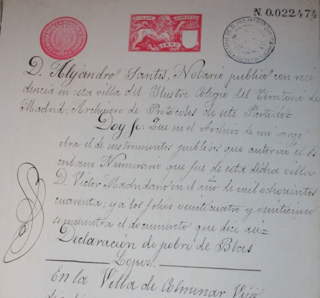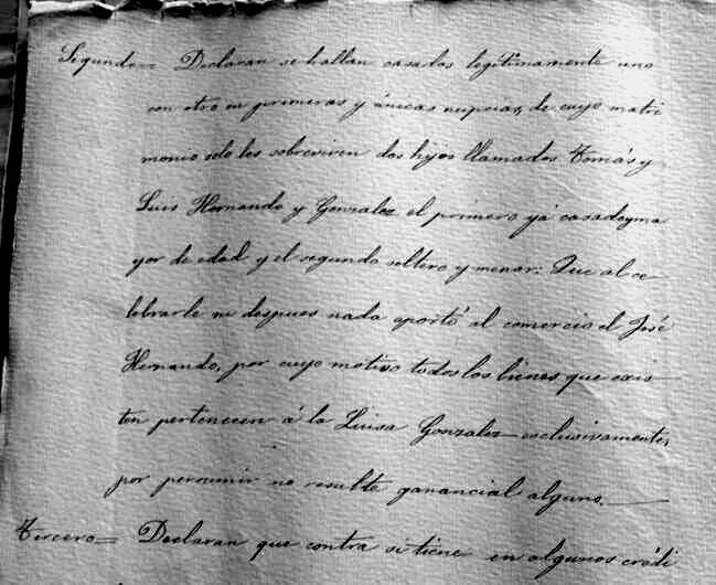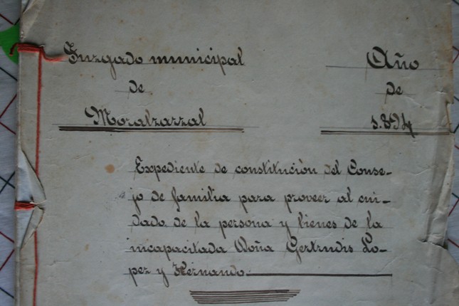 que la tutela se ejercerá por un solo tutor. Será vigilada por el Consejo de familia, que estará compuesto por las personas que el padre o la madre hayan designado en su testamento, y si no, lo formarán un presidente, que normalmente será el juez, y otros cinco miembros, que serán los vocales. Es decir, que el Consejo de familia es la reunión de personas que intervienen por ley en la tutela de un menor o incapacitado, que es nuestro caso, y veremos que careciendo de parientes la incapacitada de que se trata, se convocaron a cinco vecinos del pueblo para hacer de vocales del Consejo de familia. Pero qué es una persona incapacitada, lo vemos en el diccionario de la RAE que dice: "Falto de capacidad o aptitud para hacer algo", y vemos que otra acepción es: "Dicho de una persona: sujeta a interdicción civil", siendo interdicción civil "Privación de derechos civiles definida por la ley", y después de esta introducción, seguimos con nuestra historia. Vamos a ver la historia de la ayuda prestada a una vecina de nuestro pueblo llamada Gertrudis López Hernando, a través de unos documentos que me fueron dejados por una amiga y vecina del Moral, que encontró en un baúl en su casa, lo cual nos da idea de lo que hacía el Consejo de familia de esta villa, y empezamos por decir que el Consejo de familia, según el diccionario de la Real Academia Española, es: "Reunión de personas que intervienen por ley en la tutela de un menor o un incapacitado". Como antecedente de esta historia, diremos que Gertrudis López Hernando, consta en el libro de defunciones de la iglesia parroquial del Moral, que era natural de Colmenar Viejo, y falleció el día 23 de octubre de 1897 en Moral, hija de Blas y Juana, siendo testigos del entierro Luis de las Heras y Maximino Sánchez. Recibió la extremaunción y dice que tenía 70 años de edad cuando falleció. Su tutor era Tomás Hernando González, nacido en Moral el 21 de diciembre de 1859, que era hijo de José Hernando Mazarías y de Luisa González González, siendo sus abuelos paternos Francisco Hernando y Francisca Mazarías, y sus abuelos maternos Esteban González y Juana González, siendo sus abuelos paternos de Manzanares el Real, así como su padre, y sus abuelos maternos eran de Cerceda, como también era su madre, siendo su madrina su tía materna Gertrudis González. José Hernando Mazarías, falleció el 21 de septiembre de 1886 en Moral, era de Manzanares el Real, y su esposa Luisa González González, natural del Moral, falleció el uno de enero de 1910, ambos en el Moral, dejando, al morir ella, a sus hijos Tomás y Luis Hernando González. Luisa era hija de Esteban González y de Juana González. Más, para meternos en el tema y centrarnos en él, hemos de decir que el tutor de la protagonista de nuestra historia, llamado Tomás Hernando González, era el padre de una bisabuela de la persona que me dejó los documentos, llamada Eusebia Hernando González, persona de nuestro pueblo que se casó con el que fue panadero del Moral, Evaristo Alonso Molinero, que tuvo el horno y el despacho de pan en la calle de las Eras esquina con la calle Madrid, y después su hijo Juan, también siguió como panadero, como se cuenta en la página de este sitio web dedicada a los panaderos de Moralzarzal, y una vez introducidos en el tema, sigamos con esta historia. Comencemos por hablar del testamento de los padres del que fue tutor de la protagonista de nuestra historia, que fueron José Hernando y su esposa Luisa González, y en el documento notarial se ve que dice: En la villa de Moralzarzal à veinte de Septiembre de mil ochocientos ochenta y seis; ante mi Don Angel Gonzalez y Solis Notario público de la Nacion y del Colegio Territorial de la Audiencia de Madrid, Distrito de Colmenar Viejo con vecindad y residencia en ella y competetes testigos que al final se expresarán; José Hernando y Mazarias de cincuenta y nueve años, Labrador y sus esposa Luisa Gonzalez y Gonzalez de cuarenta y nueve años dedicada à las ocupaciones propias de su sexo : aquel natural de Chozas de la Sierra y esta de Cerceda pero ambos vecinos de esta villa y provistos de cédula personal con los números ciento ochenta y nueve y ciento noventa que exhiven y recogen: el primero hijo legítimo de Francisco y Francisca y la segunda de Esteban y Juana todos ya difuntos, hallándose el Jose enfermo en cama de la que Dios se há servido darle y la Luisa en buen estado de salud pero ambos con potencias y sentidos completos, juicio, memoria y entendimiento caval, creyendo como firme y verdaderamente creen en el inefable Misterio de la Santísima Trinidad, padre, hijo y Espíritu Santo, tres personas distintas, y un solo Dios verdadero en el de la Encarnacion y demas que tiene, cree y confiesa nuestra Santa Madre Iglesia, bajo de cuya fé y la creencia han vivido y protestan vivir como católicos y cristianos temerosos de la muerte que les ha de sobrevenir como deuda natural, mas como sea incierta la hora, aunque infalible, para cuando suceda y Dios se sirva trasladarle de la presente vida a la eterna mansion, puesto que manifiesta hallarse en la libre administracion de bienes, pleno uso y ejercicio de sus derechos civiles, que aseguran tener y à mi juicio tienen la capacidad legal suficiente para ello han dispuesto estar prevenidos de disposicion testamentaria realizan ahora juntos y de mancomun por medio del presente Testamento nuncupativo en la forma siguiente. Al leer esta parte con esas expresiones religiosas, nos dan idea de las creencias tan arraigadas de las gentes del pueblo en esa época, pero sigamos con las claúsulas del testamento, viéndose en la primera, las disposiciones que hicieron de tipo religioso a base de misas al producierse sus fallecimientos y las disposiciones de las voluntades de dichos esposos respecto de las celebraciones religiosas a llevar a cabo con motivo del fallecimiento del otro cónyuge. Y siguen las distintas clausulas de este testamento 