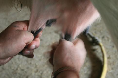 Cuando se llevan las vacas desde los corrales o los establos hasta la sala ordeño, lo primero que hacen es colocarlas en sus puestos y enseguida, por medio de una manguera, con agua a presión limpian las pezuñas traseras de los animales, ya que es la zona más cercana a donde irán las pezoneras. A continuación a cada vaca le lavan las tetas con agua clorada como desinfectante y se las secan con un paño limpio (suelen utilizar toallas de papel desechables), utilizando un paño nuevo para cada una y así evitar pasar bacterias o transmitir enfermedades de una a otra, como pudiera ser la mastitis. Con este procedimiento de limpieza que se hace hoy día, se han reducido considerablemente los problemas causados por enfermedades en las vacas y se han evitado grandes pérdidas económicas en la industria láctea. |
