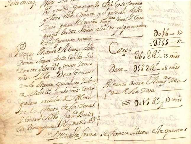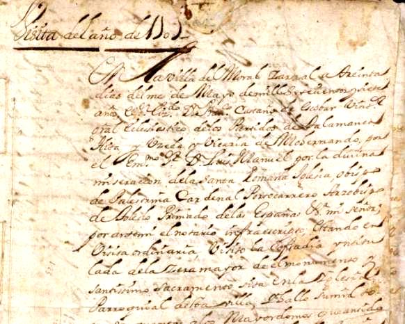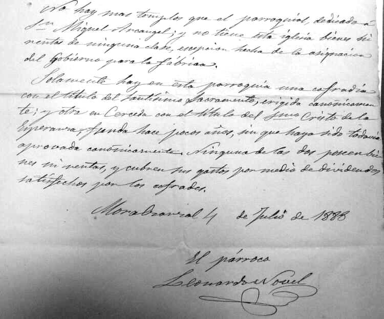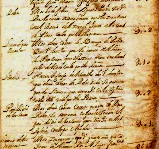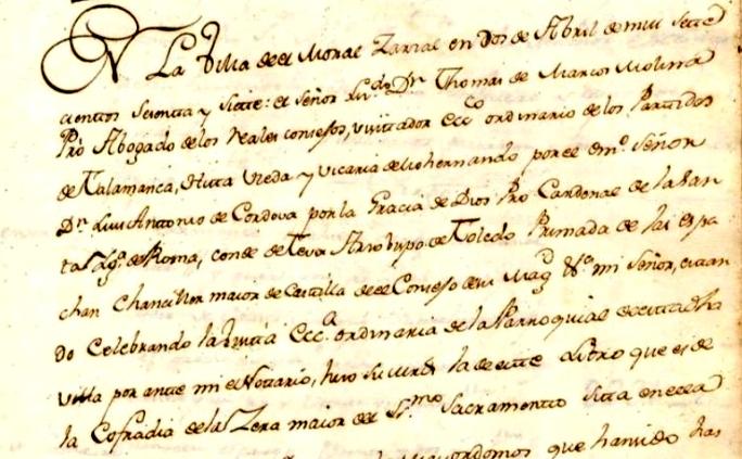 Serrano, Bartolomé Gómez, Alonso López y Miguel Esteban, junto con el escribano Sebastián Martínez. Se ve en el acta antedicha, que se acordó hacer un archivo en la iglesia, donde se guardaran los papeles del Concejo, y lo más probable es que al devolverlos desde la iglesia al archivo del Ayuntamiento, alguno que era propio de la iglesia, como el que se va a exponer en este estudio, se llevara al Ayuntamiento, y por eso no se encuentra donde debería estar, en la iglesia, así como otro libro del que se ha hecho mención en la página web dedicada a la toponimia de Moralzarzal que lleva por título "Libro de Arriendo de las Heredades de la Iglesia Parroquial de San Miguel Arcángel 1762 1842", pero veamos lo escrito en el documento encontrado en al archivo municipal, libro de Cuentas de la Cofradía de la Cera Mayor. El mayordomo de la iglesia era uno de los oficios menores que nombraba anualmente el Concejo, y según el diccionario de la RAE es el "Oficial que se nombra en las congregaciones o cofradías para que atienda a los gastos y al cuidado y gobierno de las funciones", en este caso relativas al cuidado del edificio. Se acaba de decir, que hubo un tiempo en nuestro pueblo, en que había oficios nombrados por el Concejo, como eran los oficios llamados menores, y entre ellos estaban los mayordomos, y los había de la iglesia según distintas advocaciones, como la del Niño Jesús, de las Ánimas, Virgen del Rosario, de la Ascensión, de la Soledad, de San Sebastián, de Nuestra Señora, del Santo Cristo, y así unas cuantas, y los mayordomos eran los oficiales que se nombraban para las congregaciones o cofradías, cuyo trabajo era que atendieran a los gastos, cuidado y gobierno de las funciones específicas de cada advocación, pero veamos algunos mayordomos nombrados por el Ayuntamiento en algunos años del siglo XVII, como por ejemplo en 1679, de manera que se ve escrito en el acta del pleno que se celebró el día 15 de enero de ese año que dice así : "En la ua del Moral Çarzal a quince dias del mes de heno de mill y seiscienttos y setenta y nuebe años Sus mercedes de anton muñoz y Jo Vcendo Alcaldes hordinarios domingo Serrano y matheo rubio rejidores y domingo blasco procurador general Se juntaron Por ante mi el SSno. a nombrar oficios menores desta uilla segun su uso y costunbre de ella = y abiendolo Comunicado y mirado todos de un acuerdo y pasrecer nombraron a los siguientes pr mayormos de la Yglesia a franco Callejo o a po mingo ----------- pr mayormo de la cera mayor Antto charbao ----------------------- pr mayormo de las animas franco marttin --------------------------- pr mayormo de Nra Señora del Rosso frano redondo ------- pr mayormo del Santo Χpo San Marttin -------------------------- mayormo de nra Señora de la Soledad Domingo Venito ------------ pr mayormo del niño xesus Agustin redondo ------------------------- mayormo de la Candela Juan de la Cruz ------------------------------- mayormo de la ascenssión Jo de gomez ---------------------------------- mayormo de San SSan. hernando guillermo ---------------------------- Cobrador de ls dehessa esteuan gomez --------------------------------- Depositario del posito Alo muñoz el mozo Administrador de la sissa y taberna Matias esteuan ------------------ apreciadores Roqe mayoral y Pablo peynador -------------------------- guardas del montte esteuan Venito y Po mn hijo de franco mn y franco gaston Depositario del papel Sellado Juo muñoz el tendero ------------------- A los quales mandan sus mercedes acepten y cunplan dhos oficios Pena de prison execusion y lo firman de sus mercedes los que supieron de que yo el escriuano doy ffe Y se ve la firma del escribano Pedro de Arredondo. Es decir, todo un lujo de mayordomos entre los oficios menores nombrados en 1679. Ya vemos que se nombra a Antonio Charbao como mayordomo de la Cera Mayor, que es la cofradía de la que vamos a ver su libro de cuentas durante gran parte del diglo XVIII, libro que se encuentra en el Archivo Municipal, y que estuvo en el archivo dicho de la iglesia en las líneas del principio de esta página, pero por razones desconocidas no se quedó en la iglesia, sino que se llevó al Archivo Municipal, y en él se apuntaban los ingresos y los gastos de la Cofradía. La llamada "Cofradía de la Cera Mayor", era una congregación de devotos que se encargaban de poner las velas al monumento del Santísimo Sacramento en los días de Jueves y Viernes Santo, y vamos a ver los datos que constan en el libro encontrado en el Archivo municipal de Moralzarzal, que lleva como título : "Libro de cuentas de la Cofradía del Santísimo Sacramento del Monumento de la Villa del Moral", que comienza con la visita eclesiástica del año 1707, y sigue con las cuentas, distinguiéndose entre partidas de ingresos, a las que se agupan dentro del apartado Cargos, y las partidas de gastos agrupadas en el apartado Datta, y haciendo la diferencias entre ingresos (Cargo) y gastos (Datta), se obtiene el beneficio o pérdida, llamado Alcanze, el cuál podía ser a favor del mayordomo o de la Cofradía. En el documento vienen cuentas de todos los años desde 1706 hasta 1774, de manera que se ven las cuentas de tres o cuatro años, y sigue la correspondiente visita eclesiástica para ver esas cuentas, alternándose así varios años con sus cuentas, y la visita en la que el Señor Visitador Eclesiástico las revisaba, y lo hacía en nombre del Arzobispo de Toledo, siendo ese arzobispado la cabeza de la diócesis a la que pertenecía la iglesia parroquial de nuestro pueblo, y en dicho libro, constan, por cada año de cuentas, los nombres del visitador, los dos alcaldes y regidores, el procurador, el mayordomo correspondiente de la cofradía, además del cura propio del pueblo, y así se van viendo las cuentas escritas en el periodo antedicho de 1706 hasta 1774. Constan 2 alcaldes, 2 regidores y 1 procurador, como se ordenó y se ve en el documento de concesión de villazgo d