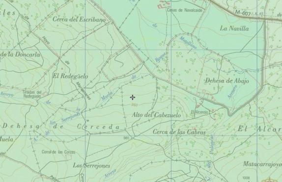 | El enclave de Moralzarzal, "E", está en el Alto del Cabezuelo, pegado a la finca El Alcorejo y la Dehesa de Cerceda, haciendo límite con el arroyo de la Muela de Roque. En el mapa que se muestra a continuación se puede ver este enclave justo en la zona donde está la cruz dentro del perímetro delimitado por las líneas discontínuas. Está rodeado de terrenos pertenecientes a Becerril de la Sierra, "10", y de Boalo (Cerceda), "8", números del plano de arriba, con lo que las cruces y marcas se pueden ver cuando se ven las de dichas zonas 8 y 10. Una pequeña parte de este enclave está dentro de la finca El Alcorejo y otra justo en el límite con la zona del campo de tiro militar del Palancar. Se ve la separación que hay entre este enclave y la lengua de terreno de Moralzarzal que está justo donde se lee El Redegüelo. |
