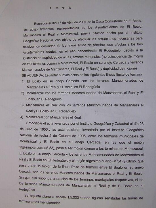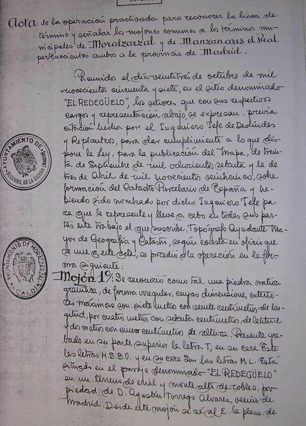 la presente acta mientras que los representantes de Moralzarzal manifiestan que la línea divisoria de ambas jurisdiciones es la determinada por otros mojones que contienen