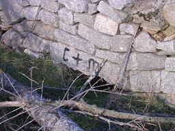 a la izquierda , iniciales y cruz marcadas en una tapia. Se trata de un punto de separación entre Cerceda y Moralzarzal cercano al rio Navacerrada. |