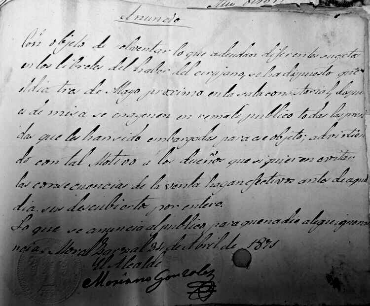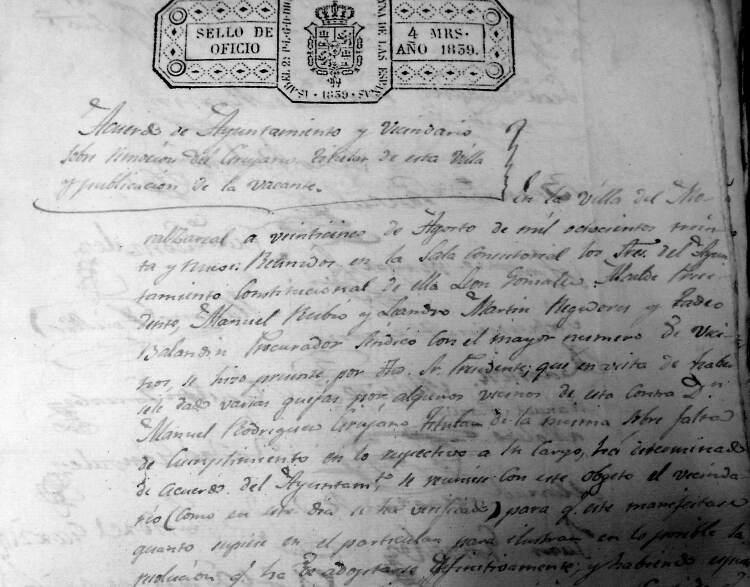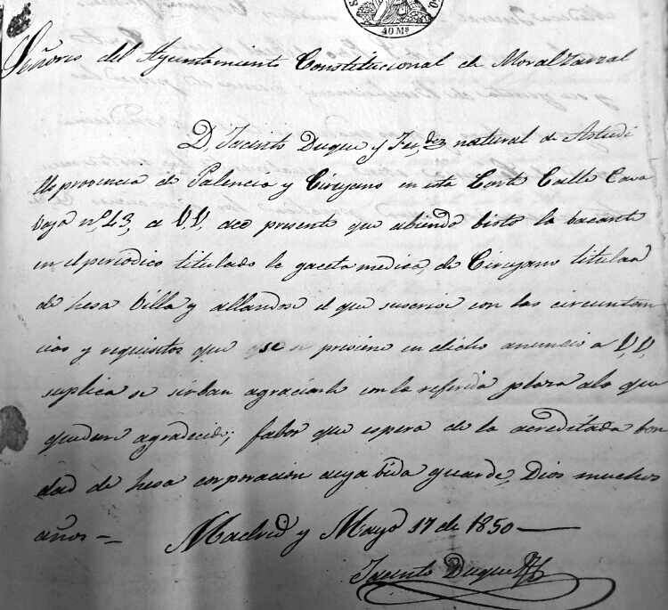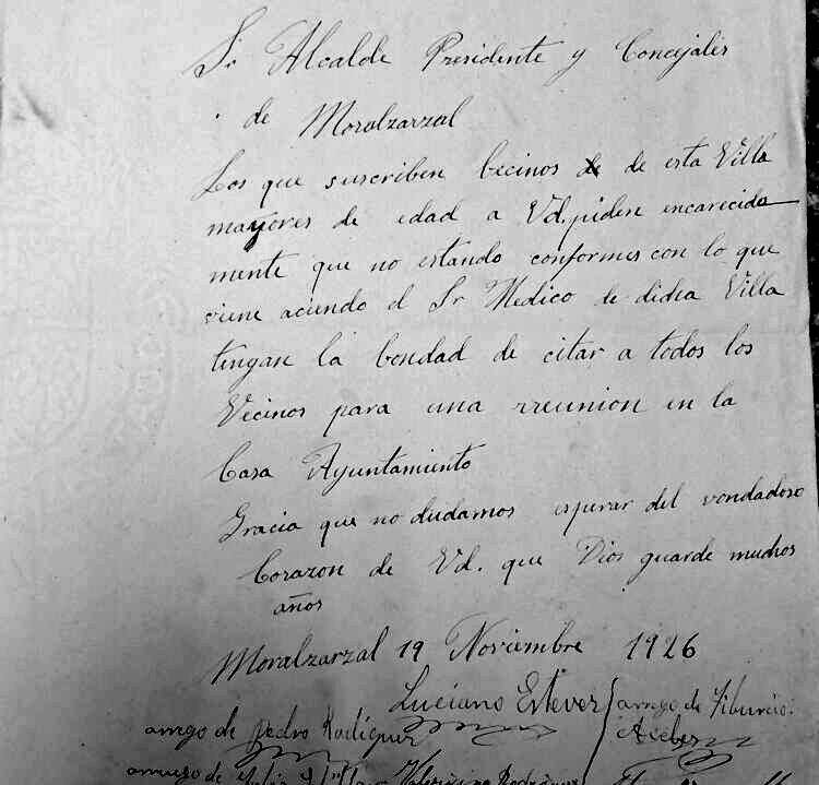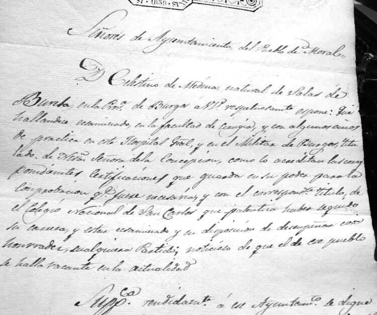 las secuelas que puedan producir". Pero veamos un documento que nos cuenta cosas que se hicieron en la reunión del Concejo del Moral que va titulada como "Encargo del barbero en este lugar este año de 1628 años", poniendo en el margen superior derecho "miguel Calbo barbero y cirujano -" y dice que "en el Lugar del moral a seys dias del mes de março de mill y seyscientos y Veynte y ocho años anton muñoz alcalde en el dho Lugar y bartolome gomez procurador general en el dho Lugar Vezinos del y en presençia de mi el presente escriuano e usando del poder que el dho alcalde y procurador tienen del conzejo deeste dho Lugar para buscar barbero que sirba este dho año en este Lugar = en cumplimiento de Lo qual e porque corria necesidad publica e Vezos deeste lugar e para allar uien del y enfermos que ay e ouuiere adelante durante este dho año; e para Lo Cuitar hiçieron dilijenzia en buscar el dho baruero para que asista en este lugar todo Lo que falta este año = a lo qual paresçio auiendo tenido notiçias dello ante el dho alcalde y procurador en este Lugar miguel Calbo barbero y cirujano rresidente en el Lugar de Collado uillalba :" Y para dar testimonio de lo dicho, se muestra a continuación la parte del acta donde se lee que Miguel Calvo era barbero y cirujano residente en Collado Villalba. ![]() Está claro que el barbero y cirujano Miguel Calvo, vecino de Collado Villalba, se enteró de que en nuestro pueblo se buscaba una persona que atendiera a los enfermos, y continúa esta acta como se ve segidamente: "y estando en este lugar del moral auiendolo tratado y conferido con el suso dho se convinieron y conçertaron en que el dho miguel Calbo se obligaua e obligo a seruir su ofiçio de barbero e todo Lo tocante ael dho ofi io en este dho lugar del moral desde oy dho dia de la fecha asta el dia de año nuebo primero benidero de mill y seyszos y Veynte y nuebe años asistiendo siempre entodo el dho tiempo en este Lugar sin hazer ausençia del a otra parte Curando a todos Los Vezinos del y a sus hijos y Criados que ouuieren e tuvieren durante dho tiempo asi en sangrias y hordenar Lo que fuere nezesario para su salud de los enfermos = ". Continúa diciendo que si estuviera ausente, se obligaba a que el Concejo, alcaldes y justicias de este pueblo buscaran sustituto que sería a su costa, tanto si fuera poco o mucho, y que se le descuente de su salario, respondiendo con su persona y bienes. En caso de que cayera enfermo no se vería obligado a ello, solamente a pagar no más de 4 reales por día al suplente, que se le descontaría de su salario, y que el Concejo se obliga a pagarle setenta ducados en reales, continuando con "Los quales se obligaron Los dhos anton muñoz y miguel torres alcaldes y bartolome gomez procurador =", y como garantía dijeron que obligaban los bienes propios y rentas del Concejo, y a pagarle en tres tercios, el primero en el mes de abril, el segundo en septiembre y el último tercio, a finales de año (y el hultimo terçio a fin deeste dho año de la fecha deste so pena de execuçion y Costas a cada plazo). Se obligó Miguel Calvo a dar fianza a Contento de la justiçia de este dho lugar, para lo cual puso como sus fiadores a Domingo Benito, a Gerónimo Domínguez y a Andrés Herranz, vecinos que eran de Collado Villalba, los cuales, que estaban presentes, lo aceptaron. Acaba el documento diciendo que son testigos Francisco Rubio, Juan de Antón Muñoz, y Miguel Esteban, vecinos del Moral, y firmaron Miguel Calvo, Antón Muñoz, Domingo Benito, Bartolomé Gómez, y el escribano Simón Martín de Ucendo. Así que Miguel Calvo hemos visto que es el primer médico-cirujano del que tenemos constancia escrita que hubo en nuestro pueblo en 1628, pero sigamos con otro médico del Moral que hubo también en el siglo XVII. Es el acta del día 8-12-1628, que empieza así: "en el Lugar del moral a ocho dias del mes de diciembre de mill y seyzos y veynte y ocho años estando en qo puco a son de Campana tañida segun Lo auemos de huso y Costumbre de nos juntar para las cosas tocantes y perteneçientes ael dho nro qo estando juntos en el nos anton muñoz alcalde y bartolme gomez procurador general en este dho lugar e Con nos Juan mingo juo panadero ..." y sigue nombrando vecinos presentes en el concejo, y así juntos se hizo y acordó lo siguiente: "Primera mente en este Conzejo se acordo que se rrematase el ofiçio de la uarberia deeste dho Lugar para el año que uiene de mill sysçientos y Veynte y nuebe años. en el dho gaspar salgado de la torre barbero y cirujano Segun y con las Condiçiones Contenidas en su postura y atento que aunque Conforme a la dha postura no auido quien hiçiese mejora en ella aunque se a pregonado en el dho qo muchas bezes =", y se ve que el tal Gaspar remató la subasta para quedarse con el oficio de barbero y cirujano del Moral, y que se notifique a sus fianzas si las tuviere, y si no las tuviere por ser forastero, el Concejo correría con ese riesgo, y así se acordó, mostrándose seguidamente lo de barbero y cirujano. ![]() Vamos a ver ahora el acta de la reunión celebrada por el Concejo para elegir a otro barbero cirujano que empieza "en el lugar del moral a ocho dias del mes de diçienbre de mill y seysos y veynte y ocho años estando en qo puco a son de canpana tañida segun Lo auemos de uso y costunbre de nos juntar para las cosas tocantes y perteneçientes all dcho nro qo estando juntos en el nos anton muñoz alcalde y bartolome gomez procurador general en este dho lugar e con nos Juan mingo juo panadero franco gomez ... " y así va nombrando asistentes a esa reunión hasta que llega a decir "Primeramente en este Conzejo se acordo que se rrematase el ofiçio de La uarberia de este dho lugar para el año que uiene de mill y seisçientos y veynte y nuebe años en el dho gaspar salgado de la torre barbero y çirujano segun y en las condiçiones contenidas en su postura y atento y atento que aunque Conforme a la dha su postura no auido qu