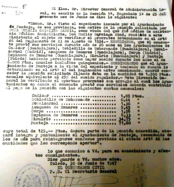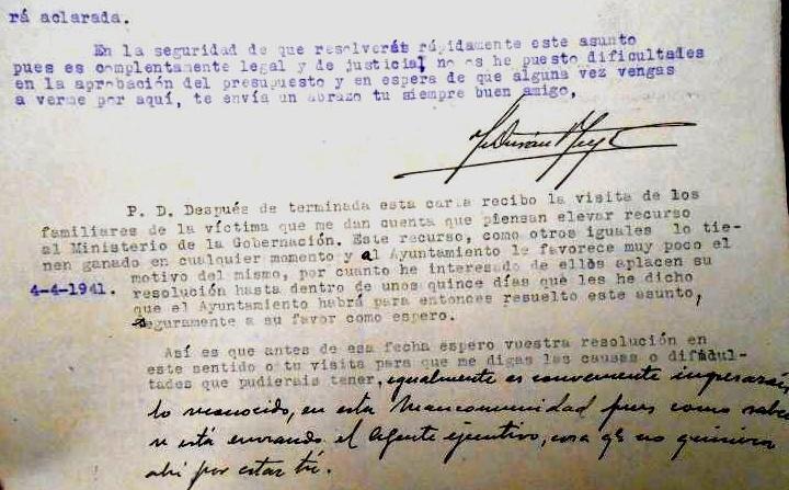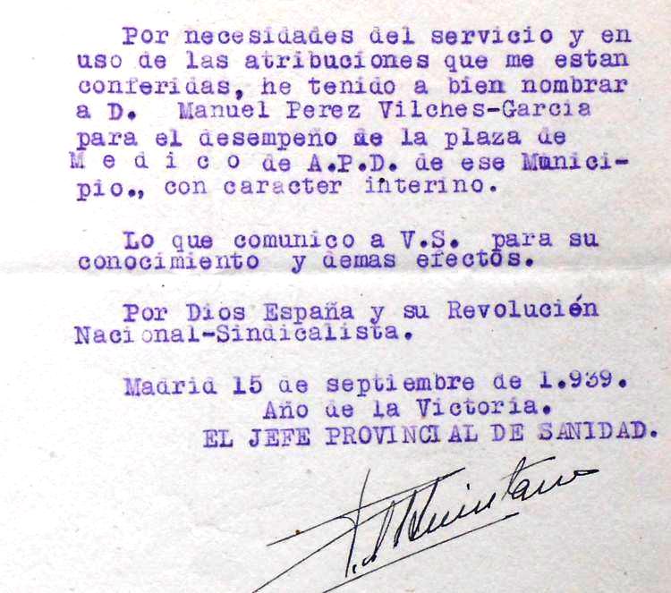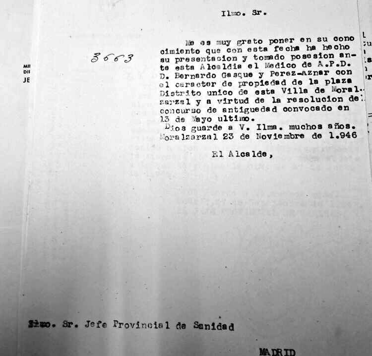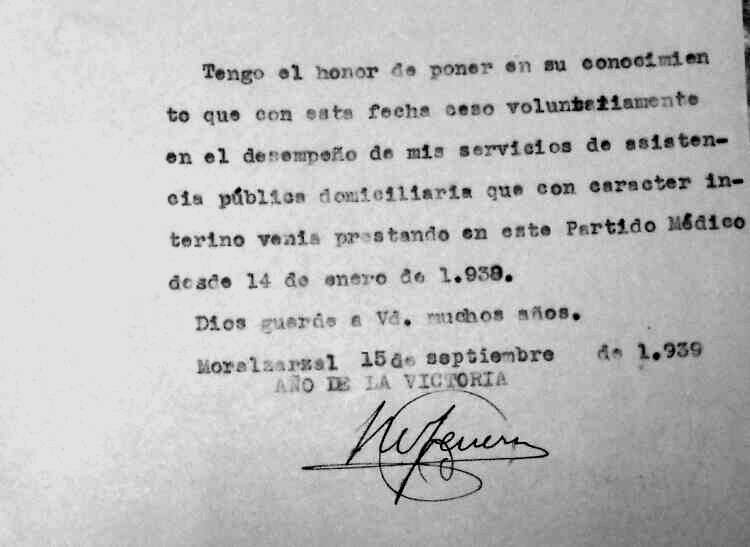 Siguió al Dr. Arrillaga el médico D. Manuel Ferrero Zarzuelo y veamos lo poco que podemos aportar sobre este doctor relativo a la historia de la Sanidad de Moralzarzal. Hay una carpeta que habla de médicos, y tiene puesto año 1939, viéndose en ella: EXPEDIENTE sobre nombramiento interino de Medico titular a favor de DON GERARDO GARCIA GOLPE (nombre supuesto para evitar persecuciones, siendo su verdadero nombre MANUEL FERRERO ZARZUELO Licenciado en Medicina), y en el primer documento de esa carpeta se ve la carta que desde la Inspección Provincial de Sanidad de Madrid se dirige al Sr. Alcalde Presidente del Ayuntamiento de Moralzarzal comunicándole que el Inspector municipal de Sanidad de esa localidad Dr. José María Arrillaga, ha manifestado que tiene que atender a su curación por padecer un derrame pleural, quedando como sustituto y mientras dure su curación, el Dr. D. Gerardo García Golpe, al que se comunica con esta fecha lo siguiente: "Presentada en esta Inspección la solicitud del Inspector Municipal de Sanidad del pueblo de Moralzarzal, para que le sea concedido un permiso para atender a su delicado estado de salud, en cuya solicitud, usted estampa el conforme en sustituirle mientras dure su ausencia, particípole debe presentarse en dicha localidad en el plazo mas breve, para que de acuerdo con las Autoridades Municipales del pueblo, atienda a la población del mismo." Y lo firma en Madrid el 14 de enero de 1938 el Inspector Provincial de Sanidad. Se ve en el documento siguiente el comunicado que dirige el doctor D. Manuel Ferrero Zarzuelo, nombre verdadero de D. Gerardo García Golpe, al Alcalde de Moralzarzal, por el que pone en su conocimiento su cese voluntario de sus servicios de asistencia pública domiciliario que con carácter interino venía desempeñando en el Partido Médico desde el 14 de enero de 1938, que lo firma en Moralzarzal el 15 de septiembre de 1939, y seguidamente se muestra su carta. ![]() Como consecuencia lógica de esa dimisión, el Alcalde accidental de Moralzarzal escribe al Sr. Inspector Provincial de Sanidad de Madrid, el cese presentado ante la Alcaldía por el médico titular interino D. Manuel Ferrero Zarzuelo referido al 15 del actual, y la despedida está acorde con esas fechas, pues había acabado la guerra, viéndose escrito: Moralzarzal 12 de septiembre de 1939. AÑO DE LA VICTORIA El Señor D. Manuel Ferrero Zarzuelo cesó en el ejercicio de médico interino de Moralzarzal en el día 15 de septiembre de 1939, el cual actuaba bajo el nombre de Gerardo García Golpe para evitar ser perseguido, y que desempañaba el cargo desde el 14 de enero de 1938 después del Doctor José María Arrillaga Ariztinuño que cesó para curarse de un derrame pleural. Continuamos hablando de D. Manuel Pérez Vilches García, que era sobrino del D. Manuel Vilches Ramón, dueño de un hermoso chalet de la calle de las Eras, del que se hace mención en el apartado dedicado al agua en este sitio web, y estaba en el pueblo con la familia Vilches cuando estalló la guerra civil de España de 1936, siendo movilizado y de ahí que conste en la lista de médicos del pueblo, pero veamos documentos que le mencionan y empezamos con uno que el Jefe Provincial de Sanidad de Madrid se dirige al Sr. Alcalde de Moralzarzal, D. Manuel Sepúlveda Antuñano, y le dice que por necesidades del servicio, tiene a bien nombrar a D. Manuel Pérez Vilches-García para el desempeño de la plaza de Médico de Asistencia Pública Domiciliaria de ese municipio, lo que le comunica para su conocimiento y demás efectos, y lo firma después de despedirse patrióticamente como se hacía en esas fechas, y lo firma Primitivo de la Quintana como se ve seguidamente. ![]() El Ayuntamiento de Moralzarzal comunica al Inspector provincial de Sanidad que D. Manuel Pérez Vilches ha tomado posesión con carácter interino el 22 del corriente mes y se lo comunica el 28 de septiembre de 1939. La Jefatura Provincial de Sanidad de Madrid comunica al Sr. Alcade de Moralzarzal que vista la instancia de D. Manuel Pérez Vilches solicitando le sea concedido un permiso de 14 días y quedando el servicio cubierto por D. Manuel Palenzuela, se le concede a partir del día 6 de abril próximo, viéndose la firma del Jefe Provincial de Sanidad que lo hace en Madrid el 31 de marzo de 1941. Pero el Sr. Pérez Vilches no siguió de médico del Moral, como se ve en el documento que manda al Sr. Alcalde de Moralzarzal diciendo que cesa voluntariamente en el servicio que venía prestando desde el 22 de septiembre de 1939, y lo firma en Moralzarzal el 16 de agosto de 1941, lo que comunica el Sr. Alcalde al Sr. Jefe Provincial de Sanidad de Madrid en esa misma fecha, y éste comunica al Sr. Alcalde del Moral el cese una vez visto el oficio presentado por el Dr. Vilches en esa Jefatura. Vemos ahora el expediente sobre nombramiento de Médico de A. P. D. con carácter provisional a favor de D. Felipe Altozano Guadalix, y se ve escrito con lápiz azul INTERINO = y el primer documento de ese expediente es la carta que dirige al Alcalde de Moralzarzal el Jefe provincial de Sanidad accidental D. Félix Fernández Turégano diciéndole que se ha aceptado el cese de D. Manuel Pérez Vilches y se encuentra anunciada la vacante de la plaza de médico de Asistencia Primaria Domiciliaria para su provisión, y lo firma en Madrid el 28 de agosto de 1941. El Alcalde del Moral comunica al Jefe Provincial de Sanidad que el Ayuntamiento de Moralzarzal pone en su conocimiento que en la sesión celebrada hoy se acordó nombrar a D. Felipe Altozano Guadalix con carácter provisional para el servicio sanitario del pueblo, y lo firma el 29 de agosto de 1941, y con fecha 2 de septiembre de 1941 se lo comunica al Sr. Alcalde de El Boalo. El Jefe Provincial de Sanidad de Madrid comunica al Alcalde de Moralzarzal que ha tenido a bien nombrar con carácter interino a ese señor como Médico de A.P.D. para la plaza vacante el 2 de septiembre de 