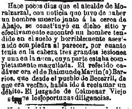Pero buscando en la hemeroteca, he encontrado una reseña en el número 3338 de la publicación LA CORRESPONDENCIA DE ESPAÑA diario universal de noticias, publicada el viernes 22 de marzo de 1867, y se puede ver a la derecha de estas líneas, que Raimundo fue encontrado muerto junto a la cerca de Abajo, donde está la cruz, que era vecino de Becerril y que había ido a reclamar un débito (que no cobró al ser asesinado). | ![]() |