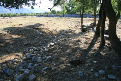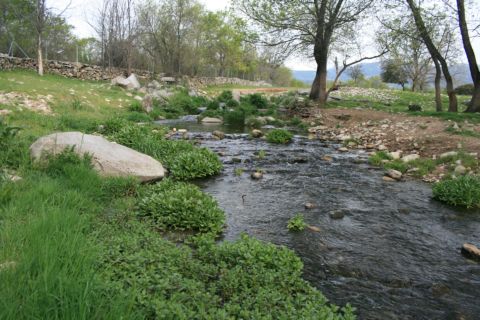 o de «caz». Para poder llevar el agua por esa cacera, en una curva del río dentro de la Cerca del Indiano, se construyó un azud o barrera para elevar el nivel del agua y al conseguir una diferencia de altura con el molino, se podía desviar hacia la cacera o caz, teniendo ese azud una trampilla de madera con la que se regulaba la entrada de agua al caz. El molino tuvo su época de trabajo hasta que disminuyeron las cosechas de cereales que se sembraban en los campos del pueblo y se llevaban a moler a ese molino, por lo que entonces dejó de ser rentable. Y voy a mostrar fotos correspondientes a este tema del molino, del que solo existen las ruinas de lo que fue, y empezando por el agua que se llevaba hasta él, a la izquierda se ve la salida, desde los Cercados del Indiano, del río Berrocal como dicen las gentes del pueblo o río Navacerrada como dice el Instituto Topográfico a ese tramo del río, antiguamente río de los Linares, y en la foto de la derecha la cacera por donde se llevaba al agua hasta el molino. |