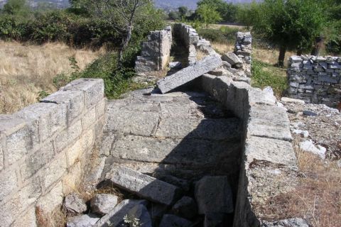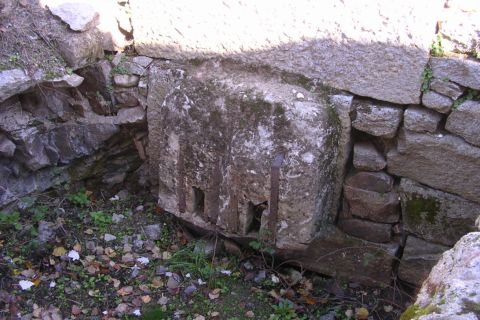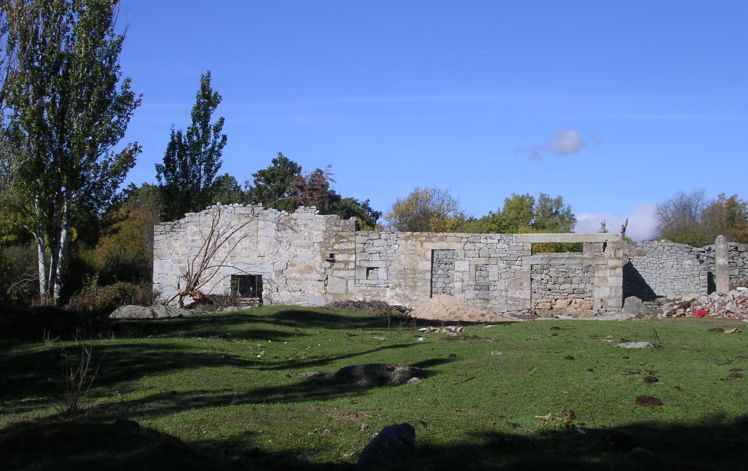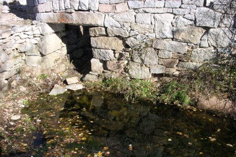En otros tiempos pasados, se sembraban en el pueblo trigo, cebada, centeno, algarrobas, garbanzos y servían de sustento tanto a las gentes como al ganado, aunque solamente se molían trigo, cebada y centeno. Algunos se preguntarán cómo es que había un molino de agua en la zona si el río en verano suele llevar muy poca agua. Pues la verdad es que antes no existía la presa de Navacerrada, hecha en 1959, que es la que «regula» el río, y entonces había agua suficiente y se aprovechaba de manera que servía para hacer mover las ruedas. El agua llegaba por la cacera vista en una de las fotos anteriores y entraba en un "caz" o canal hecho de piedra por donde se conducía hasta el edificio donde se encontraba la máquina para moler, compuesta de una muela, una solera y los mecanismos necesarios para transmitir y regularizar el movimiento producido por una fuerza motriz, en este caso el agua, y a continuación se muestran dos fotos en las que se ve el canal de piedra y al final del canal como una tolva en forma de cono invertido o embudo con mucha pendiente, por la que se hacía caer el agua, y que debido a la pendiente cogía buena velocidad y se llevaba hasta una piedra en la que había dos aberturas por donde salía ese agua dirigida a la rueda de palas que transmitía el movimiento giratorio a las muelas o discos de piedra que al girar rápidamente alrededor de un eje y sobre la solera, molían el grano que entre ambas piedras se interponían. A la izquierda se ve el canal de piedra cuando llega a la tolva, viéndose inclinado el canal al entrar en ella, y a derecha la piedra antedicha de dos rendijas por donde salía el agua a buena velocidad para mover las ruedas. |