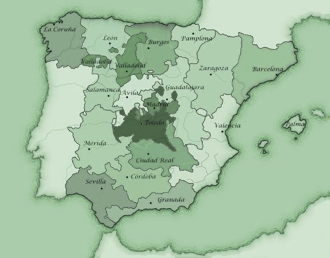 A continuación se muestra el mapa de la Península Ibérica donde se ve el Reino de Castilla y sus provincias, como se ha dicho en estas