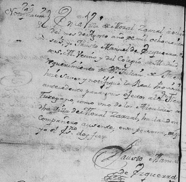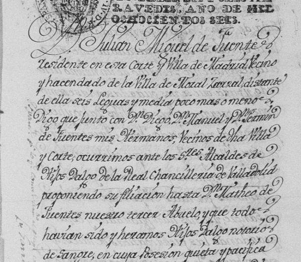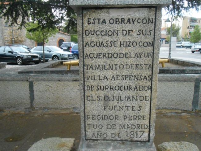 personas que tuvieron presencia en ese tiempo y sobre todo de las personas relevantes que marcaron acontecimientos de periodo. Dentro de la historia del Moral, en la breve descripción de su historia, se puede decir que, habiendo hablado en las páginas web del medio rural y del mundo taurino, en donde se ha hecho mención al terrateniente D. Julián de Fuentes, persona que era un acaudalado hacendado, el cual compró terrenos en Moralzarzal y pueblos colindantes como veremos, mantuvo un pleito con el pueblo para que se le reconociera como vecino noble, y no vecino normal o plebeyo, o como se decía entonces, vecino pechero, es decir, según se ve en el diccionario de la Real Academia, vecino obligado a pagar o contribuir con pecho, siendo esta palabra “tributo que se pagaba al rey, al señor territorial o a cualquier otra autoridad”. De manera que si se le declaraba como vecino noble, no estaba obligado a contribuir como los vecinos pecheros. Don Julián Miguel de Fuentes López, nació el 17 de febrero de 1760 en el pueblo riojano de Valgañón, siendo sus padres D. Anastasio de Fuentes Porres y Dª Martina López Huerta, siendo, Julián, el mayor de los cuatro hermanos habidos del matrimonio. Fue bautizado a los dos días de nacer, por el capellán D. Manuel de Huerta Merino, y sus abuelos tanto paternos como maternos eran también de su pueblo, Valgañón, y heredó de su padre el título de Conde del Sacro Palacio y también el de Imperio Caballero de la Espuela Dorada. Siendo jovencito, pues apenas tenía 22 años, vino a Madrid con sus tres hermanos y alquiló una casa de la calle de la Montera para vivir los cuatro, y en Moralzarzal compró terrenos y se dedicó a la cría de ganado bravo, cosa que se puede ver en la página de este sitio web dedicado al mundo taurino en Moralzarzal. Fue Regidor Perpetuo de la Villa y Corte de Madrid desde finales de 1806, que como era costumbre en su época, adquirió comprando el título, y destacó como comerciante y ganadero, y fue un personaje de la vida pública como miembro del municipio madrileño. Fue contratado como factor de la Real Compañía de Filipinas, con destino en Cantón (China), en el mes de diciembre de 1785, y vemos, que, según el diccionario de la Real Academia Española, factor es el oficial real que en las Indias recaudaba las rentas y rendía los tributos en especie pertenecientes a la Corona. De ese contrato, cuando estuvo en nuestro pueblo, le vino el apodo del "Indiano". El hecho de que fuera nombrado factor, se debió a sus cualidades para dirigir los asuntos comerciales, y eso lo demostró antes de ser nombrado para ese cargo, cuando estuvo al frente del Cuartel de Palacio de Madrid. La presencia de D. Julián en Extremo Oriente, se debió a las buenas cualidades que le caracterizaron para dirigir los asuntos comerciales, hecho que bien demostró cuando estuvo al frente del Cuartel de Palacio de Madrid, al que abasteció de todo tipo de bienes, especialmente de carne. Fue por ello, que el Presidente de la Real Compañía de Filipinas, de la cual formó parte, le destinó a Cantón (China), donde ejerció el cargo de factor, representando y defendiendo los intereses españoles en aquellas tierras, de las que se importaban a Europa, especialmente tejidos de algodón y seda, así como otros productos como eran especias, porcelanas, abanicos, etc. A la vuelta de Asia, se casó en 1807 en la iglesia del Buen Suceso, que estaba en la Puerta del Sol, con Dª María Manuela de Soldevilla, entonces de 21 años de edad, natural de Madrid e hija de D. Juan de Soldevilla, que era médico de Cámara de S. M. la Reina Dª María Luisa de Parma, esposa de Carlos IV, y médico también del Real Hospital de la Corte. Regresado de China, su actividad en la Real Compañía de Filipinas, no cesó, sino que se intensificó ya que llegó a ser uno de sus directores, (desde 1820 hasta 1824) lo que le obligó a participar en situaciones no muy gratas, pues tuvo que defender los intereses de la Compañía frente a sus antiguos compañeros. De sus hijos, fue el mayor, Juan José, nacido en 1808, el que heredó los títulos de su padre, reconocidos por el Ayuntamiento de Madrid, y también su ganadería que tenía en este pueblo, cuando D. Julián falleció en Madrid en febrero de 1835. D. Julián creó su ganadería en este pueblo en 1795, y tenía terrenos en Moral como la Cerca de la Nava, los Navazos, los Cercados del Indiano en el Gamonal, los Linarejos, y otras más, así como también en Cerceda, Villalba ... Igualmente tenía caballerías, pues se ve en una carta recibida por el alcalde de Moralzarzal, remitida por las autoridades militares de Madrid, en la que se pide suministro de animales, y Julián de Fuentes aparece nombrado como poseedor de seis casas de caballos, que tenía para atender las necesidades de su ganadería. Aparte de todas estas cosas, se ve en la glorieta del Caño, en la piedra de la que salen los caños pequeños, de la fuente de los Cuatro Caños, después de "aderezar" la conducción que traía el agua desde Juncarejo y limpiar las arquetas, la inscripción que dice : Estos caños de esa fuente, se remontan al siglo XVII, no como parece del siglo XIX, pues es la fuente de la que se habla en 1614, y de su agua ya hay referencias escritas en 1606, fuente de la que se hace una breve y detallada historia en la página web dedicada al agua, en el apartado de los caños pequeños y en la que se habla de la fuente de la Cuesta. Y además de esta obra pública, mandó construir en 1821, el cementerio que hubo pegado a la cara norte de la iglesia, mostrándose seguidamente la inscripción que hay donde los caños pequeños. ![]() Y después de la presentación de nuestro personaje, veamos parte de la problemática que tuvo con Moralzarzal, con motivo de pedir que se le declarara vecino noble notorio de sangre del pueblo. En mis excursiones a través de Internet, he encontrado sobre Moralzarzal un pleito de hidalg