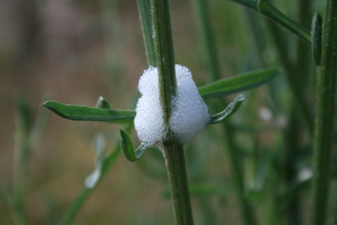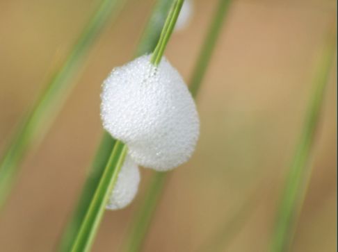 La larva genera la masa de espuma metiendo aire en un fluido que segrega y vive en su interior, lo que le da cierta protección frente a los depredadores