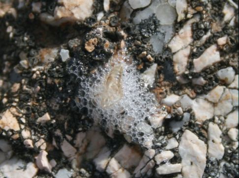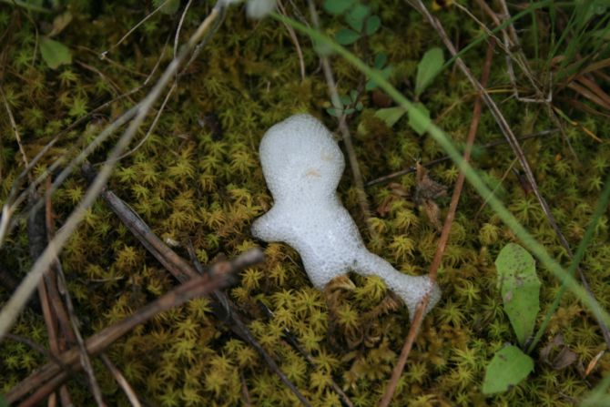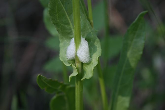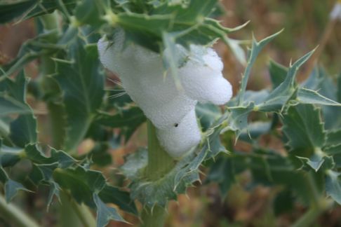 Los llamados «salivazos de cuco» son los nidos de espuma de las ninfas de diferentes especies de Homópteros de la familia Cercopidae e incluso de los de la emparentada familia Aphrophoridae. Durante el desarrollo de los insectos, hay un estado que es el de ninfa, y que corresponde al estado intermedio en la metamorfosis del insecto entre el de la fase larvaria y la de adulto. (Todos hemos visto alguna vez cuando un gusano está dentro del capullo que forma el animal para padecer la metamorfosis, está en el estado de ninfa). En las fotos que siguen se ve el salivazo producido en dos tipos distintos de plantas, siendo la de la izquierda un abremanos y la de la derecha el cardo corredor o setero dicho más arriba. |