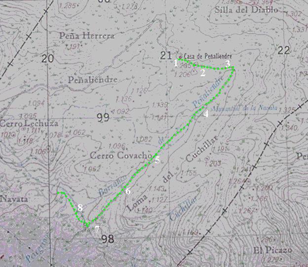 con otros, y casi siempre en terrenos del término municipal de Moralzarzal. Para llegar a Peñaliendre, se pueden ver las rutas descritas en esta web como la R5, ruta de Moralzarzal a Peñaliendre, o la ruta R9, que describe como se va desde Canto Hastial también a Peñaliendre. Para hacer esta ruta, desde el punto donde se encuentra la casa y el mirador de Peñaliendre, conocido normalmente por "EL MIRADOR", se camina en dirección hacia el Este y se comienza a bajar por un sendero en el que hay que tomar la precaución de no resbalar en las zonas arcillosas o donde las rocas están cubiertas con arena. ![]() ![]() foto 1 foto 2 La vegetación por aquí es la misma que en casi toda la zona, pudiéndose ver plantas de cantueso, romero, escabiosa, dragón amarillo, jara de ládano, perpetuas, ... y según se va bajando, si se echa la mirada a la derecha se ven algunas bardagueras en un barranco por donde discurre el agua que va a desembocar en el arroyo de Peñaliendre. De frente se ve la Loma del Cuchillar, terreno de Moralzarzal, una zona que está completamente salvaje y que no permite el paso debido a la espesura de la vegetación. En la vertiente opuesta se encuentra el barranco del Cuchillar, barranco entre esta Loma y el conjunto montañoso formado entre otros por el Cerro del Molinillo (en la cima hay marcas de separación de Moral y Hoyo), y la Peña del Buho. Por el barranco discurre el arroyo también llamado del Cuchillar, que vierte sus aguas, más abajo, al arroyo de Peregrinos. ![]() ![]() foto 3 foto 4 Se continúa bajando, se llega a una curva que va hacia la derecha y aquí se pasa sobre el arroyo de Peñaliendre, pudiendo comtemplar plantas de jara de estepa, romero, escaramujo, cañaheja, viéndose enseguida a la derecha un barranco con una chopera. En otoño hay una vista preciosa desde este punto con las distintas tonalidades de colores amarillos y marrones de las hojas de los chopos. ![]() ![]() foto 5 foto 6 En primavera se pueden ver por aquí matas de hipérico, y también zarzamoras. Unos pájaros muy pequeños, que son de color marrón oscuro, casi negros, se ven por entre las matas y lo que más llama la atención es que son muy silenciosos. Se pasa por entre una encina a la derecha y un enebro y bardagueras a la izquierda y un poco más adelante se ven pinos a la izquierda del camino y muy cerca, en la ladera de la Loma del Cuchillar. A continuación viene una zona en la que se pueden apreciar matas de viborera, loníceras, romeros, jara de estepa y chopos a la derecha. En época de verano, se pueden ver cruzar el sendero a lagartijas colirrojas, que se mueven con gran agilidad. Viene a continuación una zona del camino que está muy horadada, es como una cárcava que continúa un buen trecho, y con atención se puede ver una tubería que cruza el sendero, tubería que llevaba el agua del manantial de la Navata a la casa del mismo nombre, casa de la Navata, que hay cerca de la carretera N VI, en la loma del Cerrulén. ![]() ![]() foto 7 foto 8 Sigue el sendero la zona con cárcavas y se encuentra una raiz que cruza el camino, pudiéndose ver retoños de chopo y un frutal. Se pasa por un arco formado por una encina y un chopo y se ve a la izquierda del sendero la base de una columna que hubo allí ¿ para qué ?. Si se sale del sendero hacia la izquierda en ese punto, se puede tomar un poco de agua de la fuente que un tal "SARDINA" construyó en 2002, la que llamó "FUENTE DE LA LOMA DEL CUCHILLAR". En la época primaveral, se pueden ver plantas de cantueso, hipérico, zumillo, jara, romero, tomillo mejorana, zanahoria, cuajaleche, gallocresta, clavelina, ... en fín, toda una representación de la flora de la zona. Se continúa la marcha y se ven a la derecha más chopos y bardagueras, y se oye el murmullo del agua del arroyo de Peñaliendre que va bajando a la derecha del sendero. Después de una zona en que se ve el horizonte más amplio, de nuevo se ve más angosto ![]() ![]() foto 9 foto 10 Ya se abre el horizonte y el camino continúa con una ligera subida, pudiéndose ver, en lo alto, la zona de la curva de Peregrinos de la carretera N VI, la urbanización la Berzoza, y a la derecha se ve la lancha de granito por donde va el sendero que viene a la cascada del Covacho desde el camino que desde Collado Villalba va a Hoyo de Manzanares y la Berzosa, y que se describe en la ruta R6, ruta a la cascada del Covacho. ![]() ![]() foto 11 foto 12 Se empieza a bajar, y fijándose a la izquierda del camino, se ve como una pared hecha de piedra que es lo que sirve de soporte para otra conducción de agua que tambien la llevaba hasta la casa de la Navata dicha anteriormente. Se sigue bajando y a la izquierda se puede ver una gran lancha en la que se puede apreciar como un canal excavado en ella, fruto de la erosión causada por el agua al bajar por el centro de la misma. ![]() ![]() foto 13 foto 14 Un poco más abajo, se llega a un cruce de caminos, de modo que por la izquierda se va hacia Hoyo siguiendo un sendero que va acompañando a la conducción de agua del Canal (conducción que está hoy día en servicio), de frente se puede ir hacia las Bolivas y la Berzosa, y por la derecha se va al destino de esta ruta, la cascada o chorrera del Covacho. Al poco de tomar este desvio, se encuentra enseguida una caseta de la conducción de agua del Canal de Isabel II, se baja un poco y se ve que el sendero se divide en tres ramas que confluyen enseguida y abajo del todo se cruza el arroyo de Peñaliendre. ![]() foto 15 Se sigue un poco más adelante y enseguida está el arroyo de Peña Herrera, que se juntará más abajo de su curso con el de Peñaliendre, formando el arroyo de Peregrinos. Antes de cruzar el arroyo de Peña Herrera, un poco más arriba de su curso, está la cascada y si se sigue el sendero, pasando el arroyo, se encuentra la lancha por donde va el camino hacia Collado Villalba. Es una ruta muy bonita que merece la pena hacer sobretodo en primavera y en oto