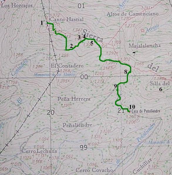 de modo que se comunican unos con otros. Desde la cima de Canto Hastial, se camina en dirección este y se gira a la derecha, apreciándose seguidamente un sendero que cruza una tapia que hace de límite de la zona militar y pasada la tapia, al echar la vista atrás se ve la cima de Canto Hastial. ![]() foto 1 En la parte primera de esta ruta, el camino es el mismo que el descrito en la ruta de Canto Hastial al Covacho, hasta llegar al sendero que sube desde el barranco de Contadero. También se camina un poco por el mismo tramo de la ruta dicha antes, hasta el desvio hacia Peña Herrera. Una vez pasado ese desvio hacia Peña Herrera, se empieza a subir ligeremante, y en tiempo primaveral se pueden ver matas de cantueso, berceo, torvisco, linaria colorada, escabiosas, cañahejas, jara de ládano, globularias, gallium, perpetuas, tomillo de bola, hipérico, ... y al poco se ve de nuevo la tapia que limita la zona militar. ![]() ![]() foto 2 foto 3 Si se mira atrás, se distingue El Escorial, Galapagar, el embalse de Valmayor, y una amplia zona con una vista magnífica. El sendero llega hasta la tapia y se puede ver el cartel que anuncia que está prohibido el paso y un poco más adelante se distingue una roca con manchas de cuarzo lechoso y la alambrada militar. Enfrente de esa roca, a la derecha del camino y a pocos metros, se pueden ver jopos y tomillo salsero, y en el mes de abril, en su época de floración, orquídeas manchadas. Desde la roca manchada, mirando hacia el este, se ve la Pedriza y el embalse de Santillana ... ![]() ![]() foto 4 foto 5 Comienza una bajada y el sendero que va pegado a la tapia, al llegar a una encina se va separando de ella y a la izquierda se ve el cortafuegos que hay al otro lado de dicha tapia, en la zona militar. En esta zona se pueden ver matas de silene colorada y clavellinas. ![]() ![]() foto 6 foto 7 A continuación viene una bajada más pronunciada que llega hasta una torrentera, discurriendo por entre berceos que van formando un arco con sus cañas, y una zona de piedras sueltas entre romeros y jaras. Se llega al punto más bajo, donde la torrentera, se gira a la izquierda y empieza una subida , y el camino de ve erosionado por el paso de excursionista en moto. Cuando se alcanza la parte alta se alcanzan 1297 m. de altitud y al empezar una nueva bajada, el sendero va hacia la izquierda y cuando gira hacia la derecha se puede ver de frente la Silla del Diablo. A la izquierda del camino se ve de nuevo la tapia, y si se echa un vistazo desde ella, se ve abajo un campo de tiro de uso militar. ![]() ![]() foto 8 foto 9 Comienza de nuevo una bajada bastante más pronunciada, y en seguida, al lado de unas lanchas de granito, se vuelve a ver la tapia de separación de la zona militar. En la época primaveral, se pueden ver plantas de cantueso, zumillo, berceo, dragón amarillo, escabiosa, lechuga silvestre, cerraja lanuda, romero, sombrerillo (umbilicus heylandianus), ... y al poco se desemboca en un sendero, viendo de frente un enebro, una encina y un rosal silvestre. ![]() ![]() foto 10 foto 11 Este sendero es el que viene, por la derecha, desde el camino que va de Villalba a Hoyo y la Berzosa, y por la izquierda se va a la casa y el mirador de Peñaliendre. Y desde aquí, el camino hasta la casa y el mirador se puede ver en la descripción de la ruta R5, ruta al mirador de Peñaliendre. ![]() foto 12 Y en el mapa que se da a continuación, se puede ver el camino seguido, que es bastante corto (3 km. más o menos) y sin apenas dificultad, bajando desde 1345 m. hasta 1185 m. Y seguidamente se muestra un plano del recorrido y los puntos desde los que se hicieron las fotos mostradas en las líneas precedentes. ![]() |