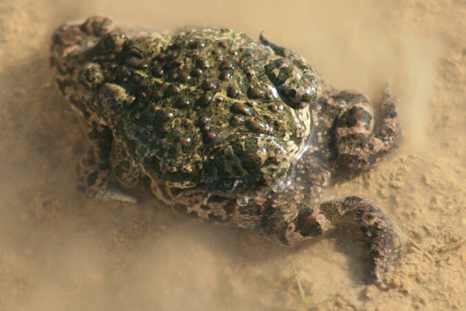 nos rodea y hay veces que es esencial pararse para fijarse en cualquier cosa que se mueva. Una mañana de esas que se coge con gusto el caminar, me fui hacia el Portillo de la Mina y después de pasar por un camino que cruza el arroyo Arenero tomar un desvio de ese camino forestal-cortafuegos que hay en la zona del Guijo, dentro del campo de maniobras del Palancar, enfilaba la subida hacia dicho Portillo, teniendo a la vista los restos de los edificios que hay allí, cuando noté que mis pies se hundían y las botas se cubrían de barro en una zona muy húmeda y en ella había varias charcas. Subí a la zona donde se encuentra una tapia y se hallan las cruces que hacen de mojón de separación de Moralzarzal y Collado Villalba y estuve observando el hermoso espectáculo que desde allí se presenta a los ojos del que se decide ir a ese lugar. Al regresar pasé de nuevo por la zona húmeda y me fijé en una de las charcas, viendo un sapo que me pareció muy abultado y observando con más atención, vi que era una pareja con el macho encima de la hembra y en el acto de la cópula. Como resultado de ello, me prometí a mi mismo que tenía que volver todos los fines de semana que pudiera para ver el resultado de esa unión y así lo hize a partir de ese primer día en que observé ese espectáculo, que era el 26 de febrero de 2011. Para ver las distintas fases que se sucedieron del desarrollo de ese pequeño anfibio, volví prácticamente cada semana hasta el mes de junio, exactamente hasta el día cuatro y en el transcurso de mis visitas vi sucesivamente un gran número de cordones de puesta con cientos de huevos cada uno, luego vi que se cubrían esos cordones con una especie de masa gelatinosa, vi larvas como una masa sin distinción de formas, luego ya con su cola para impulsarse, con esa cola y las extremidades posteriores que iban desarrollando, hasta que conseguí ver a los diminutos especímenes que se movían por tierra huyendo de mi presencia e incluso nadando en las aguas de las charcas, pero vamos a ver un poco de las características de estos anfibios. El sapo corredor es un anuro, palabra que significa animal sin cola y también en otra acepción, se dice de los batracios que tienen cuatro extremidades y carecen de cola, como se puede ver en el diccionario de la Real Academia, a diferencia de los urodelos que si tienen cola en su fase adulta, como las salamandras, gallipatos y tritones, es decir los anuros, cuando acaban el ciclo de su metamorfosis y dejan de ser renacuajos pierden su cola, somo son ranas y sapos. Los sapos, a diferencia de las ranas, son más robustos y más pesados que las ranas, que son más ágiles y de cuerpo más estilizado y esbelto que los sapos, siendo éstos de costumbres más terrestres y normalmente los adultos suelen estar alejados del agua, no así las ranas que son de hábitos más acuáticos. Los sapos tienen la piel bastante más áspera y rugosa que las ranas y para desplazarse caminan en lugar de saltar. El abrazo o amplexo que realizan macho y hembra al aparearse (amplexus) se hace de forma que el macho sujeta a la hembra por las axilas o por la zona de la ingle y en este caso del sapo corredor se ve que es axilar en la primera de las fotos que siguen más abajo. Los huevos los depositan las hembras en el agua en forma de cordones, y las dimensiones y formas son diferentes según cada familia o especie y en el sapo corredor se ve que cada huevo se encuentra envuelto por una cápsula gelatinosa que se dilata al tener contacto con el agua, aumentando de volumen con el fin de proteger al embrión que alberga en su interior y así proteger al que en poco tiempo llegará a ser renacuajo. En la época de la reproducción la llamadas sonoras de los machos (las hembras no cantan), hace que éstos y las hembras se reunan en el agua, acoplándose de esa manera característica, abrazándose el macho a la hembra (generalmente más grande que el macho), sujetándola inmediatamente por debajo de las axilas de sus extremidades anteriores y en la puesta, los huevos son vertidos al agua sin fecundar, liberando directamente al agua los espermatozoides de manera que se produce la fecundación inmediatamente (vi el agua con ese aspecto turbio como consecuencia de la masa con los espermatozioides). Pasado un par de semanas en el agua, nacen de los huevos las larvas que quedan atrapadas en el interior por esa sustancia gelatinosa hasta que consiguen liberarse unos días más tarde. Las larvas aún no tienen formada la boca y viven de las reservas que quedan en los huevos. Tienen respiración por medio de branquia externas y no se diferencia la región de la cabeza de la del resto del cuerpo. Pasados unos días, con el desarrollo de la boca, se alimentan de materia vegetal y de algas microscópicas y a partir del momento de desarrollar la boca y otras partes del cuerpo, acaban la fase de larva y comienzan la fase de renacuajo, empezando a crecer las extremidades, en primer lugar las patas traseras y a continuació las delanteras. Una vez ya tienen las extremidades posteriores se hacen más carnívoros, cambian la alimentación y cuando les crecen las extremidades anteriores comienza a reducirse la cola hasta que la pierden. Pasa de la etapa de renacuajo a la de adulto y en este periodo, el sapo abandona la respiración branquial y adquiere la respiración pulmonar, ya definitiva, el renacuajo se ha transformado mediante la metamorfosis en un sapo. El sapo corredor pertenece a la familia de los bufónidos, familia de ejemplares con cuerpo robusto y pesado, de piel rugosa y con unas gándulas parótidas grandes que están situadas por detrás de los ojos y excretan una sustancia irritante, el veneno de la piel. Los sapos de esta familia presentan patas posteriores cortas con los dedos libres y poco palmados. Se desplazan caminando y sin dar saltos, siendo esta familia la representante de los sapos y este caminar es el sistema de locomoción que má,s utilizan. Un ras