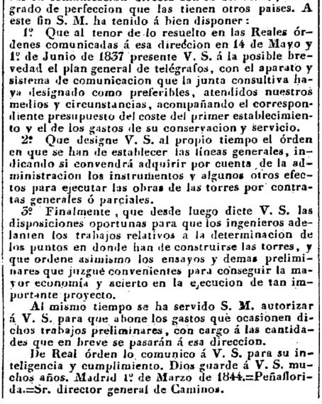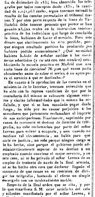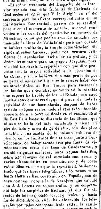 ..... En el Semanario pintoresco español de 16 de mayo de 1841 se puede leer que hasta el de 1831 no vimos en España una línea telegráfica regularmente organizada. En el mes de abril de aquel año se estableció por orden del rey Fernando VII la de Madrid a Aranjuez, que constaba de cuatro puestos y en el siguiente, la de aquella al real Sitio de S. Ildefonso que tenía uno más. El teniente do navio D. Juan José Lerena, fue nombrado su director, y bajo un sistema de su invención, ..... trabajaron hasta el año de 1835, en que la guerra civil, que todo lo devoraba, absorvió también los telégrafos de los Sitios. Otro artículo de prensa en el que se ven los elogios a Lerena, es el aparecido en el Semanario Pintoresco Español de 23 de mayo de 1841 con la rectificación enviada al Semanario por José María Urbina, Manuel Montero, Ramón Trujillo, José Velasco Dueñas y José María Mathé sobre información aparecida anteriormente, lo cual se puede leer aquí abajo, y además se dice de un telegrama recibido de noche. ![]() En la edición del jueves 15 de agosto de 1835 de la Revista Española aparecen los estados de cuentas correspondientes a 1831, 1832 y 1833 con las cantidades recibidas por la Dirección de los Telégrafos y las cajas de su procedencia, como Loterías, el Real Tesoro, etc. y también la inversión de esas cantidades especificando gastos de construcción, entretenimiento y sueldos, correspondiendo al apartado de construcción el costo en su totalidad de las torres y edificios donde están colocados los telégrafos, incluyendo máquinas y enseres. Se trata de la torre de la capital, y las de los sitios reales de Aranjuez y El Pardo, el edificio construido de nueva planta en el Real Sitio de San Ildefonso y las torres intermedias de "siete picos" en lo alto del puerto de Navacerrada, "del Hoyo en la sierra de Colmenar", de los Ángeles en la ermita, y la de Espartinas. Todo ello lo firma en Madrid el 8 de agosto de 1835 Juan José de Lerena. Hoy día estamos acostumbrados a que los presupuestos de las obras se sobrepasen crecidamente y también sucedía en tiempos de las obras telegráficas de la época de Lerena, y así se ve en un artículo aparecido el domingo 13 de diciembre de 1831 en la Revista Española donde se trata de las exposiciones dirigidas al Ministerio "de lo Interior" por el Sr. Lerena, director que fue de telégrafos, expresando que aparecen desfigurados varios hechos que conviene rectificar, que aparecieron en un artículo inserto en la Revista Mensajero del 7 de diciembre de ese mismo año. Se dice de fondos gastados en la línea de Valladolid y entre otras cosas aparece que después de haber gastado 175.000 reales, el resultado obtenido consiste en una torre edificada en el Camino Real de Castilla a bastante distancia de Las Rozas, que aún no se ha acabado, "con dos pisos de tabla y una azotea de lo mismo cubierta de plomo". También aparece mencionada la torre de Torrelodones y otra que es la del "León de Guadarrama". Y sobre lo dicho de excederse en las cantidades previstas en los presupuestos, en el artículo se ve que el cálculo de Lerena para las obras de la torre de Aranjuez, 70.000 reales, que se emprendió bajo los auspicios del que fue director de Loterías, Estefani, costó 171.579 reales. También dice que hasta finales de 1834 han absorbido los telégrafos por todos los conceptos desde 1831 la cantidad de 1.141.063 reales. Asimismo se habla del cese de Lerena y dice que "el gobierno puede administrativamente separar de su destino a un empleado cuando conviene al mejor servicio", y también aparece que S M. está satisfecho del celo y adhesión manifestada por el Sr. Lerena y del deseo de que "su invención telegráfica se perfeccione influyendo en beneficio suyo y del Estado". Y seguidamente se puede ver parte de ese artículo aparecido en La Revista Española de diciembre de 1835. ![]() ![]() A partir de 1840, la telegrafía registró otro nuevo impulso y hubo un real decreto de marzo de 1844 relativo al establecimiento de un nuevo trazado de la red de telegrafía óptica con un proyecto tan ambicioso como pretendía unir Madrid con todas las capitales de provincia y además de citar como uno de los máximos responsables a José María Mathé, también se establecían las condiciones que habían de cumplir las líneas, la distancia entre torres y se definían las tres primeras líneas a construir. La Gaceta de Madrid con fecha el miércoles seis de marzo de 1844 da a conocer una nota del ministerio de la Gobernación en la que se dice que : Decidido el gobierno de S.M. a procurar por cuantos medios están a su alcance el afianzamiento del orden público, para que los pueblos puedan disfrutar los beneficios de una administración paternal y previsora, ha reunido los fondos necesarios para establecer las líneas telegráficas por cuyo medio deberán quedar todas las capitales de las provincias y puntos notables de las costas y fronteras en comunicación directa con la del reino, en el grado de perfección que las tienen en otros paises. A este fin S. M. ha tenido a bien disponer :... Hace referencia a las reales órdenes dadas en fecha 14 de mayo y 1º de junio de 1837 a la Dirección General de Caminos, comunicando al director general que a la mayor brevedad posible presente el plan de telégrafos con el aparato y sistema de comunicación que la junta consultiva haya elegido, con presupuesto del coste del primer establecimiento y el de los gastos de conservación y servicio, designando el orden para establecer las líneas, la adquisición de instrumentos y otras cuantas cosas más como se puede ver en el recorte de esa nota de prensa de la Gaceta de Madrid que se muestra seguidamente. ![]() y se ve que la nota va dirigida al Sr. Director General de Caminos, que entonces era D. Manuel Varela y Limia, por el ministro de la Gobernación en esas fechas, el Sr. marqués de Peñaflorida, que se llamaba José Justiniani Ramírez de A