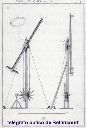 general de la telegrafía. El 19 de julio de 1794, la Convención francesa recibía el primer telegrama de la historia, y en él se anunciaba la toma de las plazas fuertes de Landrecies y Condé por parte del ejército republicano francés, que estaban hasta entonces en manos de las fuerzas austríacas. y fue transmitido desde Lille hasta París a lo largo de una línea de telegrafía óptica de 230 km. con 22 torres, estando situada la última en la cúpula del antiguo palacio del Louvre. Fue Claude Chappe quién en 1790 concibió un sistema de señales ópticas, a través de las cuales y del correspondiente código, se pudieran transmitir carácteres numéricos y alfabéticos a una determinada distancia, y para perfeccionar su sistema contó con la colaboración de un relojero suizo residente en París, Abraham Louis Breguet. El éxito de una primera línea de prueba hizo posible la realización de una completa red de telegrafía óptica en Francia que alcanzó unos 5.000 km. hasta que llegó la telegrafía eléctrica. En España, que no permaneció ajena a la corriente modernista de la época, hubo diversos individuos impulsados por esa corriente los que empezaron a experimentar varios sistemas de telegrafía, y así, desde 1794 se suceden distintos proyectos como los de Ximénez Coronado, que era astrónomo, Salvá y Campillo (médico), Hurtado (militar) y Betancourt (ingeniero). En la Gaceta de Madrid del día 14 de octubre de 1794 apareció la noticia de que D. Salvador Ximénez Coronado, que era profesor del Observatorio Astronómico de Madrid ubicado en el Retiro, había hecho un experimento que resultó con éxito y las pruebas se realizaron entra varios puntos cercanos a Madrid intercambiando mensajes incluso de noche, aunque al parecer lo fundamental de esas pruebas fue el ver el buen comportamiento de los nuevos anteojos acromáticos, pero los puntos elegidos para realizar el experimento fueron el Observatorio del Retiro, el Cerro de loa Ángeles y la cuesta del Arenal en Valdemoro, puntos estos dos últimos que serían elegidos en futuras líneas de la telegrafía óptica. Cuando la invasión napoleónica, las tropas francesas, lo mismo que ocurrió en tantos otros lugares de la geografía española, entraron a saco en el Observatorio haciendo de él uno de sus cuarteles generales y quemaron el telescopio y tiraron los libros, con lo que quedó destruido casi todo, y el propio Salvador Ximénez dijo que fue testigo de cómo toda su vida de logros e ilusiones quedó desmoronada en un instante . El 4 de noviembre de 1794, la Gaceta sacó a la luz un suplemento dedicado totalmente al experimento realizado por el profesor del Observatorio, del que se ve seguidamente parte. ![]() Pero fue Agustín de Betancourt, prestigioso ingeniero militar español, el mayor impulsor de este invento, el cual estuvo en París becado por el rey Carlos III, relacionándose allí con destacadas personalidades de la ciencia y la ingeniería y fue una persona conocida y respetada en ese ambiente, de modo que cuando presentó en París su propio sistema de telegrafía, construido en colaboración con Breguet, fue respaldado de manera que pudo hacerse oir por el gobierno francés, pero como ya estaba allí en funcionamiento el telégrafo de Chappe, no fue aceptado el de Betancourt, que era mucho más rápido, y además el sistema de Betancourt no fue adoptado en Francia, por una razón muy poderosa (tiene su lógica), que fue la oposición del Director General de los Telégrafos Franceses, que era Chappe, el cual ni siquiera se tomó la molestia de informarse del funcionamiento del de Betancourt, cuando el propio Napoleón estuvo muy interesado en que el sistema telegráfico de nuestro compatriota fuera implantado en Francia, pues el emperador tuvo muy buena opinión de él y verlo superior al de Chappe, opinión fundada cuando se produjo la invasión francesa de España. Betancourt vivió en Francia y en Inglaterra y conoció los sistemas que se utilizaban en ambos paises, y con el apoyo del secretario de Estado de Carlos IV, D. Mariano Luis de Urquijo, sustituto de Godoy como primer ministro, consiguió de Carlos IV una Real Orden en febrero de 1799 por la que se aprobaba el proyecto para la instalación del telégrafo óptico en España, proyecto que contemplaba la línea Madrid-Cádiz, contruyéndose por esas fechas el tramo Madrid Aranjuez, que tenía torres en el palacio del Buen Retiro, en el Cerro de los Angeles, Cerro Espartinas en Valdemoro y en el monte Parnaso en Aranjuez, pero debido a la crisis económica la construcción de más tramos sufrió un frenazo considerable. El sistema ideado por Betancourt, que tuvo una valiosa ayuda en el desarrollo de la mecánica del sistema de su amigo Abraham Louis Bréguet, relojero franco-suizo con el que entabló una buena amistad durante su estancia en París entre 1781 y 1784, era bastante diferente del sistema de Chappe, y una mecánica que era mucho más sencilla, y fundamentalmente constaba de un mástil y en su extremo superior había una pieza móvil la cual podía girar, a la que llamaron aguja. Era como un larguero o travesaño a especie de flecha, que disponía en uno de sus extremos un travesaño pequeño perpendicular al larguero y que no disponía de nada en el otro extremo, con lo que era como una T que giraba por el punto medio del larguero. El larguero podía girar 360º, pero el mecanismo hecho por Breguét permitía posicionarlo de manera que girara de 10 en 10 grados, y así podía adoptar 36 posiciones diferentes (a 10 grados una de otra), y con estas 36 posiciones se podían codificar 26 letras y 10 cifras, lo cual daba una amplia gama de posibilidades. La flecha, larguero o aguja la manejaba el torrero desde la base del mástil mediante un volante o manubrio que por medio de un mecanismo muy sencillo de transmisión, a base de correa y poleas, la giraba hasta colocarla en la posición deseada correspondiente al código a trasmitir