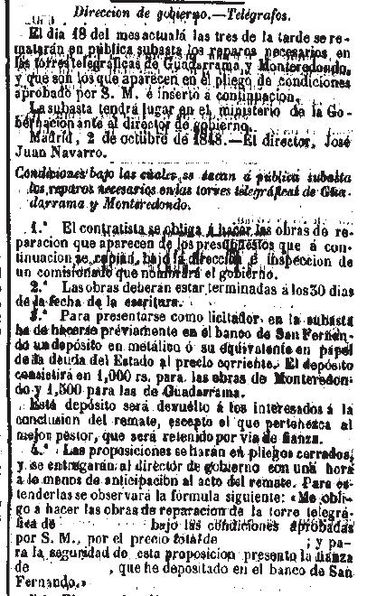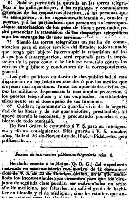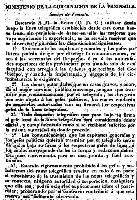 la Gobernación para el uso y explotación de la línea telegráfica de Madrid a Irún. Empieza diciendo : Deseando S. M. la Reina (Q. D. G.) utilizar desde luego la línea telegráfica establecida desde esta corte hasta Irún, sin perjuicio de hacer en ella las mejoras que vaya sugiriendo la experiencia, se ha servido resolver que se observen y guarden las disposiciones siguientes : ... Y sigue diciendo de quiénes podrán dirigir telegramas, quiénes pueden entrar en las torres, de la prohibición a los jefes y subalternos del cuerpo de Telégrafos a revelar en todo o en parte el mecanismo de transmisión de las notas telegráficas y su contexto, que los atentados que tengan como objetivo el interrumpir la transmisión o su interceptación, serán reputados para la imposición de penas, y que la Guardia Civil cuidará de la seguridad de líneas y sus guarniciones, firmándolo el jefe político Sr. Pidal en Madrid a 26 de noviembre de 1846. Seguidamente se puede ver el recorte del artículo de esa prensa de la GACETA de MADRID. |
