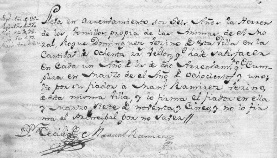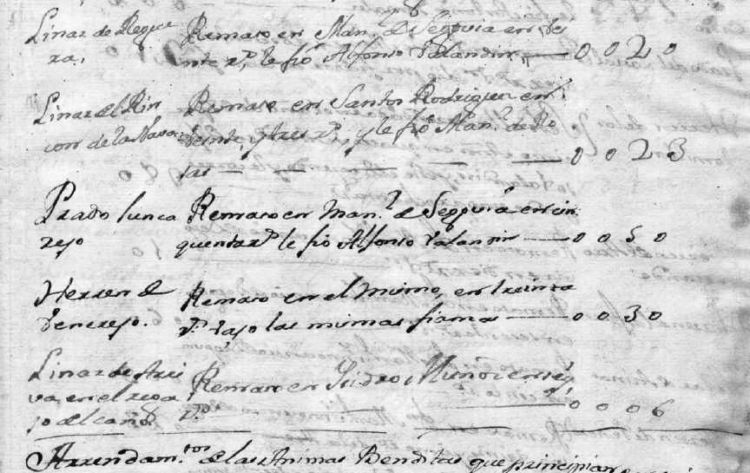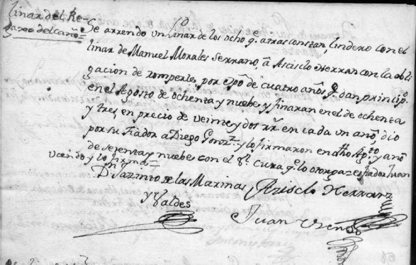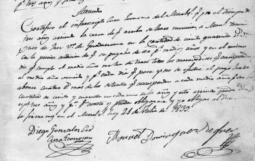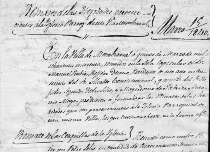país o de una región, lo que se conoce como topónimos. Lo que se pretende con este trabajo es dar a conocer los nombres de los lugares del término de Moralzarzal, su origen y la ubicación en el terreno, y como dice la página web del Ayuntamiento, con ello se persigue "salvaguardar los lugares, nombres, tradición oral y todo aquello que forma parte de la historia reciente no escrita del municipio". En el Archivo municipal de Moralzarzal, se encuentran documentos que nos dan mucha información de los topónimos correspondientes al pueblo, con nombres que se conservan en la memoria y que han sido heredados tras generaciones, y otros nombres que no son recordados, pero que al verse escritos en documentos, nos hablan de su existencia, a pesar de haberse perdido su nombre en el recuerdo y no saberse su ubicación, y eso forma parte de la historia escrita del pueblo, pero que hay que sacar a la luz. Hay un libro, en dicho Archivo, que es la fuente de la que brotan esos topónimos, y se trata del documento ligado a las capellanías y a la Iglesia parroquial de San Miguel Arcángel, conservando muchos de ellos el nombre, a pesar del tiempo transcurrido y los acontecimientos habidos en el pueblo hasta los diversos procesos desamortizadores de los siglos XVIII y XIX. Las capellanías son las fundaciones en la que ciertos bienes quedan sujetos al cumplimiento de misas y otras cargas pías, y también se puede decir que es la fundación establecida por una persona que adscribe algunos de sus bienes al pago de una pensión a un clérigo para que celebre misas u otros cultos en una capilla determinada, y la persona que la lleva, normalmente un eclesiástico, es el capellán, pero en la primera parte de las dos que componen el libro, trataremos las heredades correspondientes a la Iglesia, dejando la segunda parte para las heredades propias de las benditas ánimas o capellanías. Así que en la primera parte de esta página web, trataremos de las heredades propias de la Iglesia, y volviendo a recordar el documento dicho que es fuente de los nombres de lugares del término del Moral, hay que empezar a decir que lleva por título "Libro de Arriendos de las Heredades de la Iglesia Parroquial de San Miguel Arcángel 1762 1842", y se encabeza como Libro de los Arriendos de las Heredades que tienen Comienza diciendo : Arrendamientos de las heredades que son propias de la Ygla Parrochl de San Miguel Arcangel de la va del Moral Zarzal, y empieza â correr desde el primer dia de Marzo de este año de 1762 asta otro tal de 1763 y es como se sigue = Cerca de la Yglesia Remato la Cerquilla de la Igla en Anio. Balandin en trescientos rrs de vn. guardar el vallas, despalotar la cerca, y acense tapias dobles, que se ha de traer la piedra de fuera de la Cerca y se han de echar en este mes de febrero, y de lo contario se obligo â las costas; le fio Simon del Alamo ----- 300 Prado de los rincones Remato el Prado de los rincones en Geronimo Muñoz en ochenta y un rrs de vn. le fio Anio. Balandin ----- 081 Prado de matamoros Remato el Prado de Mata Moros en Antonio Balandin en cinqta y cinco rrs. de vn. le fio Geronimo Muñoz ----- 055 Prado de las herillas Remato el Prado de las herillas en Ysidro Muñoz, en ciento y cinqta. y cinco rrs. de vn. y cerrar de tapia sencilla en este mes de Marzo todo el mediania confinante con el prado Zarraledo le fio Geronimo Muñoz ----- 155 Ocho linares de yerva Remataron los ocho linares de yerva en Josef Rubio en ochenta y nueve rrs. de vn. le fio Eugenio Rubio ----- 089 El linar del Voqueron Esta el linar del Voqueron en Alexo de Bustos en diez rrs. de vn. y lo tiene por este precio cada un año asta el primer dia de Marzo del año de 1765 Le fio Manuel Estevez; consta todo del libro visto de arrendamto. de esta Ygla ----- 010 El linar del Casar Remato el linar del Casar en franco. Ramírez en quatro rrs. de vn. le fio Melchor Estevez ----- 004 El linar de la retuerta Remato el linar de la retuerta en felipe Mân Rubio en dos rrs. de vn. le fio Manuel Mân Perez ----- 002 Pajar de la Yglesia Remato el Pajar de la Yglesia en Manl. de Segovia en treinta y quatro rrs. de vn. le fio Miguel Martin ----- 034 Prado del Arroyo grande se arrienda con el Prado del Zarzal de las animas â qn esta unido; y es la quinta parte de la Yglesia Ocho linares de yerba echo la sexta parte de los ocho linares de yerba Claudio Molero, por lo que remataron en el dho en ciento ocho rrs. de vn. y quartillo le fio Juan Mân ----- 0108 y 8 m^rs Y de este modo se acabaron estos remates en dho dia y año, y para hacerlo constar la firmé Yo el cura = Dn. Agustín Ossorio y Bolaños Siendo este es un ejemplo de los arrendamientos celebrados en el pueblo, este el primero que se ve en el libro antedicho, de las heredades, habiendo visto en el Diccionario de la R.A.E. que heredad es porción de terreno cultivado perteneciente a un mismo dueño, en especial la que es legada tradicionalmente a una familia, y también, aunque ya está en desuso, herencia, y lo expresado en las antedichas líneas de ese documento, es un primer ejemplo de topónimos del pueblo que iremos descubriendo. Siguen otros años, normalmente van correlativos, y en 1763 se arrendaron los mismos que se han visto, y en los años de la década siguiente y hasta 1776, se repiten las heredades en los arrendamientos, pero hay un dato curioso de una heredad arrendada en 1775, y es la que hemos conocido como herrén de la plaza, que se anunció como Herren Junto a la Plaza qe. son del Anivo. y dice lo siguiente : Remataron por tres as. que cumpliran al Agto. deste ao. settenta y siete en Juan Uzendo en precio de doce rs. cada un año, le fio Manl. Herranz, y se obligaron a su paga = Se siguen repitiendo los topónimos por lo que se ve de los arriendos de las heredades, y de la herrén anterior se nombra como herrén del Aniversario y se dice que está arrendada. Aparece un topónimo nuevo en los Remates de las Heredades de la Iglesia de este año de 1
