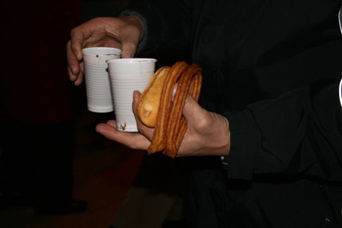 La tradición en el pueblo viene de antiguo y se ve en las actas de algunas sesiones celebradas por los miembros del Concejo, haciéndose constar en ellas las personas elegidas como encargados de ir a por leña y transportarla para la luminaria de la noche de la víspera de la festividad de San Sebastián, y por ejemplo en la de la sesión celebrada el 13 de enero de 1900 consta el nombre de los jornaleros que han de ir a cortar la leña y el de los carreteros que tenían que transportarla a la plaza del pueblo que era donde se prendía la hoguera, constando como jornaleros para la fiesta de ese año Doroteo González González, Pío Prados Maya, Pablo Torres Gómez, Hermenegildo Balandín González, Claudio Segovia Maya, José Gil Miguel y Casimiro López. Los carreteros que constan en el acta son Anastasio González González y Angel González Mazarías, todos vecinos del pueblo y casados el año anterior. También consta en el acta que habrá función religiosa como siempre. En 1901 aparte de los recién casados que irán a por leña, constan como carreteros Julián Balandín Solís y Angel Mazarías Berrocal para el transporte de la misma, y se encarga al Sr. Cura de la función religiosa. Asimismo en 1904 se acordó que siguiendo las costumbres establecidas se celebre la función votiva a San Sebastián como en años anteriores y con objeto de que en obsequio a la memoria del Santo se queme la leña en la plaza pública el 19 del actual se designan como jornaleros a Mariano Sanz González, Anastasio Morales Balandín, Juan Domínguez Tejero, Rafael Redondo Estévez, José León, Víctor de Antonio, Regino Alonso González, casados en 1902 ya que el año 1903, anterior a la luminaria, no se celebró ningún matrimonio en el pueblo y como carreteros Ramón González y Angel González Mazarías (hay 3 jornaleros casados en 1902 y otro en 1901) En 1905 para la fiesta de San Sebastián, se nombran 7 jornaleros y los carreteros Felipe García de Frutos y Manuel Taillet. En el acta de la sesión de 16 de enero de 1909, consta que para la fiesta de San Sebastián se comprarán dos carros de leña del monte del Hormigal que procede de la corta, designando para ayudar a cargar a 5 nuevos vecinos, y los carros de Pascual González Turégano y Federico González González. En 1911 Se encarga como jornaleros a Ambrosio Soriano Segovia y Antonino González Sepúlveda para ayudar a cargar y Pascual González Turégano como carretero que se ha ofrecido, y si éstos no pudieran, se escogerá a otros que elija la alcaldía para que traigan algunos tomillos de la Cañada de la Dehesa Nueva y 30 gavillas que se adquirirán en la Cerca de la Ladera "para elevar al Santo la hoguera de costumbre". En 1923 La leña la cogerán los nuevos vecinos y los carros serán los de Antonio Morales López y Teodoro Balandín Madrid. En el año 1924 los jornaleros para la Luminaria del día 19 serán los nuevos vecinos Pablo y Críspulo Eugenio González Maure, hermanos, Angel Estévez Segovia, Julián Segovia González, Qintín Alcón Carralón, Paz Martín Navas, que era venido de Piedrabuena de Ciudad Real y se afincó en nuestro pueblo, y Víctor Azañedo Quirós, vecino del pueblo aunque proveniente de Las Navas del Marqués y los carros de Celestino Sepúlveda González y Esteban González Morato. Se dice que solo hay presupuesto para leña, no para actos religiosos, y la leña se adquiere de Los Linarejos, de los despojos de la corta. Al decir nuevos vecinos se refiere a casados en esta Villa, naturales de la misma o venidos aquí, casados en el año o dos años antes, o los casados fuera y venidos al pueblo y avecindados en él. Y los carreteros solían ser los que vivían en el pueblo y estrenaban carro, o ponían a trabajar yunta de bueyes o vacas recién domados o eran carreteros casados en el año anterior, aunque esto último era más raro. En la actualidad, la fiesta se celebra acompañada de un vaso de chocolate que preparan las mujeres voluntarias del pueblo, en el que se mojan churros y bizcochos ofrecidos por el Ayuntamiento. En las siguientes fotos se ve a mujeres dando chocolate y bizcochos y en la foto de la derecha se muestran las manos de un "voluntario" que se ha acercado a saborear esa merienda al calor de la lumbre. |