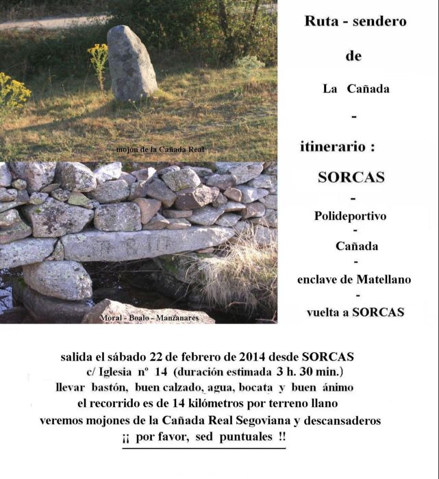 - Ruta sendero de la Cañada y enclave de Matellano - Realizada la anterior marcha con la subida que hicimos por la Chopera y el Romeral hasta el alto del Telégrafo y que fue un poco dura para algunas de las personas que vinieron, ésta ha sido todo lo suave que puede ser el hacer un recorrido por terreno llano, aunque se hicieron catorce kilómetros, que como dijo uno de los senderistas que vinieron, la primera parte fue "cultural" y la segunda fue "deportiva", pues como ocurre casi siempre, alguno de los componentes del grupo ha quedado citado a una hora y hay que caminar rápidamente para poder llegar a la hora comprometida. El cartel que anunciaba esta marcha y que todos pudimos ver en los distintos locales del pueblo donde se expone, es el mostrado seguidamente : ![]() Salimos por la calle Huerta y después de pasar por la plaza de toros, nos adentramos por la dehesa Vieja bordeándola hasta salir por una de las puertas que hay casi enfrente del polideportivo. Nos acercamos a la tapia de la dehesa Nueva por donde hay una puerta junto a la estación de bombeo del Canal de Isabel II que sube el agua hasta el depósito de Herrenes, más arriba del camping, y pegados a la tapia llegamos hasta la zona de la Encinilla, donde está el campo de tiro. Bajamos una cuestecilla y a la izquierda vimos el Cordel de la raya de Moralzarzal con Cerceda, lugar de paso de la antigua trashumancia, que lleva hasta el arroyo de la Villa de Fuentidueña, o arroyo Grande como normalmente se conoce en el pueblo, y junto a él hay una zona amplia que es conocida como Descansadero Abrevadero de Fuentidueñas y Cerrillo de la Encinilla. Siguiendo la marcha, nos encontramos en el camino con unos charcos muy hermosos, debido a las abundantes lluvias habidas días atrás, de manera que tuvimos que ir a la parte izquierda de la Cañada donde hay un camino por el que pueden circular vehículos, y sin charcos. A la derecha vimos el Cordel de la Cerca de la Ladera y la Dehesa, que baja desde la zona del mirador que hay junto a la dehesa Nueva, y enfrente del Cordel, a la izquierda, vimos la Colada de la calle de los enebros. Un poco más adelante vimos a dos pastores guardando su vacada, con las reses pastando en la Cañada, y a la izquierda sale un camino que lleva hasta el río Samburiel, junto al cercano pueblo de Cerceda, que es llamado Cordel del Arroyo Collado. Antes de llegar al hotel de Torrego, como ahora es conocida la casa de los antiguos dueños, los marqueses de Torrelaguna, a la derecha de la Cañada se vió un camino que se llama Camino y Colada del Peñacardil, y a la puerta de la casa de los marqueses nos paramos para contemplar lo hermosa que es y hacernos unas fotos para el recuerdo, mostrándose a continuación una foto de las vacas pastando, aunque una de ellas está ramoneando una encina, y en la otra foto se ve a parte del grupo delante de la casa de los marqueses. ![]() ![]() Enfrente de dicha casa vimos un vehículo en el que venían dos ganaderos por un camino que es el Cordel del Arroyo Collado al Serrejón, camino que da servidumbre a unas cuantas fincas y que llega hasta Hoyo de Manzanares, aunque está cortado con alambradas cuando se pasa el arroyo de la Muela de Roque y se alcanza el campo de maniobras del Ejército de El Palancar. Junto a la casa, a la izquierda, se ensancha la Cañada y ahí se encuentra la zona llamada Descansadero del Chaparral Gordo o Cerrillo de la Cabaña, desde donde sale un camino que va en dirección al río Samburiel, hacia el puente Madrid en la carretera M-607, camino que tiene el antiguo nombre de Colada de los Chaparrales, el cual enlaza con el camino llamado Colada de Navalcaide. Continuando, más adelante se llega a un punto donde se ve mucho más ancha la Cañada, y la parte de la izquierda recibe el nombre de Descansadero de la Paridera del Chaparral Espeso y la parte de la derecha, pegado a varias fincas, una de ellas vallada que se llama Navalcaide, y otra delimitada por una alambrada que es el Chaparral del monte del Marqués, está el Descansadero de la Cañada General de las Merinas o Segoviana, donde paramos para tomar un refrigerio. Seguidamente se pueden ver un par de fotos, en las que se muestra a la izquierda la zona entre estos dos descansaderos citados, y a la derecha junto a una tapia de un prado que hay al lado del Descansadero General, que es donde tomamos un refrigerio. ![]() ![]() Retomadas fuerzas, nos adentramos en una calle llamada camino de la Dehesa, la cual discurre entre distintas fincas, teniendo siempre a la izquierda la de Navalcaide, finca que fue del famoso torrero Domingo Ortega, y en la tapia de esa finca se pueden ver mojones de separación de varios pueblos, zona que tiene una encrucijada de dominios jurisdiccionales. A la derecha se encuentra un terreno mancomunado de Manzanares el Real y El Boalo, que es la Cerca del Escribano, luego otro que se llama el Redegüelo, que una parte pertenece a Moralzarzal y otra pertenece a Becerril de la Sierra y al final de la calle otro terreno jurisdicción de El Boalo, donde se encuentra el enclave Matellano, jurisdicción de Moralzarzal. La Cerca del Escribano perteneció a D. Ángel González Solís, escribano que fue de Moralzarzal, luego pasó a su hijo Aniceto González González por herencia, seguidamente a Rafaela González, hija de Aniceto, y ésta lo vendió a Agustín Torrego, el dueño de la casa del marqués de Torrelaguna. En la calle camino de la Dehesa, que recibe ese nombre por encontrarse al final, a la izquierda, una de las dehesas de Cerceda (Boalo), pudimos ver zonas llenas de endrinos, y en algunos tramos, además de la valla de piedra, hay alambrada, lo cual es un peligro para animales como ciervos, pues saltan de noche y al no ver la alambrada se topan con ella y se producen lesiones. Yo he visto a un venado joven muerto patas arriba al saltar y quedar encajado entre la tapia y la alambrada, y otra vez vi un varetón en el suelo sin poder levantarse, pues 