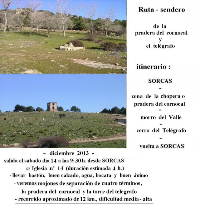 - Ruta sendero de la pradera del Cornocal y el Telégrafo - La marcha tuvo lugar el día 25 de enero de 2014, saliendo, como es habitual, a las 9:30 horas de la mañana desde la calle de la Igesia donde se encuentra SORCAS. El cartel que anunciaba esa marcha y que todos pudimos ver en distintos locales del pueblo, es el mostrado seguidamente, pero con un aviso de celebrarla el día 25 de enero : ![]() La jornada amaneció nublada y con ligera llovizna, a pesar de que las previsiones que se hacían desde la Agencia Estatal de Meteorología decían que no llovería, pero a pesar de todo, al cumplirse la mitad del recorrido, nos lució el sol. Comenzamos a caminar tomando la calle Camino de Alpedrete y fuimos bordeando la finca de reses bravas Los Linarejos, y después de pasar la barrera que hay junto a los prados de las Viñuelas, pasamos el arroyo del Valle y tomamos la pista forestal que sale a la derecha del camino que lleva a la chopera de Villalba y al pueblo de Alpedrete. Empezamos a subir y en una de las curvas que giran hacia la derecha, salimos de ella hasta alcanzar la alambrada que se encuentra a una treintena de metros de dicha curva, y que marca la divisoria de terrenos de Collado Villalba y Moralzarzal, viendo, junto al mojón indicador de monte de utilidad pública MP 117 que hay junto a la alambrada, unas cruces y una M grabadas en piedra nativa, que corresponden a uno de los mojones de la línea de separación de estos dos pueblos. Volvimos a la pista forestal y seguimos subiendo, parando junto a una antigua cantera de granito que fue explotada por el "cebollero" Basilio Sanz González, y vimos, junto al camino, un abrevadero semioculto que los cazadores colocan por distintas partes de los cotos de caza de manera que los conejos tengan agua para poder beber en tiempos de sequía. Seguimos subiendo y vimos almendros a la izquierda del camino al llegar a una curva que gira a la derecha, dejando al frente otra cantera de Basilio Sanz, y llegando a pocos metros de la chopera que hay en la zona de la pradera del Cornocal, nos desviamos a la derecha y pudimos ver 11 cruces y una M grabadas en unas rocas al cobijo de un enebro situado en el cerro del Cornocal, que corresponden exactamente con el mojón M23 que se halla descrito en el acta de amojonamiento de 24 de enero de 1875 celebrada entre representantes de Collado Villalba, Galapagar y Moralzarzal, y que no fue firmada por ningún representante de nuestro pueblo. A continuación vimos en la llamada chopera, los agujeros que tienen hechos pitoreales y pico carpinteros en los troncos de algunos de los árboles que allí hay, los abrevaderos antiguos para el ganado, el manantial de la chopera y una cabaña hecha con troncos de los árboles que han ido rompiéndose. Después se hacieron las fotos de rigor y seguimos el camino, pero aquí abajo se muestran dos fotos, una cuando se subía por la pista forestal hacia la chopera y justo antes de una de las canteras y la otra es la foto de rigor hecha en la chopera o pradera. ![]() ![]() Seguidamente nos desviamos hacia la izquierda y pudimos ver restos de un antiguo corral y lo que queda de una cabaña hecha completamente de piedra que usaban pastores y cazadores y que "graciosamente" los gamberros han derribado. Emprendimos de nuevo la marcha y fuimos ascendiendo en dirección noreste para cruzar el Romeral, que trae muchos recuerdos a los que hace unos cuantos años eran monaguillos y hasta allí iban con el cura a coger ramas de romero por la época de Semana Santa para celebrar el Jueves Santo, y subiendo fuimos viendo más mojones en el risco del Cornocal, donde paramos a tomar unas piezas de fruta, y otro mojón en la zona del Rellano o Lobera, y pudimos ver también una bañera que pusieron los ganaderos junto al manantial del Alto para que sirviera de abrevadero al ganado. En las fotos que siguen, a la izquierda se ve a parte del grupo antes de llegar al Rellano y a la derecha otros integrantes del grupo ascendiendo para llegar ya a una altitud de 1280 metros, en la horizontal de la zona donde se encuentra la Navazuela que se conoce actualmente en el pueblo como Peña Cruces, donde se encuentra el mojón de encuentro de cuatro términos, Alpedrete, Collado Mediano, Collado Villalba y Moralzarzal. ![]() ![]() Ya nos encontrábamos cerca de la cumbre de Cabeza Mediana, pues se avistaba la torre del Telégrafo, y cruzamos la alambrada para tomar la pista que sube desde la zona de Villalba y las canteras que son conocidas como canteras de Alpedrete, para llegar a los pies de la torre telegráfica. Desde allí pudimos deleitarnos con las magníficas vistas y dar las explicaciones oportunas a todo el que se interesó por el funcionamiento de la torre cuando estuvo en su apogeo la telegrafía óptica a mediados del siglo XIX. Siguen dos fotos en las que se pueden ver a integrantes del grupo cruzando la alambrada y en Cabeza Mediana con la torre al fondo como recuerdo. ![]() ![]() Una vez repuestas las fuerzas con esta parada, tomamos como camino de bajada la pista forestal que lleva hasta el pueblo y a la altura de la fuente del Retén, donde algunos bebimos del caño que echa ese agua tan fresca y agradable después de haber hecho esa subida desde los 940 metros, a los que se encuentra la parte del arroyo del Valle, hasta los 1340 de la cima del cerro del Telégrafo, algunos optaron por no seguir la pista forestal y bajar por pendientes del monte, pues tenían prisa por llegar lo antes posible al pueblo puesto que se echaba encima la hora de tomar el aperitivo. Y esta fue la marcha de los doce kilómetros realizada este día, y en la que se salvó el desnivel de unos cuatrocientos metros. |