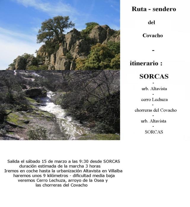 - Ruta sendero de la cascada del Covacho - La marcha tuvo lugar el día 15 de marzo de 2014, saliendo, como ya es habitual y consederando que cuesta madrugar después de la noche del viernes), a las 9:30 horas de la mañana, desde la calle de la Igesia donde se encuentra la sede social de SORCAS. Los carteles que anunciaban la marcha, y que se podían ver expuestos por el pueblo en los establecimientos de costumbre, son como el que se muestra a continuación, y las fotos empleadas corresponden a un alcornoque que hay en lo alto de un risco que da al valle de Peña Herrera, y otra que muestra parte de la zona del arroyo de ese mismo nombre, con el agua discurriendo entre las rocas : ![]() Partimos en dos coches hasta la urbanización Altavista en Collado Villalba, la que está pegada a Fontenebro, entrando en ella por la calle del Cisne, tomamos la primera calle a la izquierda, que es la avenida del Águila y giramos por la primera a la derecha que es la calle de la Perdiz, donde aparcamos los coches. Nada más empezar a caminar por un callejón que hay a la altura del número 248 de esa calle, se sale al campo tropezándonos con una señal que informa que estamos en el Parque Regional de la Cuenca Alta del Manzanares, caminando por un sendero que se llama calle Prado Encinas. El día está precioso, luciendo el sol y sin gota de frío, es de esos días que ni frío ni calor, está muy agradable. Comienza un ligero ascenso, bastante suave, y al cabo de un recorrido de unos seiscientos metros llegamos a la pista forestal que viene por la parte derecha desde la urbanización el Mirador de Collado Villalba, y ahí nos topamos con la tapia de una finca de ese vecino pueblo, y algunos de los senderistas que no conocían el tema, quedaron sorprendidos al ver un avestruz que vino enseguida hacia nosotros para ver si la dábamos algo de comer (fotos de rigor). Esa pista forestal, hacia la izquierda conduce hacia Hoyo de Manzanares, caminando en esa dirección y continuamos subiendo, y al final de la subida, a la derecha vimos una encina junto a la tapia de otra finca, y a la izquierda un camino que lleva hasta una caseta de registro del Canal de Isabel II y hasta un depósito de esa misma empresa, que hay en la ladera de los Horcajos, camino del Portillejo. Continuamos el camino por una zona con alternancia de ligeras bajadas y zonas llanas, y llegamos a un punto donde a la derecha se ve un camino que lleva hasta la casa abandonada de los antiguos guardas de Cerro Mirete. Desde esa zona, a nuestra izquierda y mirando en dirección norte, pudimos contemplar los riscos llamados Castillejos y a la izquierda un camino que lleva, por el valle de Contadero, hasta el alto del Vallejo de la Cierva y Canto Hastial. Seguimos por una zona donde comienza una bajada, a la altura de una caseta de control del Canal, y de frente, en dirección este se ve la gran roca que corona Cerro Lechuza, llegando por esa bajada hasta cruzar el arroyo del Endrinal, el cual recibe en esa zona el nombre de arroyo de la Osea, que aguas abajo cruza la carretera de la Coruña, y que aparece en el Libro de la Montería. En ese punto pudimos ver mojones de la divisoria de Collado Villalba y Moralzarzal, unas rocas con cuarzo lechoso, del llamado Hilo Blanco y a unos cien metros a la derecha vimos el mojón de coincidencia de Collado Villalba, Galapagar y Moralzarzal, descrito en la sección de esta web como mojón que se encuentra junto a fuente Rubia. Seguidamente se muestra este par de fotos, y en la de la izquierda se ve parte del grupo junto a la tapia de una finca contemplando el avestruz, y en la foto de derecha se ve a otros componentes del grupo mirando las cruces del mojón que se encuentra en unas rocas de cuarzo al principio de hilo blanco junto al arroyo de la Osea. ![]() ![]() En ese punto de la marcha hay una bifurcación, y tomando camino por la derecha se va hacia Hoyo de Manzanares y la Berzosa, pero nosotros fuimos por la izquierda, donde el camino lleva hasta el Mirador de Peñaliendre. Pasamos por una zona donde cruza la conducción de agua del Canal de Isabel II y había una barrera para impedir el paso de automóviles y camiones, barrera que han quitado, y cerca de ahí, vimos una roca a la derecha del camino que tenía grabado 1958, que es el año en que pusieron las tuberías de la conducción de agua que llega hasta Hoyo de Manzanares. a la derecha, en la parte alta de esa conducción, vimos el tubo que se usa para descompresión de turbulencias formadas en las tuberías y evitar el efecto de ariete. Continuamos y pasada una zona de cuarzo blanco con mucha piedra suelta, pudimos ver matas de brezo blanco. Siguiendo un poco más, alcanzamos un sendero que cruza nuestro camino, el cual viene de la zona del Romeral que hay bajando desde Peña Herera, y tomando ese sendero hacia la derecha, fuimos hacia el valle de Peña Herrera, por donde baja el arroyo del mismo nombre. En esa zona se ven restos de tiestos de barro cocido de una antigua repoblación forestal y una canalización hecha a base de tubos de uralita que traía el agua desde el manantial del Cuchillar hasta un vivero que había junto a Cerro Lechuza y una casa de la Navata junto a Cerrulén. En esa zona paramos a contemplar el hermoso paisaje que se ve hacia el este, y a la derecha pudimos ver lo precioso que resulta contemplar unos riscos y en la parte alta un hermoso ejemplar centenario de alcornoque que sale de entre las rocas en la parte alta, mostrando seguidamente una foto de ese ejemplar. ![]() Después de gozar de la hermosura de la naturaleza en esa zona, seguimos bajando por una zona con bastante desnivel y ya junto al arroyo de Peña Herrera, llegamos a un punto donde lo cruzamos y ya se ve el objetivo de esta marcha, la cascada o chorrera del Covacho. Cuando cruzamos el arroyo, algunos no pudimos resistir la tentación de beber sus aguas cristalinas y puras de montaña, y en esta época del año es una gozada poder beber agua sin ningún