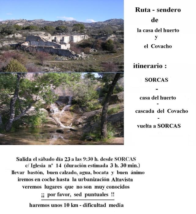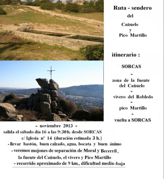 - Ruta de la Casa del Huerto y el Covacho - La marcha se hizo el día 23 de marzo de 2013, saliendo desde la calle de la Iglesia nº 12, donde está SORCAS, a las 9:30 horas. Como siempre, los senderistas fueron recomendados de calzar botas para hacer senderismo, llevar bastón, agua y algún refrigerio. Los carteles que fueron expuestos en los lugares de costumbre eran como el que se muestra a continuación : ![]() El trazado de esta marcha es de una ligera subida y luego de bajadas hasta dar la vuelta para tomar el camino que conduce a las Chorreras del Covacho, que ya se empieza a subir, pero es bastante cómodo y el grado de dificultad es medio, siendo el recorrido es de unos 10 km. aproximadamente. Salimos en coche hasta la urbanización Altavista de Collado Villalba y una vez en la calle de la Perdíz, a la altura del nº 251, tomamos una salida que da al campo y allí mismo hay un cartel que anuncia el parque Regional de la Cuenca Alta del Manzanares. Una vez que comenzamos a caminar, advertí de que veríamos un ave grande pues había plumón pegado a plantas como las jaras y algunos se mostraron incrédulos, pero después de recorrer unos seiscientos metros llegamos al camino que sube desde la urbanización El Mirador de Collado Villalba y arrimándonos a la tapia de la finca con la que te encuentras al llegar allí, pudimos contemplar un avestruz, a lo que los incrédulos dijeron que eso era a lo que me refería con aquello del ave grande. Continuamos caminando y al final de la subida desde que dejamos los coches, a la izquierda vimos un camino y un poco más alto una caseta de control de la conducción del Canal de Isabel II, y siguiendo, después de pasar un camino a la derecha y otro a la izquierda que lleva por el Barranco de Contadero hasta la zona de Peña Covacho del Vallejo de la Cierva y la cara opuesta a la que desde el pueblo vemos de la Peña del Águila, al final de una bajada, cruzamos el arroyo de la Osea como se llama en esa zona el arroyo del Endrinal. A la izquierda, separado un poco del camino, vimos tres cruces grabadas en unas rocas de cuarzo junto a una vaguada, cruces que indican un mojón de separación de Moralzarzal y Collado Villalba, uno de los varios mojones que se pueden ver en la vertiente de aguas llamado Hilo Blanco, veta de piedras de cuarzo que recorre una zona hasta la tapia del polígono militar. Allí mismo, donde ese mojón, encontramos un camino que saliendo hacia la izquierda, es el que lleva a la casa y al mirador de Peñaliendre, y siguiendo por el que llevamos, encontramos otro camino que sale a la izquierda junto a unos pinos, el que también dejamos, y continuando por el camino que lleva a la urbanización La Berzosa de Hoyo de Manzanares, encontramos a la derecha un sendero por el que fuimos hasta darnos con una casa en estado ruinoso, casa de dos plantas que era de Manuel Oliva y Vela, propietario que fue de caballerías de arrastre de los primeros tranvías de Madrid, y al que alguna persona de Moral recuerda cuando iba al pueblo con un coche de caballos a hacer compras. Estuvimos viendo la casa, y después de hacer algunas fotos, tomamos un sendero que saliendo en dirección Este, cruza el camino por el que habíamos venido, y por ese sendero llegamos a la casa de los guardas, viendo primero el manantial del Huerto en una zona donde hay unos cuantos chopos, una casita de piedra que era donde tenían los aperos y herramientas para la huerta y a una explanada donde estuvo el huerto. Siguiendo, enseguida se llega a la casa de los guardas y allí vimos la vivienda, los pesebres de las cuadras con las argollas para atar los animales a los pesebres, y a un lado de la edificación vimos varias construcciones pequeñas que por el tamaño nos dieron la idea de haber sido cochiqueras para los cerdos. A continuación se muestran unas fotos de la marcha, en las que se ve un salón de la casa de Oliva donde se aprecia la boca de la chimenea, y la de la derecha se ve el manantial del huerto que en esta época siempre tiene agua. ![]() ![]() En las siguientes se ven los pesebres que hay junto a la casa de los guardas y algunos de los que hicieron esta marcha junto al arroyo de Peregrinos cerca de donde se juntan el arroyo de Peñaliendre y el del Cuchillar, y donde algunos bebimos agua del arroyo. ![]() ![]() En estas que siguen, aparece parte del grupo caminando y en la de la derecha algunos posando junto a las chorreras del Covacho. ![]() ![]() |