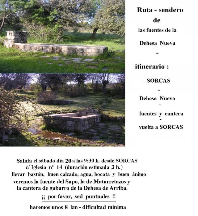 La marcha se hizo el día 20 de abril de 2013, teniendo lugar la salida a las 9:30 horas desde la calle de la Iglesia nº 12, donde está SORCAS. El cartel que anunciaba esa marcha es el que se muestra a continuación : ![]() Tuvimos una jornada con un tiempo muy bueno, y la única pega fue el terreno bastante encharcado. Salimos por la calle de la Huerta y pasando por la plaza de toros, entramos en la Dehesa Vieja, donde vimos muchas flores de narciso de las nieves o de trompeta (Narcissus bulbocodium), y cruzamos la carretera M-608 por el paso subteráneo que hay entre la dehesa y la calle Guadarrama y nos encaminamos a la Dehesa Nueva. La puerta que hay junto a la estación de bombeo del Canal de Isabel II para llevar desde la conducción de la Cañada hasta el depósito de las Herrenes que hay junto al camping, estaba cerrada con un candado y pasamos por otra que estaba trabada con una cuerda, atándola después de pasar. Cruzamos la Dehesa y llegamos hasta la fuente del Sapo, comprobando que por el caño no sale agua, pero si que la hay en el pozo que la recoge para llevarlas hasta la fuente y su pilón, lo que denota que lo que antiguamante hacían los pastores, ahora no lo hace nadie, limpiar los pozos y las conducciones que servían para llevar el agua hasta el caño o el pilón de la fuente, pues los ganaderos no se ocupan de ello ya que tienen otras fuentes con agua del Canal. Proseguimos nuestro caminar y tras ver varios vivares preparados por los cazadores para dar mayor protección a los conejos frente a sus depredadores naturales, llegamos a la fuente de Matarretazos, viendo que, aunque poca, si que salía agua por el caño. Los que llevaban su refrigerio se lo tomaron, y mientras, los otros se dedicaban a coger lupios que había entre las zarzas, siendo dos mujeres las que recolectaron buen manojo con lo que ya había materia prima para hacer una tortilla a la vuelta a casa. Los lupios, como son conocidos en Moralzarzal y pueblos cercanos, reciben denominaciones distintas según los pueblos, como esparraguillas o espárragos de nuez, etc. y son los zarcillos o los tallos jóvenes de la planta trepadora Tamus communis, la cual recibe un buen número de nombres vernáculos en la lengua castellana, según se ve en la información dada por el CSIC (Consejo Superior de Investigaciones Científicas), y aunque es una lista exhaustiva de nombres, la pongo por el interés que puede despertar en muchas personas aficionadas a los alimentos silvestres, así que aquí va la lista : alupios, brionia negra, canduerca, carduenca, corre-corre, cuentas negras, ehpárraguh pihoteru, enredadera, enredaera, espárrago bravío, esparrago fino, esparraguera buena, esparraguera de culebrilla, esparraguera de hilachos, esparraguilla, espárrago, espárrago basto, espárrago bravío, espárrago de bicha, espárrago de caña, espárrago de culebra, espárrago de culebra, espárrago de culebrilla, espárrago de lobo, espárrago de lupia, espárrago de lupio, espárrago de rabiacán, espárrago de revoltina, espárrago de revoltiña, espárrago de sepia, espárrago de uvas, espárrago de zarza, espárrago lupio, espárrago mocoso, espárrago negro, espárrago ortiguero, espárrago ortigueño, espárrago rechinante, espárrago triguero, espárrago zarcero, espárrago zarzalero, espárragos, espárragos bastarderos, espárragos buenos, espárragos chirrinantes, espárragos de bicha, espárragos de caña, espárragos de culebra, espárragos de lobo, espárragos de los malos, espárragos de lupia, espárragos de nuez, espárragos de rabia, espárragos de yedros, espárragos de zarza, espárragos de zorra, espárragos hilachones, espárragos hilachos, espárragos hileros, espárragos hilos, espárragos locos, espárragos pijoteros, espárragos rechinantes, espárragos rochinantes, espárragos silvestres, espárragos zarceros, espárragos zarzaleros, espárraguera, hierba de la mujer apaleada, hilachones, lupio, lupios, nabo caíño, nuerza, nuez negra, nueza, nueza negra, planta de la culebra, rabiacanes, reventones, sello de Nuestra Señora, sello de la Virgen, tamo, tarayo, truca, tuca, uva de lagarto, uva de perro, uva de zorro, uva negra, uva taminia, uvas de can, uvas de perro, uvas del diablo, uvas negras, uvillas de lagarto, vid negra, yedra, yerba raposera, zarzaparrilla. Y cuando estábamos recogiendo lupios, vimos un pedo de lobo con un diámetro de cerca de veinte centímetros y también orquídeas manchadas (Orchis mascula) y testículos de perro o satirión (Orchis morio), a los que hice fotos que se muestran más adelante. Después se siguió campo a través hasta alcanzar la cantera de gabarro o pórfido diabásico que se utilizaba para hacer de firme de carreteras, y pudimos contemplar una barrena de más de dos metros de larga de las que se usaban para hacer los agujeros en la roca y poder poner los barrenos (a base de pólvora como se hacía antiguamente o de cartuchos de dinamita) con lo que al explotarlos volaba y se partía la piedra, barrena que se quedó empotrada y no se pudo sacar; vimos un nido de patos Anade real, de lo que nos dimos cuenta cuando uno de los senderistas tiró una piedra al agua para ver la hondura que había y con el ruido se asustó la pata que estaba incubando y salió volando, Seguimos caminando por la Dehesa hasta llegar a la fuente de la Bardaguera donde vimos corujas y el agua que no salía por el caño que da al pilón, sino que salía de una roca por el suelo. Luego continuamos nuestra marcha yendo paralelos a la tapia que separa la dehesa del camino llamado cordel de la Cerca y llegando al depósito de las Herrenes salimos por la puerta y bajamos bordeando el camping hasta llegar al pueblo donde acabamos nuestra marcha. A continuación se muestran unas fotos de la marcha, en las que se ve al grupo posando junto a un vivar cercano a la fuente del Sapo, que se aprecia en la foto de la izquierda al fondo. En la segunda aparece parte del grupo posando en el 