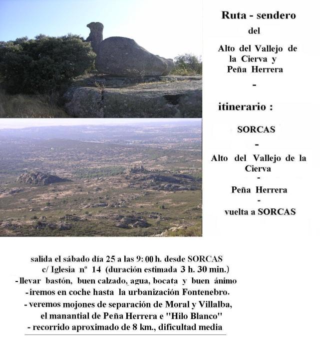 - Ruta del alto del Vallejo de la Cierva y Peña Herrera - La marcha que se hizo el día 25 de mayo de 2013, comenzó partiendo, los once senderistas que nos presentamos a la cita, en tres coches desde Sorcas, punto de cita, en la calle de la Iglesia n 12, donde habíamos quedado a las 9:00 horas de la mañana. Como siempre, a los senderistas se les recomendó llevar buen calzado, bastón, agua y algún refrigerio. Los carteles que fueron expuestos en los lugares de costumbre eran como el que se muestra a continuación : ![]() En los coches fuimos por Collado Villaba hasta la urbanización Fontenebro, y pasada la barrera de control, donde recogimos a otra senderista, fuimos por la calle Arroyo del Osea y luego Mayor de Fontenebro para tomar a la izquierda la calle Peña Tejonera, pero como estaba cortada por obras para colocar nuevas tuberías de abastecimiento de agua, tuvimos que volver por Mayor de Fontenebro y coger de nuevo la calle Arroyo del Osea y subir hasta el final para ir hacia la de Peña Tejonera y encontrar el lugar donde aparcamos los coches. Dejados los coches, comenzamos a subir por una pista ancha y a unos 150 metros, donde se ven unas cárcavas hechas por el agua, a la derecha de la pista tomamos un sendero y empezamos el ascenso. Llegamos a una roca en la que se encuentra una encina nacida en una de las rajas que tiene esa roca y allí hice un alto en el camino para contemplarla y hacer unas fotos, pues el resto parece que tenía prisa por subir y no se enteraron de que parábamos, siguiendo el camino. Continuamos ascendiendo y a los 25 minutos de haber empezado la marcha, alcanzamos un sendero que viene por la derecha subiendo por el Barranco de Contadero y lo tomamos pero yendo hacia la izquierda. El camino era entonces más o menos suave, y nos encontramos en una zona en la que pudimos contemplar la Peña del Águila y la antena de Medio Ambiente de la Comunidad de Madrid de Canto Hastial, y llegado a la línea divisoria de Moralzarzal y Collado Villalba, tomamos un sendero a la derecha que lleva hasta donde se encuentra uno de los mojones de la linde de Moral y Villalba, consistente en un montón de piedras apiladas y cinco cruces grabadas en una lancha de granito, situado en el Alto del Vallejo de La Cierva. Hubo un momento, cuando estábamos sentados en la lancha donde están grabadas las cruces, en el que entre bocado y bocado, Juan, uno de los senderistas nos explicó en qué consiste la organización "El Cenáculo", respondiendo a la petición que le hice para que lo explicara, pues había salido ese nombre a relucir (a mí personalmente, el ver a todos sentados y escuchando la explicación de Juan, me recordó el Sermón de la Montaña), y una vez hechas las fotos de rigor continuamos retomando el sendero que habíamos dejado. Seguimos subiendo y al llegar a una curva hacia la izquierda, tomamos un sendero que saliendo de allí hacia la derecha nos llevó hacia Peña Herrera. En una zona de pasto, nos desviamos hacia la izquierda hasta unas bardagueras o salgueras como dicen otros, y vimos el manantial de Peña Herrera, y continuando por ese sendero avistamos otro lugar con bardagueras donde se encuentra el manantial de los Abantos. Volviendo a la zona de pasto, pudimos ver flores de satirión, una orquídea ibérica conocida también como compañón o testículo de perro, además otras plantas de leche de pájaro. Tomamos el sendero que dejamos para ver los manantiales y empezamos a descender, pasando por una zona de cuarzo, parte del llamado "Hilo Blanco", y en el descenso vimos otros mojones, uno en unas rocas a la izquierda del sendero de bajada, con dos cruces grabadas en una lancha de granito, y al llegar a una curva de 90º a la izquierda, tomamos el sendero llamado camino del Romeral, que baja al barranco donde se encuenta el arroyo Osea, zona anterior a aquella donde se denomina arroyo del Endrinal. Animé a los senderistas a beber agua del arroyo y al principio eran reticentes, hasta que se fueron animando y salvo dos, los demás si que bebimos, agua muy rica según expresiones de algunos. Continuamos el camino de vuelta y a la altura de donde hay una caseta del Canal de Isabel II, tomamos el camino que sale a la derecha y después de pasar por un depósito del Canal y zonas rocosas por donde discurre el sendero, llegamos a donde habíamos dejado los coches y despidiéndonos hasta la próxima y felicitándonos por lo bonito de la marcha, regresamos al pueblo. Vimos plantas como romeros floridos, férulas y cañahejas, linarias, linarias coloradas, valerianas silvestres, enebros secos, otros sanos y algunos con el muérdago del oxycedro, berceos, robles, encinas, peonías, altramuces rosados, amapolas macho, cantuesos, tomillos salseros y blancos, de jaras de ládano en flor, y muchas más plantas que estaban empezando a abrir sus flores. A algunos les llamó la atención ver robles y sobretodo el encontrar arces de Montpellier, pero allí están A continuación se muestran unas fotos de la marcha, en las que se ve al grupo una vez dejados los coches aparcados, y en la siguiente foto se aprecia el grupo caminando junto a la roca con la encina nacida en una raja en lo alto. ![]() ![]() En las siguientes se ve a los senderistas sentados en el mojón del Alto del Vallejo de la Cierva, escuchando las explicaciones de Juan, y a la derecha posando al lado de unas peonías. ![]() ![]() En estas que siguen se ve a los senderistas posando con la Peña del Águila al fondo hacia le centro de la foto, y en la de la derecha van marchando con ese fondo de rocas asemejando un ave, y que bautizamos como "La Pava", la que aparece en el cartel anunciador. ![]() ![]() En las siguientes se ve al grupo por el sendero de Peña Herrera para iniciar el descenso y a la derecha, sentados en una lancha granítica contemplando el paisaje, desde donde vimos el sendero que va hacia la casa de Peñaliendre y el Mirador y a una hilera humana formada por otro grupo de senderistas