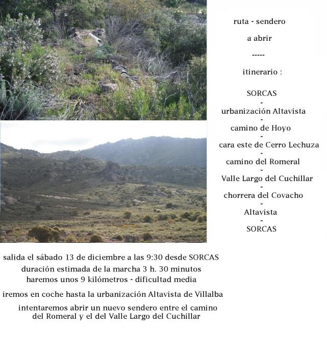 Como ya es costumbre, habíamos quedado a la puerta de SORCAS a las 9:30 de la mañana del sábado día 13 de diciembre, y nos presentamos siete senderistas, con una incorporación nueva, José Luis, y para el tiempo que se anunciaba en los medios meteorológicos, fue un éxito y faltaron algunos que se excusaron por tener otros compromisos. Partimos en dos coches, uno de Hermenegildo y otro de Raquel, y fuimos como en otras ocasiones hasta la urbanización Altavista de Collado Villalba, esa que se encuentra pegada a la urbanización Fontenebro, entrando, como es costumbre, por la calle del Cisne, luego la avenida del Águila y seguidamente tomamos la primera a la derecha, que es la calle de la Perdiz, para empezar a caminar una vez dejados allí los coches. Salimos al campo por un callejón que hay entre las parcelas de dos casas y como siempre vimos el cartel anunciando el Parque Regional de la Cuenca Alta del Manzanares, callejón que da paso a un sendero que discurre por una zona llamada calle Prado Encinas. Realizamos la suave subida de un poco más de medio kilómetro que permite llegar a la pista forestal que viene por la derecha desde la urbanización el Mirador de Collado Villalba, y continuando por esa pista que lleva a Hoyo de Manzanares, subimos otro tramo hasta el lugar donde se encuentra un desvio a la izquierda que conduce a un depósito de agua que abastece a esas urbanizaciones, y a unos senderos que permiten pasar por el Portillejo hasta la parte de atrás de la zona de Canto Hastial. A la derecha de ese desvio, se encuentra una encina que da las bellotas dulces y a veces he comido como aperitivo en el camino de vuelta. Continuando la marcha pasamos por una zona en la que se alternan ligeras bajadas y zonas llanas, y a nuestra izquierda pudimos contemplar los riscos de Castillejos y siguiendo pudimos ver también a nuestra izquierda el sendero que lleva hasta el alto del Vallejo de la Cierva y la zona de Canto Hastial, sendero que sube por el barranco de Contadero. Continuamos por una bajada que comienza cuando se alcanza a la derecha una caseta de control del Canal de Isabel II, y yendo en dirección este ya pudimos apreciar la hermosa roca que se alza en la parte alta de Cerro Lechuza, y al final de la bajada cruzamos el arroyo de la Osea, nombre con el que es conocido en ese tramo el arroyo del Endrinal, que aguas abajo se encuentra en el límite entre Galapagar y Collado Villalba para luego cruzar la carretera NVI. Como en otras ocasiones, y ya que dos de los senderistas de este día no conocían la zona, nos desviamos una treintena de metros a la izquierda hasta llegar a unas rocas con cuarzo, pertenecientes a la veta de Hilo Blanco, para ver las tres cruces que están grabadas en ellas y que son un mojón de la divisoria de Collado Villalba y Moralzarzal, y a unos cuantos metros a la derecha vimos una piedra clavada en el suelo que es otro hito o mojón de separación de estos dos pueblos, muy cerca del manantial llamado fuente de Cabeza Rubia. Volviendo al camino que llevábamos, allí mismo hay una bifurcación, y tomamos por la izquierda el camino que conduce hasta el mirador de Peñaliendre, ya que por la derecha conduce hasta Hoyo de Manzanares, y caminando un poco más de medio kilómetro y una vez pasado el sendero que por la derecha lleva hasta la válvula de descompresión de la conducción de agua del Canal de Isabel II, que la lleva hasta Hoyo de Manzanares, y la lancha de granito que hay a la derecha del camino con la grabación AÑO 1958 (año de costrucción de la conducción), llegamos a un sendero que se cruza en nuestro camino, sendero que por la izquierda viene bajando desde Peña Herrera y por la derecha va hacia la cascada del Covacho. Tomamos ese sendero por la derecha, y después de una ligera subida, llegamos a la parte alta de Cerro Lechuza en su cara este, comenzamos una bajada y al poco vimos un sendero bastante desfigurado que sale a la izquierda, por el que bajamos y empezamos a ver restos de macetas dejados por los servicios forestales que hace ya unos cincuenta años estuvieros reforestando esa zona, y cruzando un pequeño arroyo, nos adentramos en una zona que es un pequeño bosque de jaras y romeros, que a veces hacían la marcha un poco penosa, hasta que alcanzamos la antigua conducción de agua que desde el manantial de la Navata llevaba, por medio de tubos de uralita, el agua hasta la casa de la Navata que hay cercana a la carretera nacional NVI, casa que se encuentra en término de Moral cerca de la curva de Peregrinos (para otros de Peguerinos). Seguidamente se muestra este par de fotos, y en la de la izquierda se ve a parte del grupo (no sale el que hace la foto, que soy yo) nada máas dejar los coches aparcados a la entrada al callejón mencionado antes, distinguiéndose de izquierda a derecha a Paco, José Luis, Hermenegildo, Raquel, Santiago y Carlos, y en la foto de la derecha se ven, posando junto a la conducción al llegar a ella, a Santiago, José Luis, Raquel, Hermenegildo, Paco y Carlos.