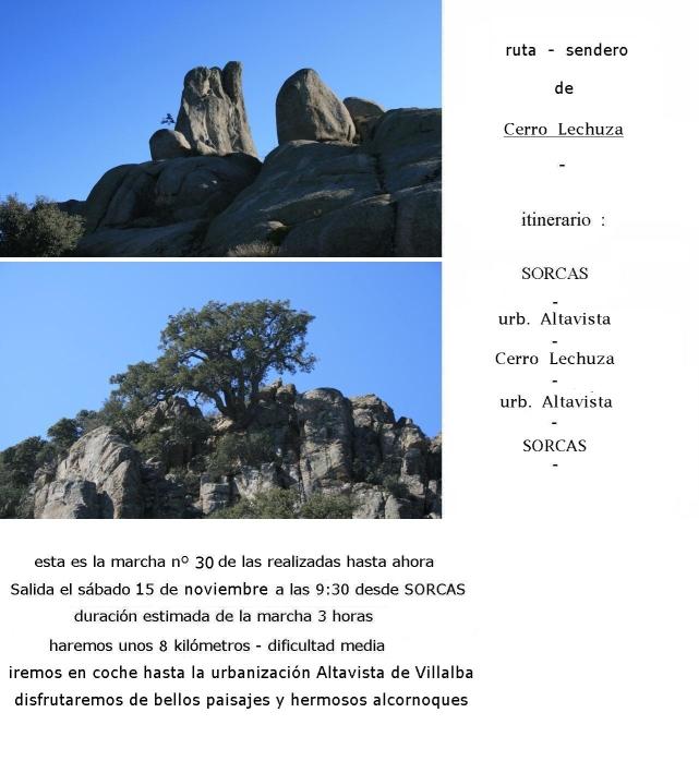 - Ruta sendero de Cerro Lechuza - La salida se realizó, según lo habíamos previsto el, día 15 de noviembre de 2014, y en medio de unos días de bastante lluvia, amaneció una mañana espléndida, fresca pero soleada. Los carteles que anunciaban la marcha los pudimos ver expuestos en los lugares de costumbre, y nos daban una muestra de de los que íbamos a ver en esta salida, cartel con un par de fotos, mostrando en la parte de arriba la gran roca que corona Cerro Lechuza, y en la parte de abajo la foto nos muestra un alcornoque centenario que hay en la cima de una formación rocosa que se encuentra entre la zona de la cascada del Covacho y Cerro Lechuza.