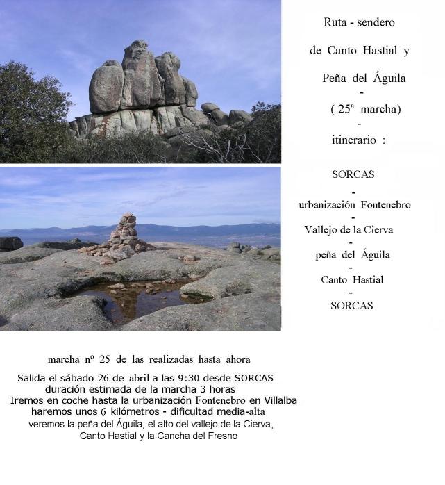 - Ruta sendero de la Peña del Águila y Canto Hastial - La marcha se hizo el sábado día 26 de abril de este año de 2014, estando el tiempo desagradable, pues la noche anterior estuvo lloviendo, pero se hizo a pesar de todo. Cuando el tiempo está de agua, hay pocos voluntarios para hacer marchas, así que solamente fuimos tres valientes los que nos atrevimos a realizarla, la joven Agnès, el veterano Miguel y yo, asimismo veterano. Los carteles que anunciaban la marcha y que pudieron ser vistos por el pueblo en los lugares habituales, eran como el que se muestra a continuación, y en la parte superior se ve la Peña del Águila vista desde la zona sur y en la parte inferior se ve la cima de Canto Hastial con unas piedras apiladas en lo alto.