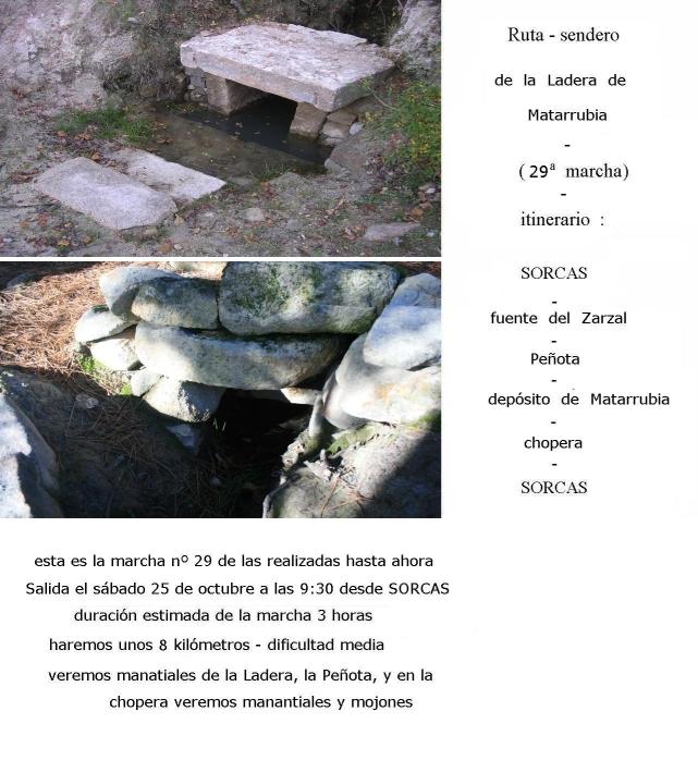 - Ruta sendero de la Ladera de Matarrubia- La salida se realizó en la fecha prevista del día 25 de octubre de 2014, una vez pasado el verano y cuando ya la gente ha dejado de hacer viajes y recorrer otras tierras, aposentándose de nuevo en el pueblo, y nos reunimos 17 personas para realizar esta salida. El día estaba precioso y la temperatura era muy agradable, no parecía que estuviéramos a finales del mes de octubre. Los carteles que anunciaban la marcha y que pudimos ver expuestos en los lugares de costumbre, mostraban un par de fotos, viéndose en la parte superior el manantial del Zarzal, según está actualmente después de su última remodelación, y en la parte inferior se ve otro manantial, el que hay cerca de la conocida desde hace no muchos años como "Chopera", que se encuentra en el macizo de Cabeza Mediana muy cercano al "Romeral".